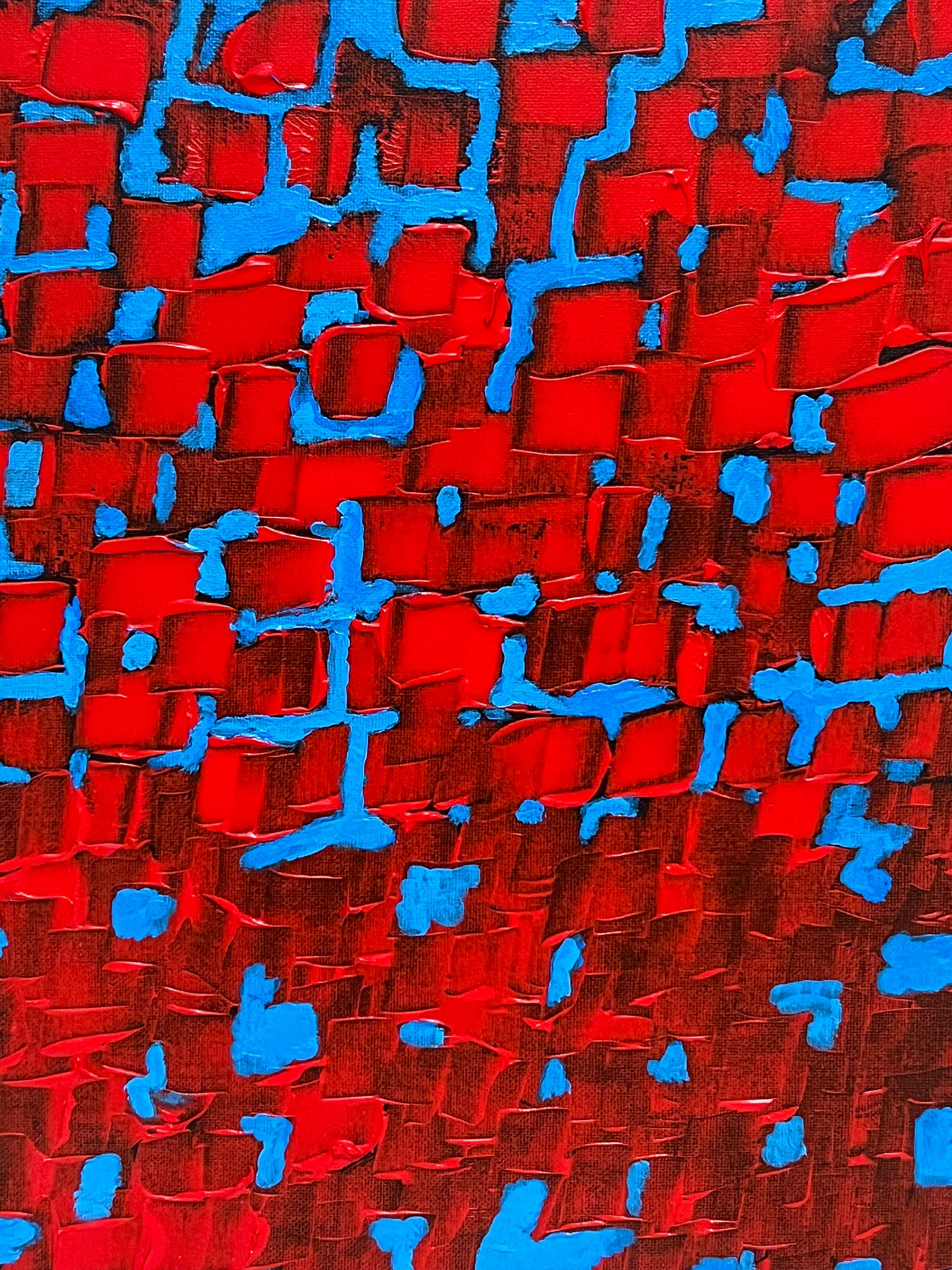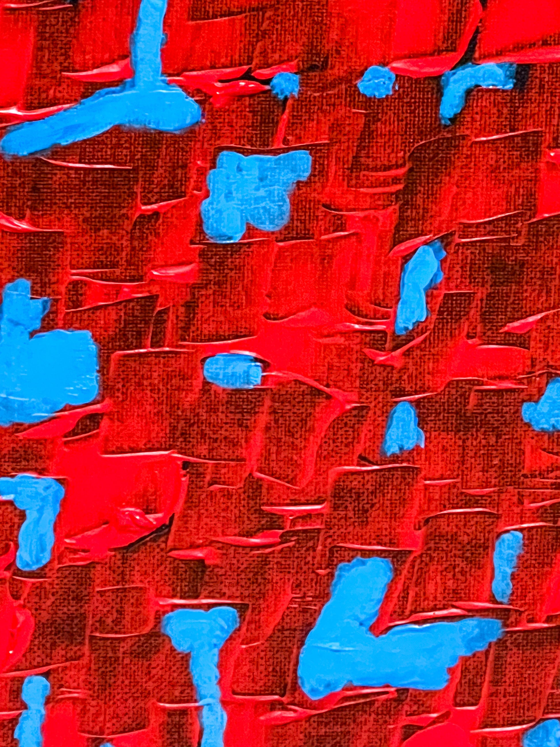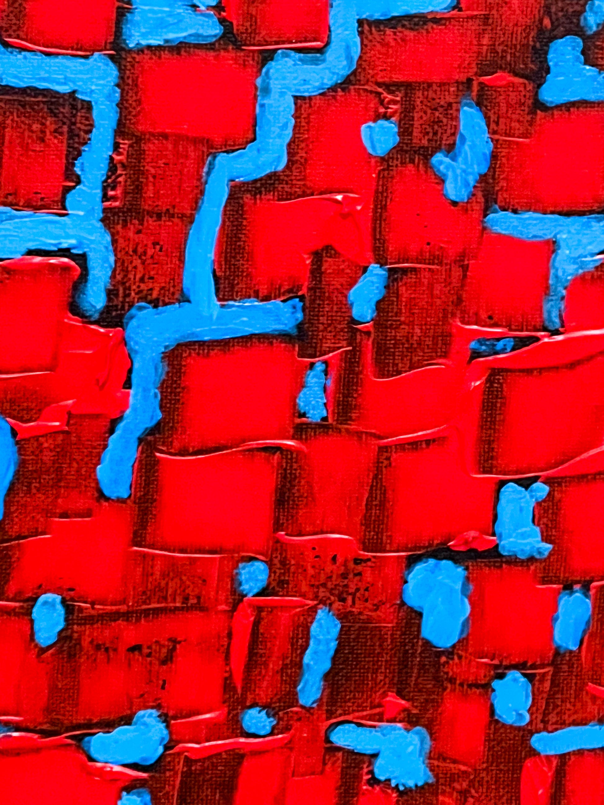 In this vibrant acrylic creation, I played with geometric abstraction and the raw energy of pop art. You can feel the electric surge of symbolism, where blues and reds clash and dance in an expressive tangle, igniting a powerful emotional response. This piece represents breaking through barriers and conventions, perfect for uplifting any space with its dynamic presence.