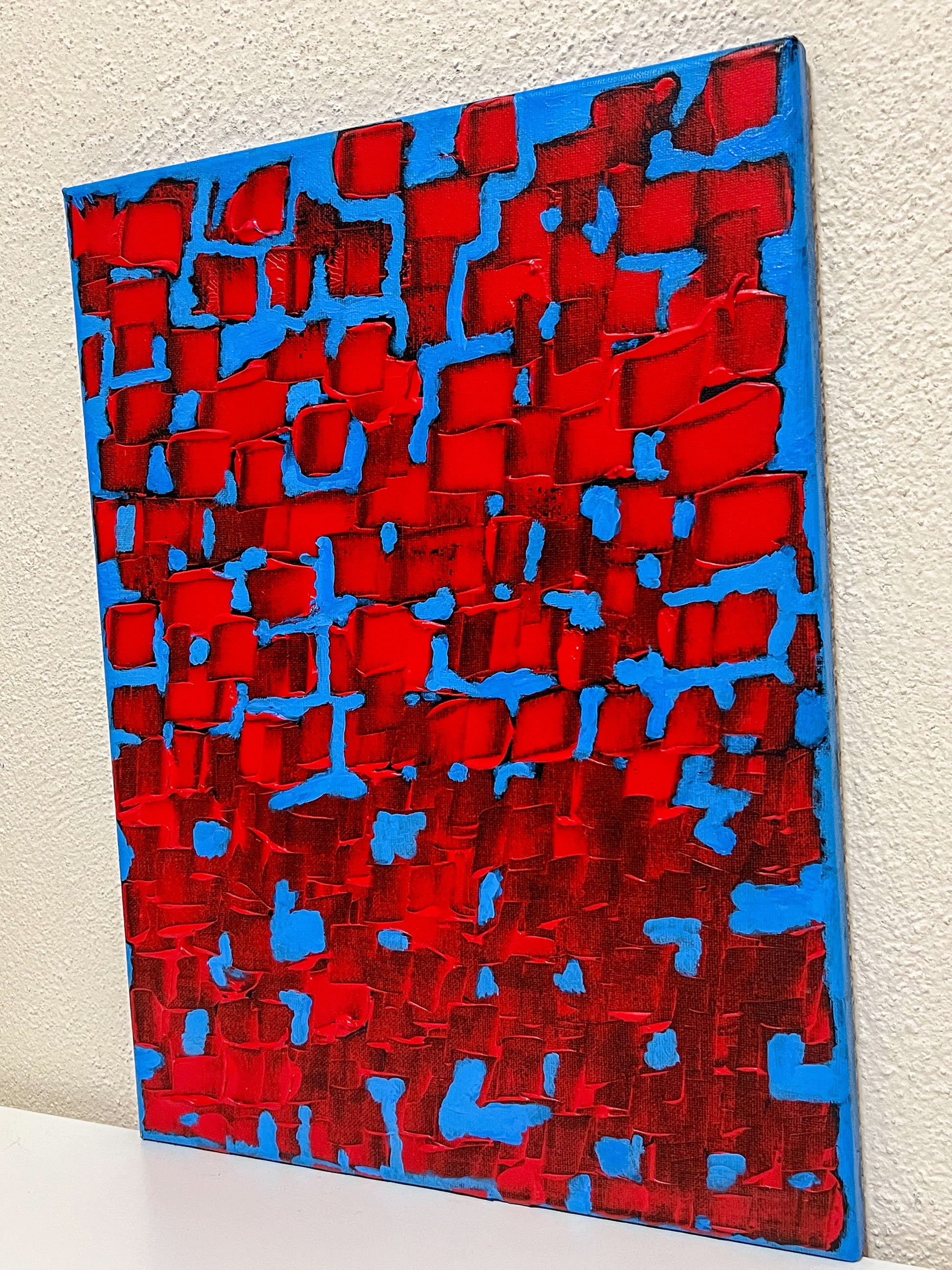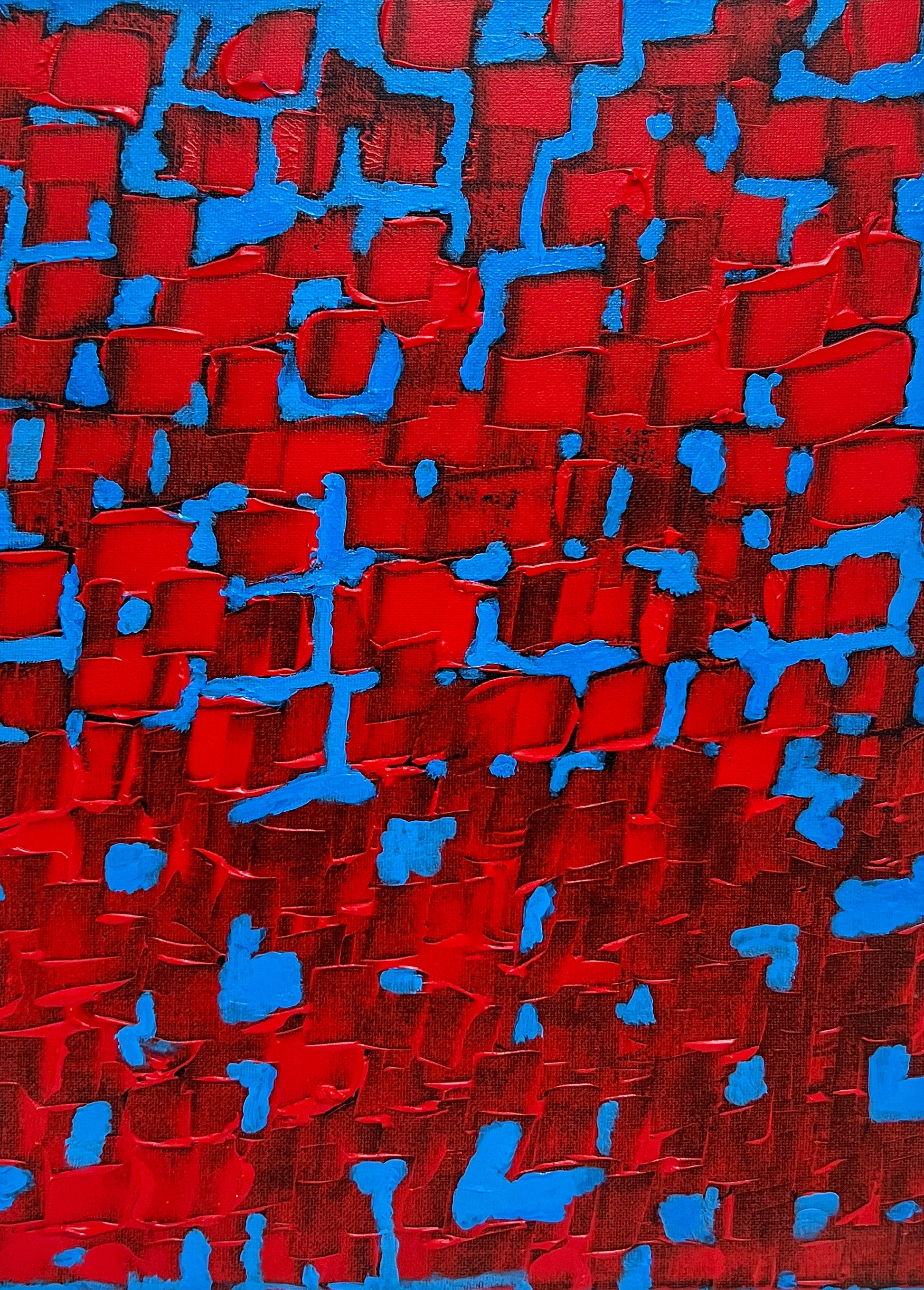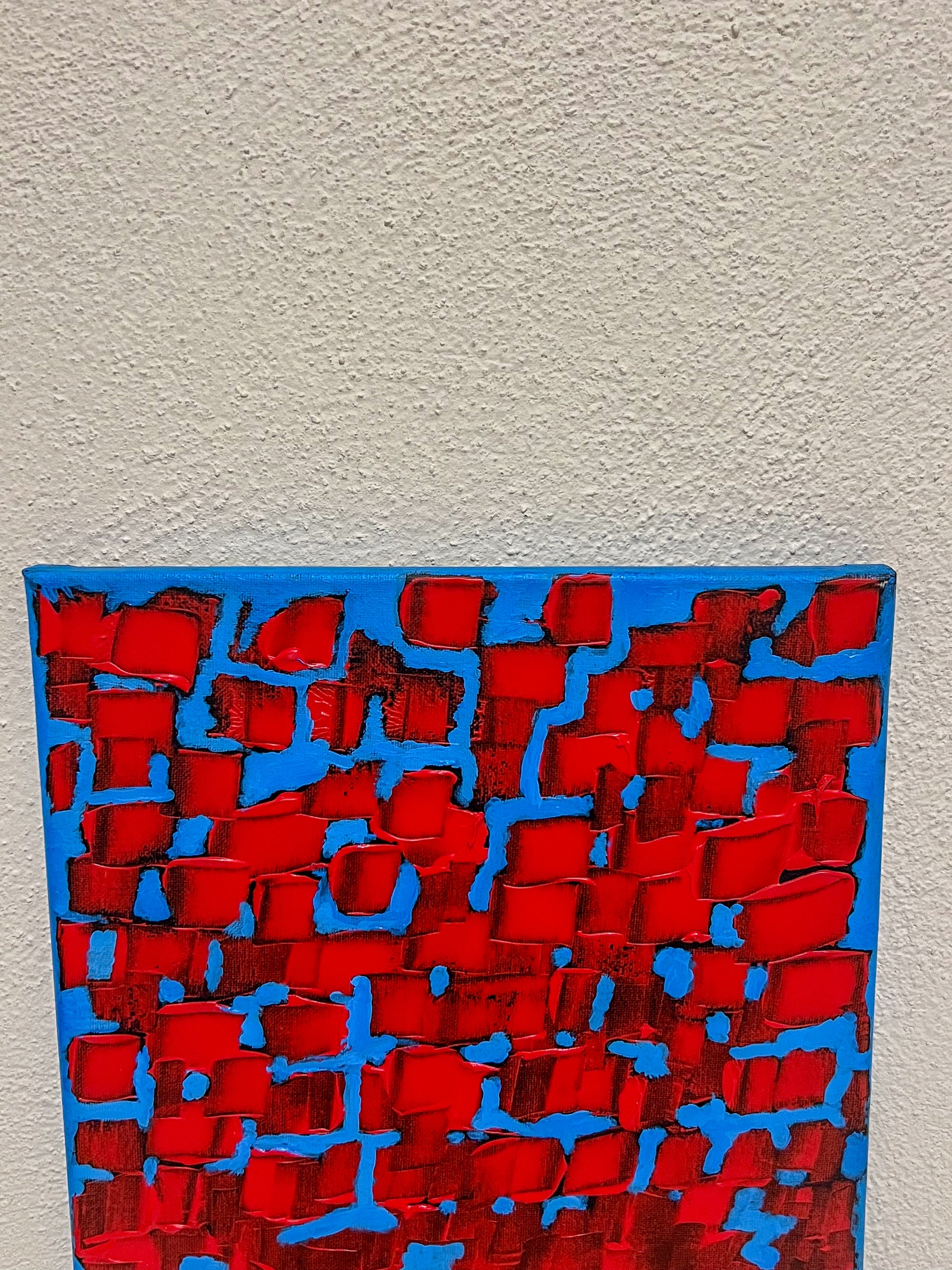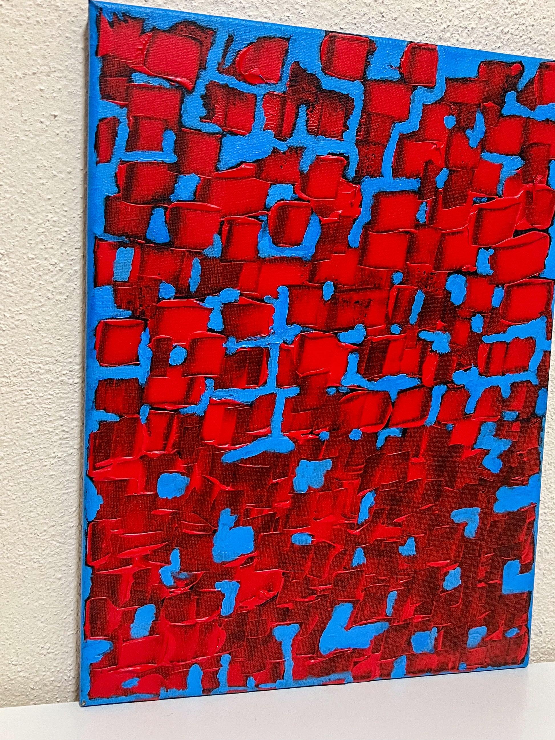 In this vibrant acrylic creation, I played with geometric abstraction and the raw energy of pop art. You can feel the electric surge of symbolism, where blues and reds clash and dance in an expressive tangle, igniting a powerful emotional response. This piece represents breaking through barriers and conventions, perfect for uplifting any space with its dynamic presence.