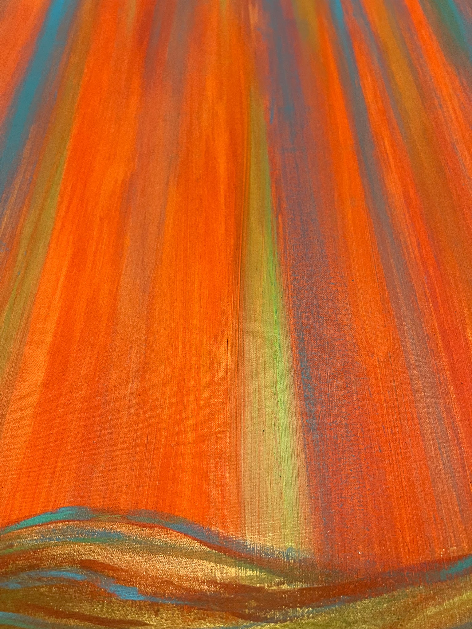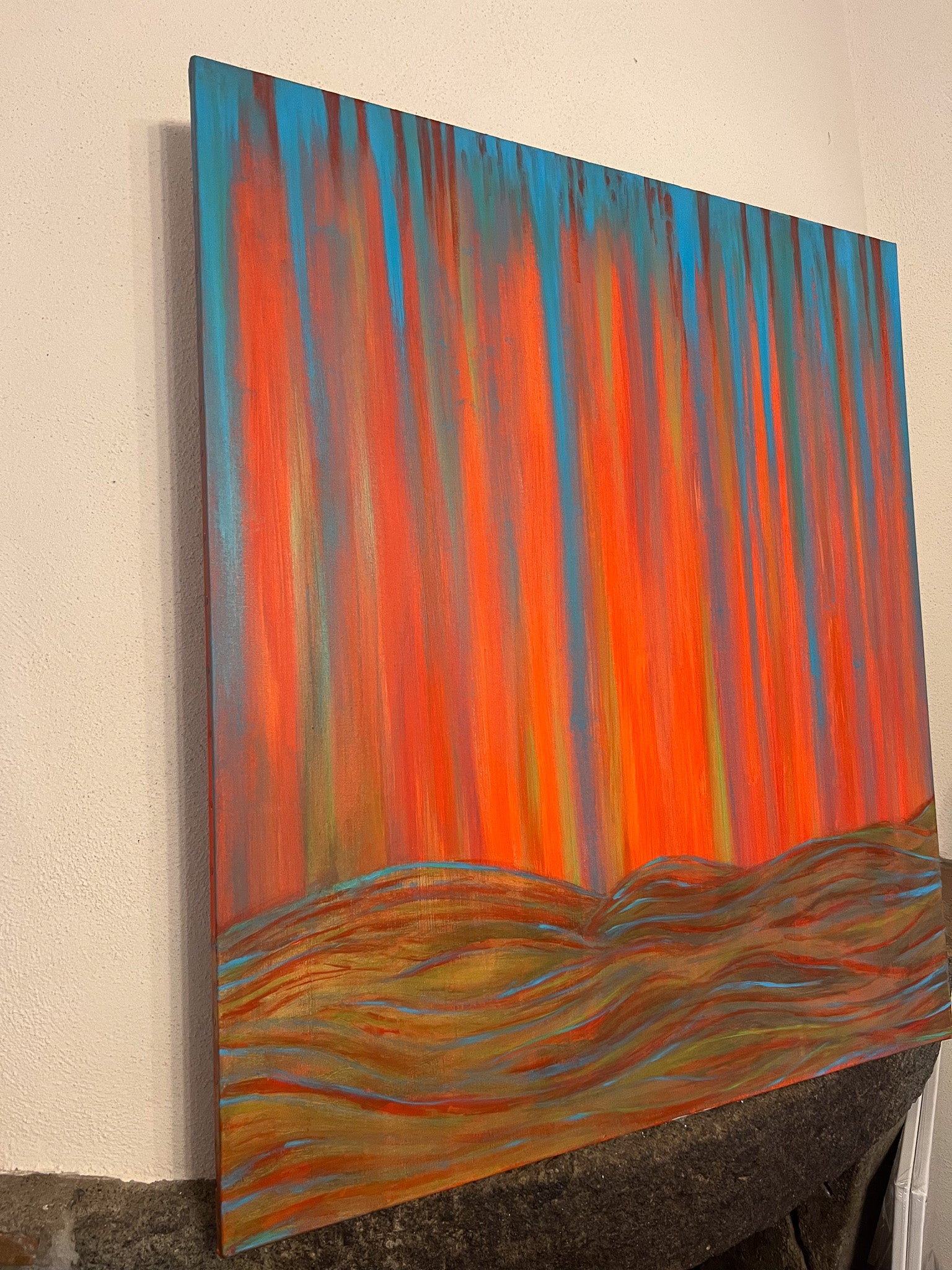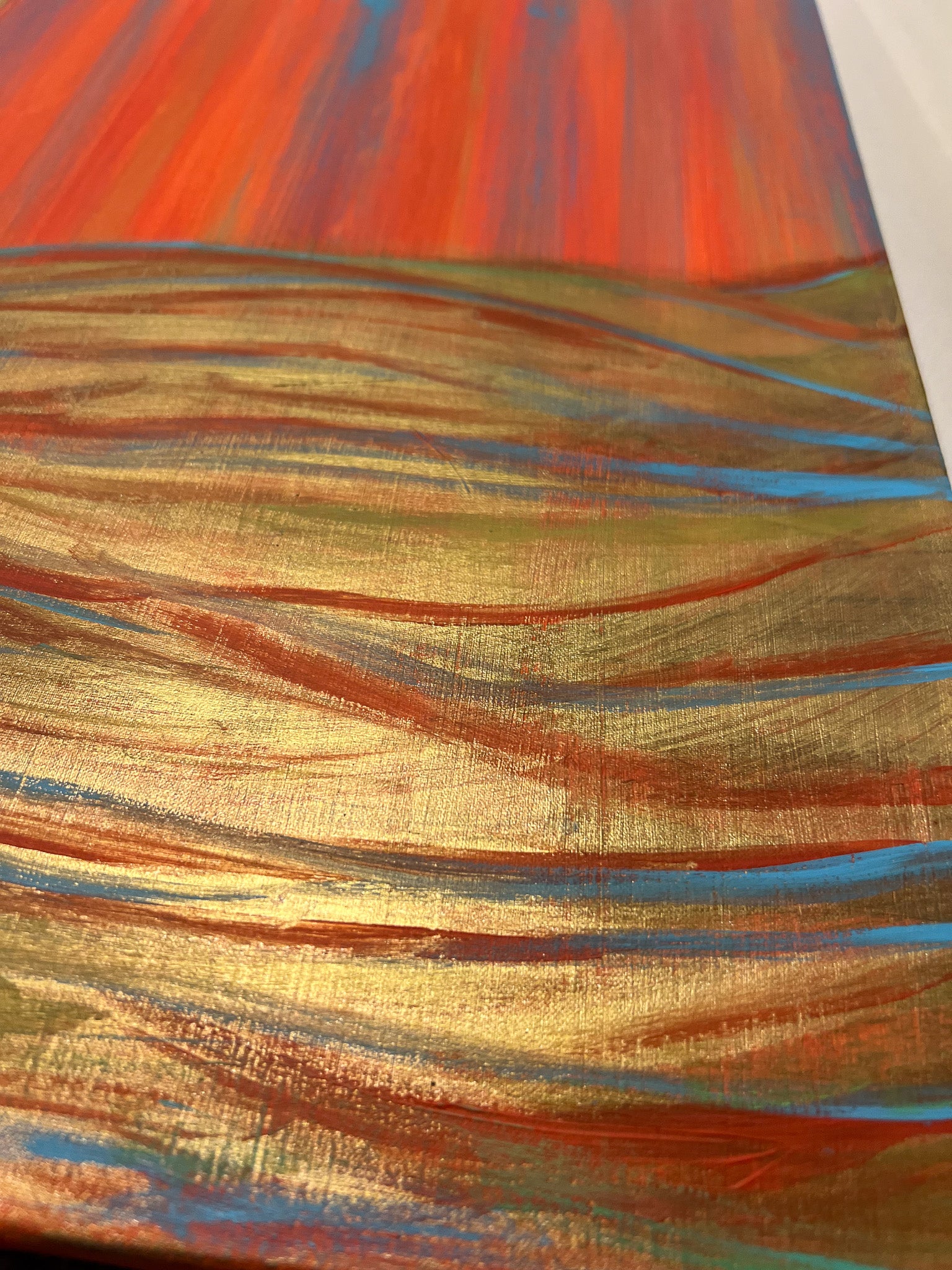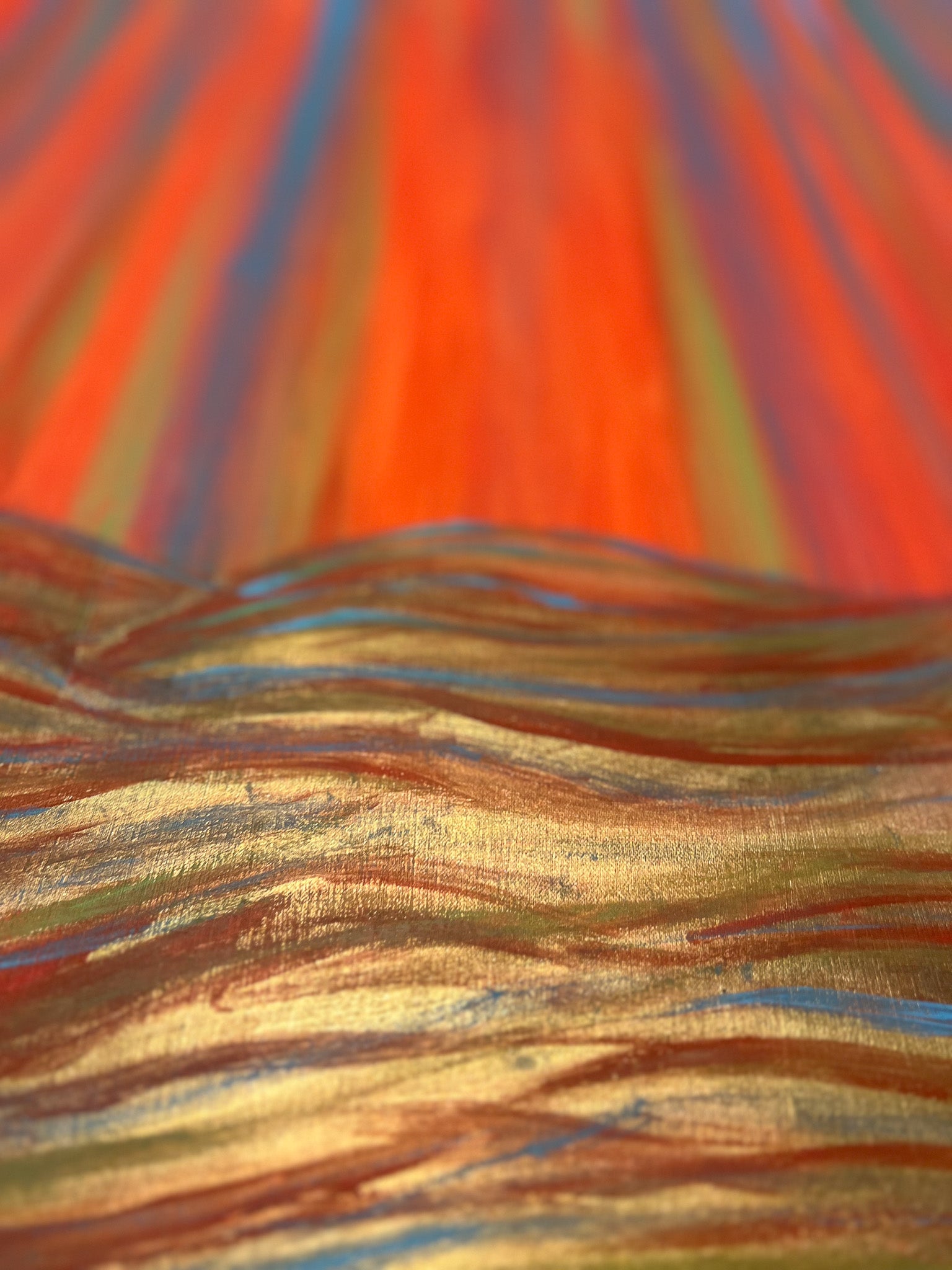 In this piece, I've poured out a symphony of vibrant hues, where the sunset cascades over undulating hills like a warm, melodic wave. It's an abstraction of nature's bliss, a dance of expressionism and surrealism that invites viewers to lose themselves in the rhythm of colors. It's not just a painting; it's an energy, alive with emotion, ready to infuse any room with the essence of an everlasting evening glow.