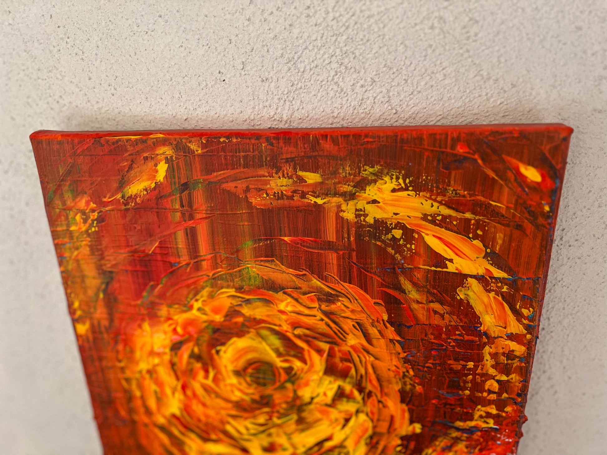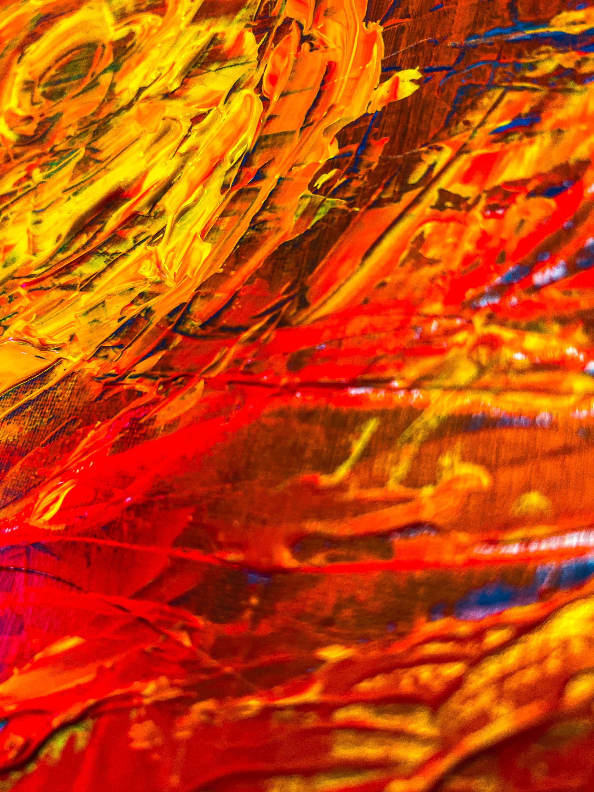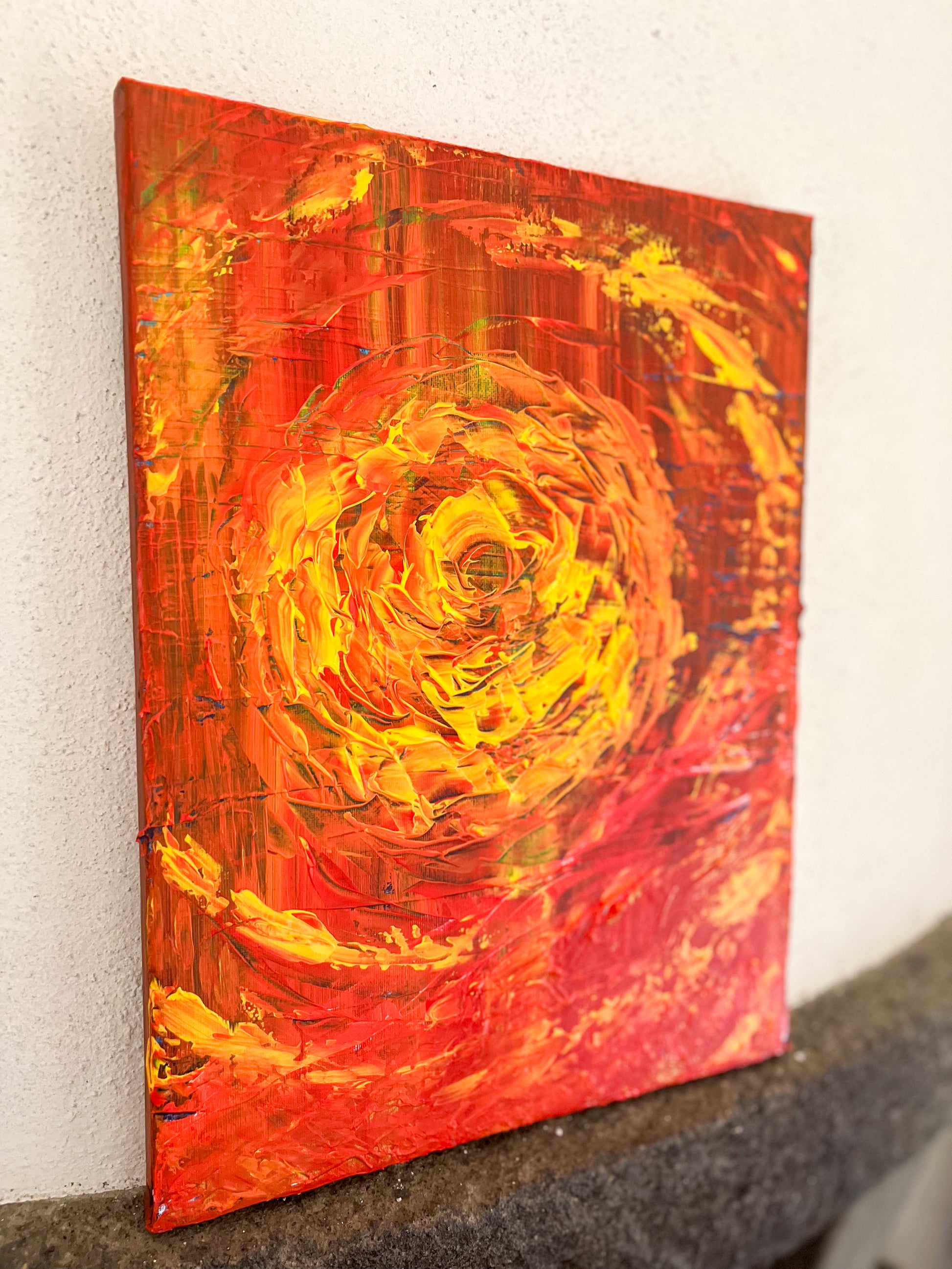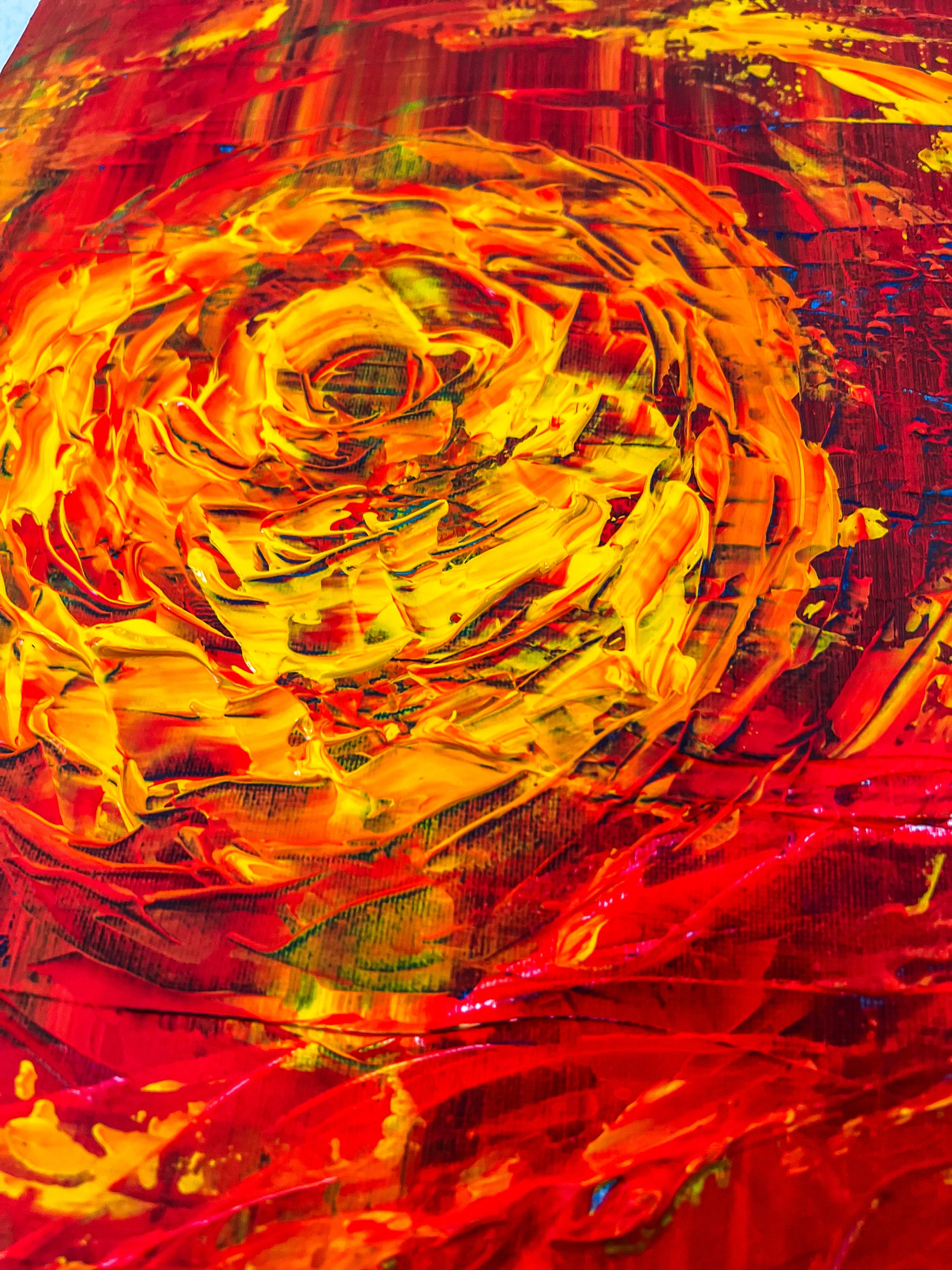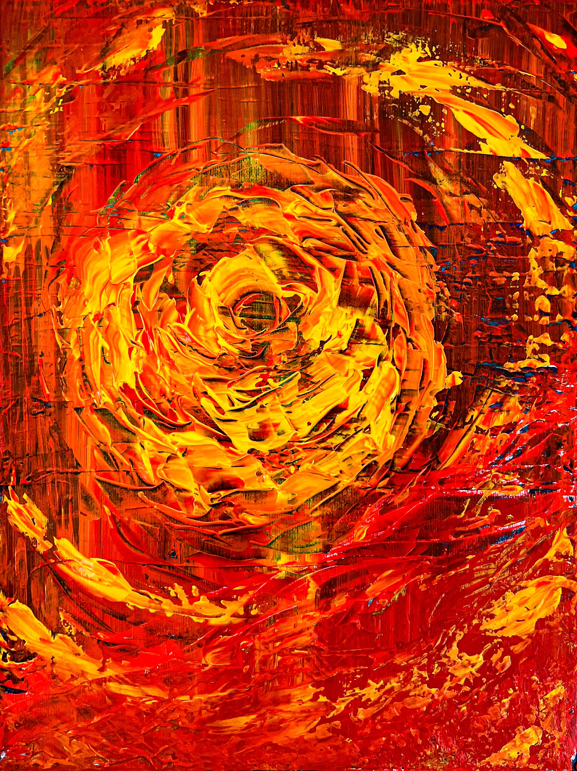 In this piece, I've unleashed a whirlpool of emotions through vibrant acrylic strokes, intertwining abstract and impressionist influences with a touch of geometric order. The fiery orb at the center symbolizes intense passion and relentless drive, emanating energy that dynamically swirls outward. This painting is meant to ignite inspiration and invoke a deep emotional response, perfect for bringing a bold, energetic spirit into any space.