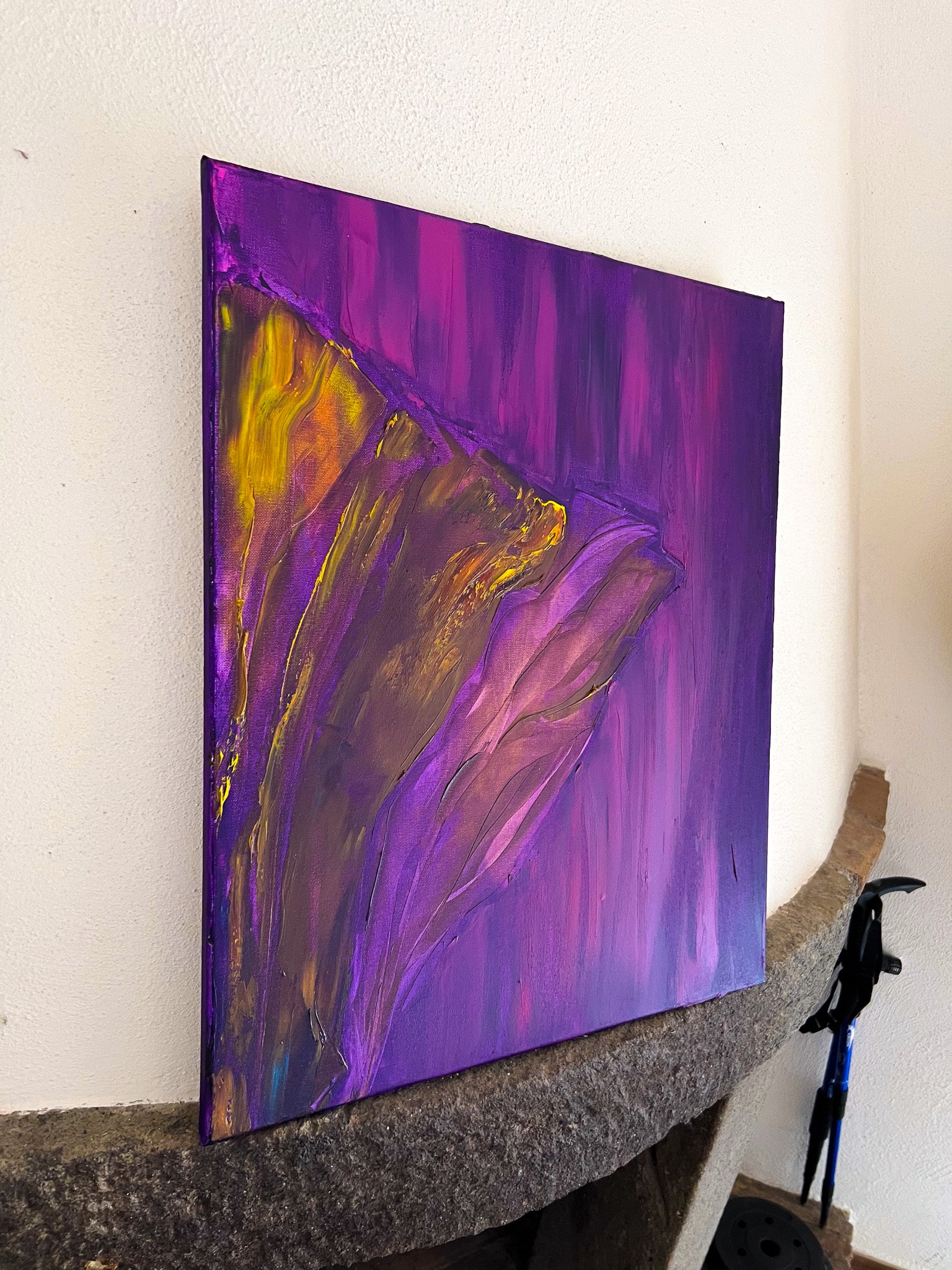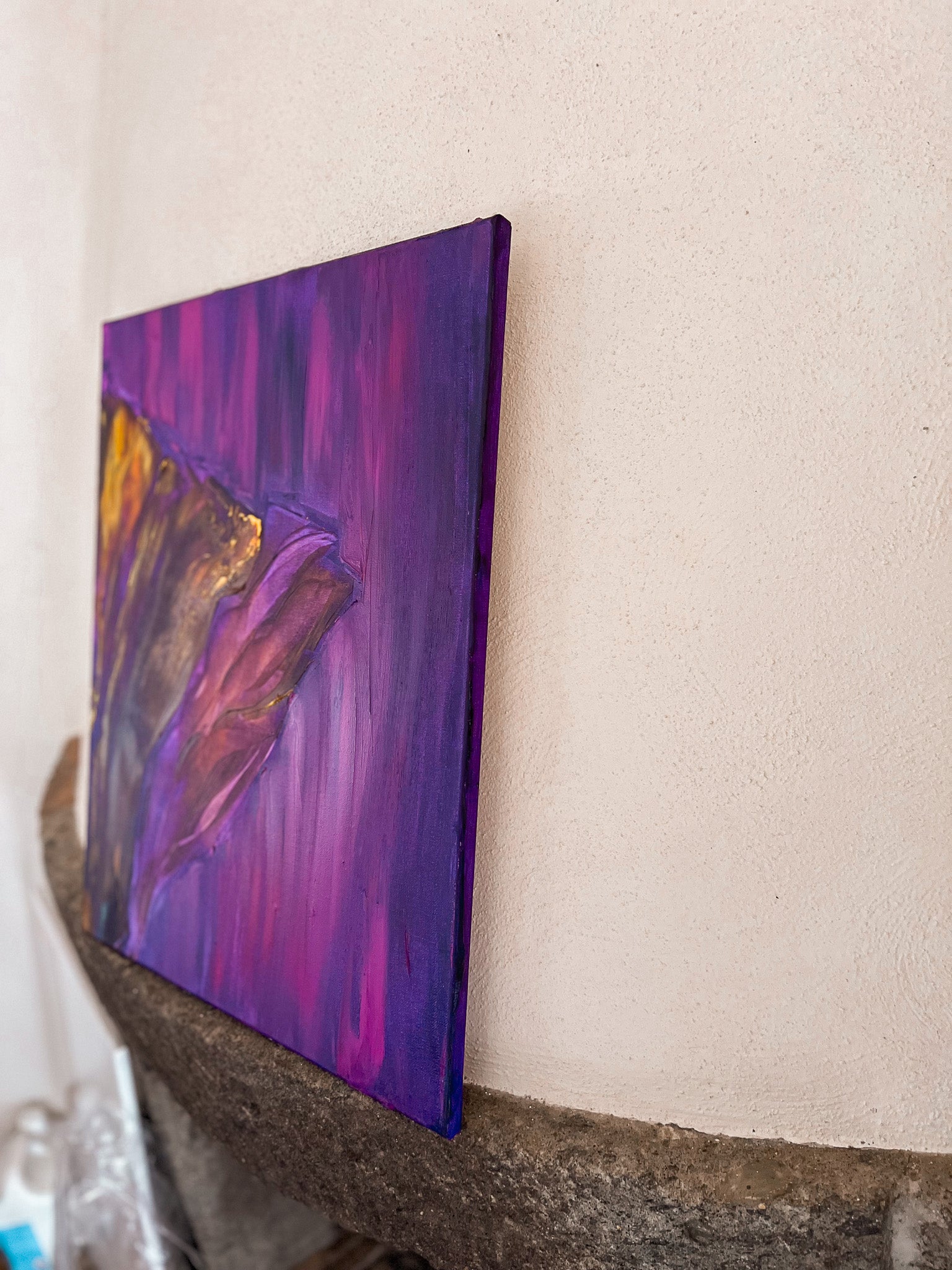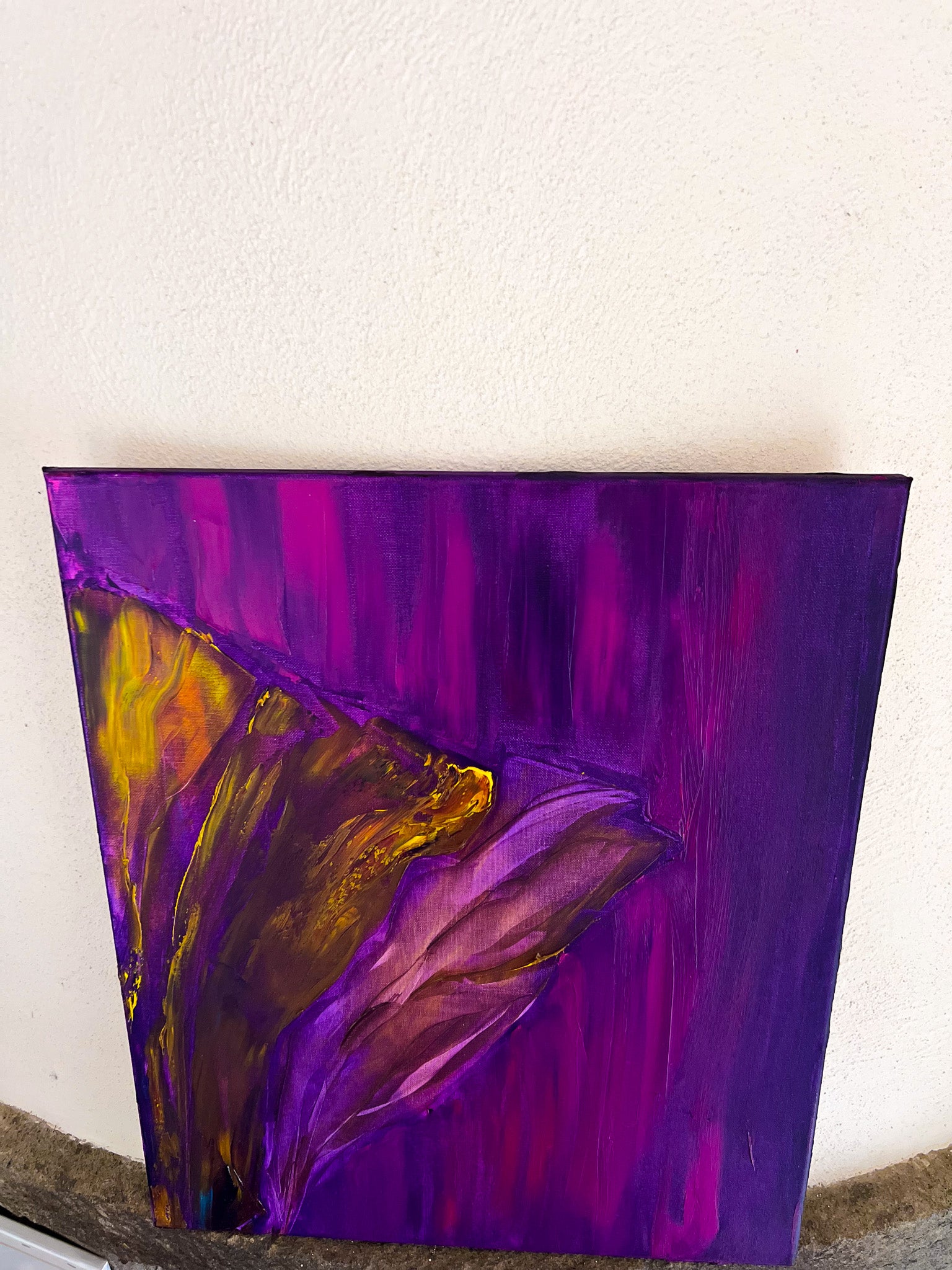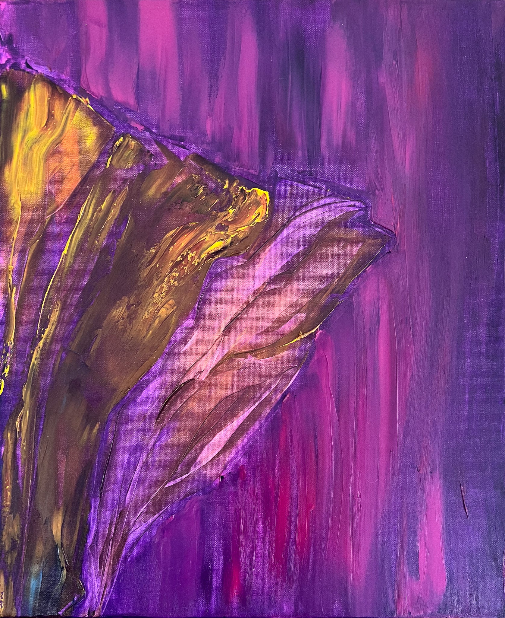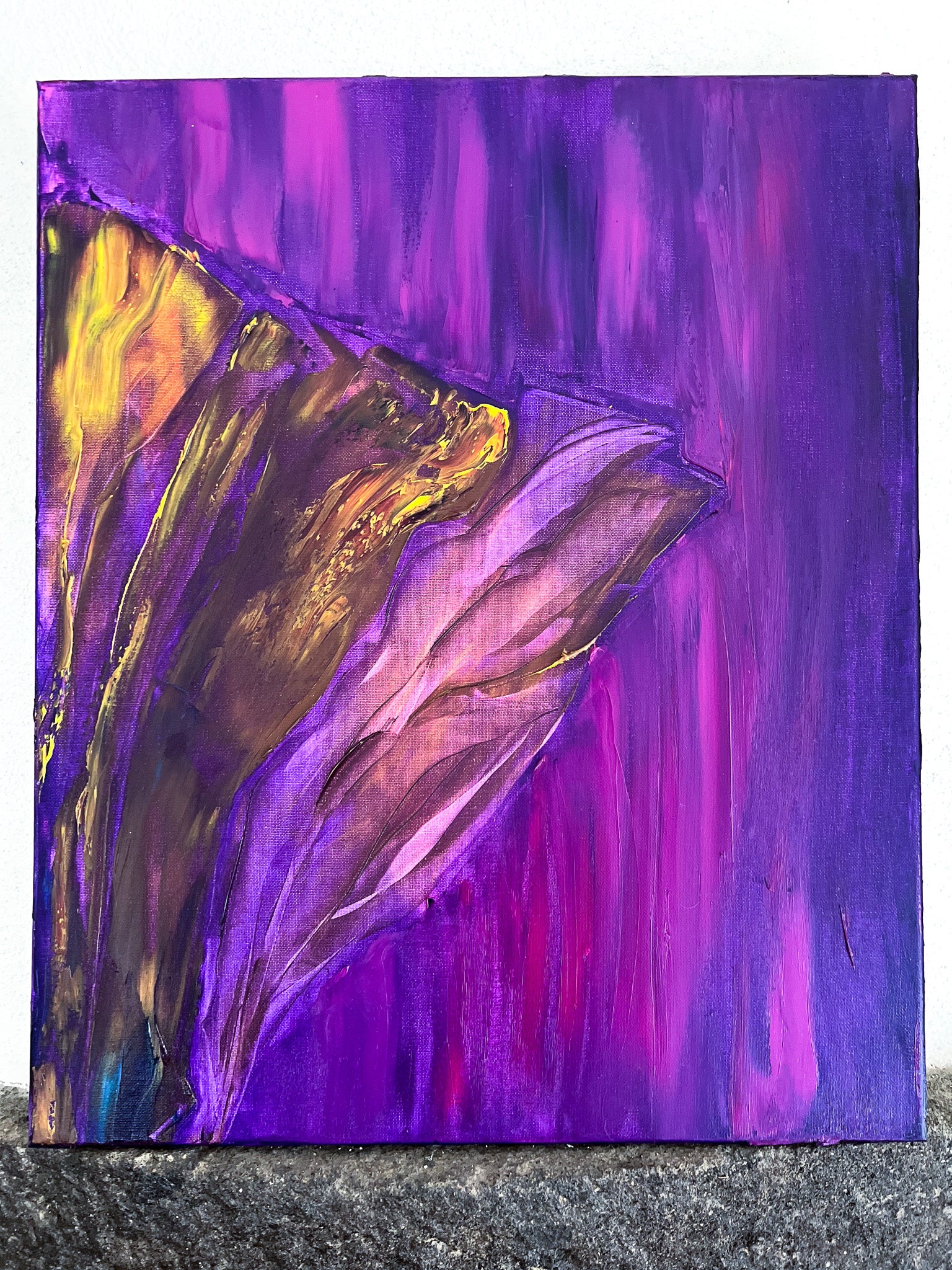 In this oil painting, I've endeavored to capture a symphony of emotions. The purple hues—a cosmic dance, evoking deep contemplation—meld with the vibrant gold, symbolizing a burst of enlightenment and prosperity. Embracing expressionism and minimalism, I crafted a metaphysical journey on canvas, where the future intersects with the soul's quiet whispers. It's designed to enliven your space with its dynamic energy and stir the unspoken within.