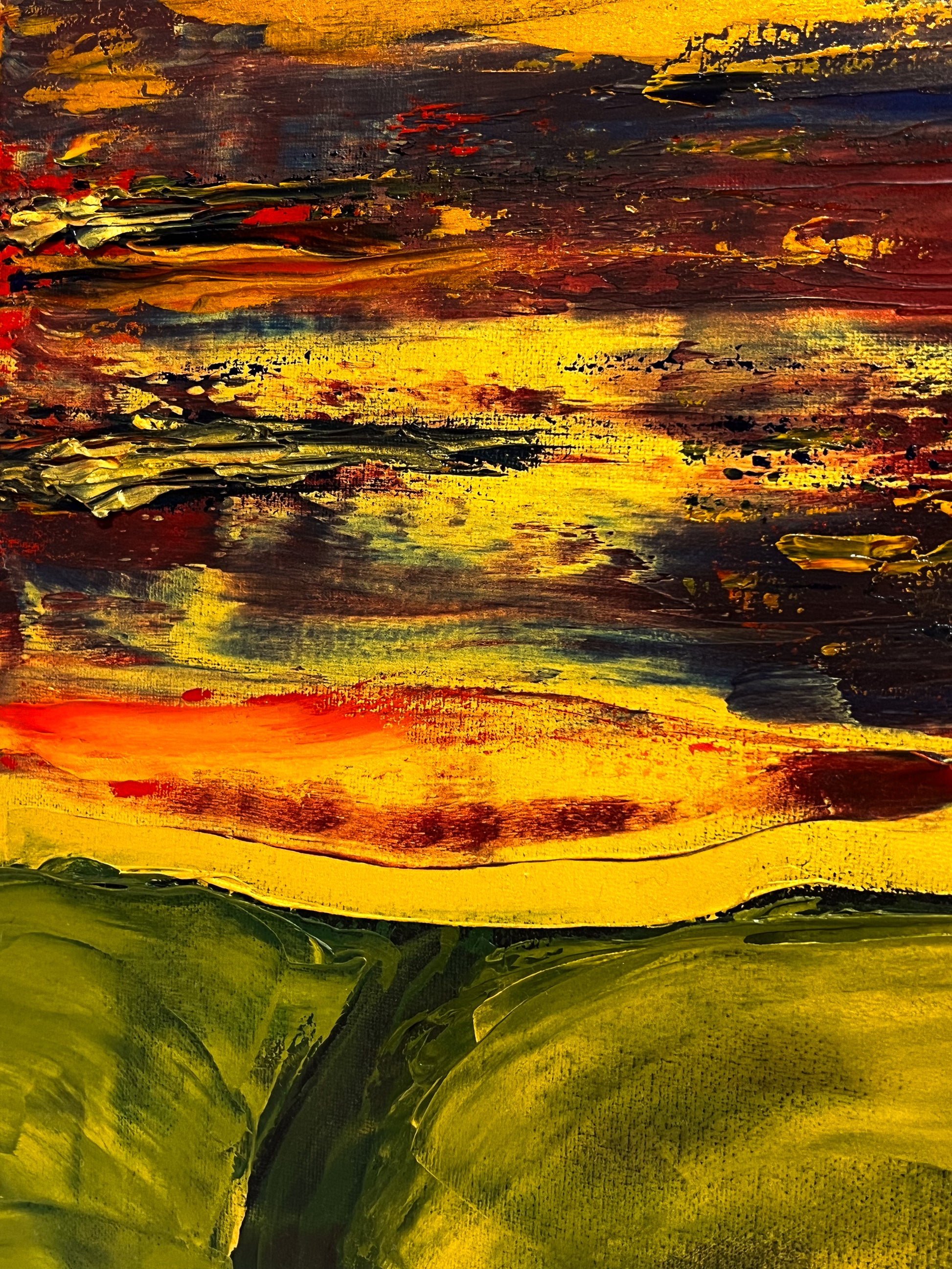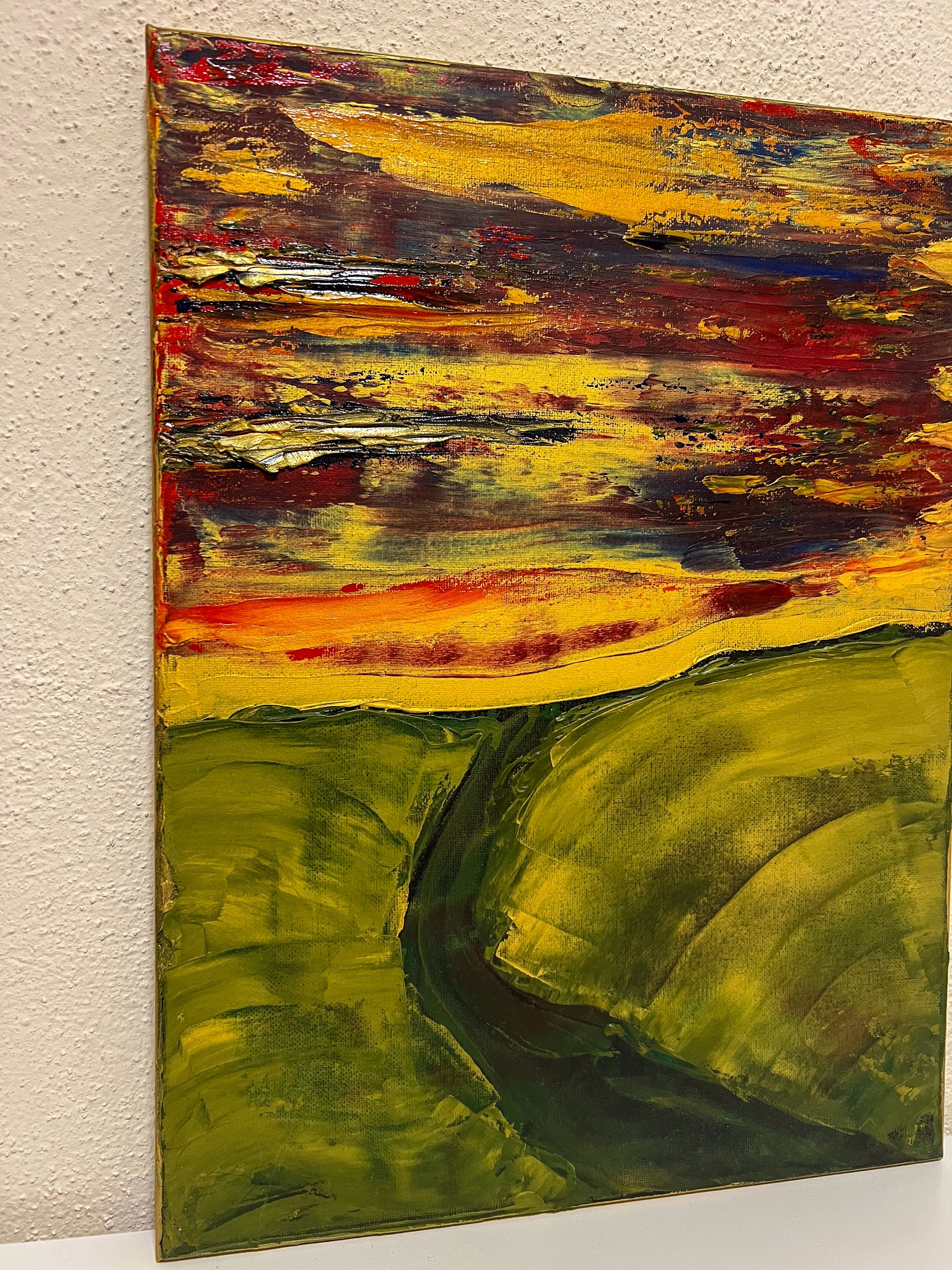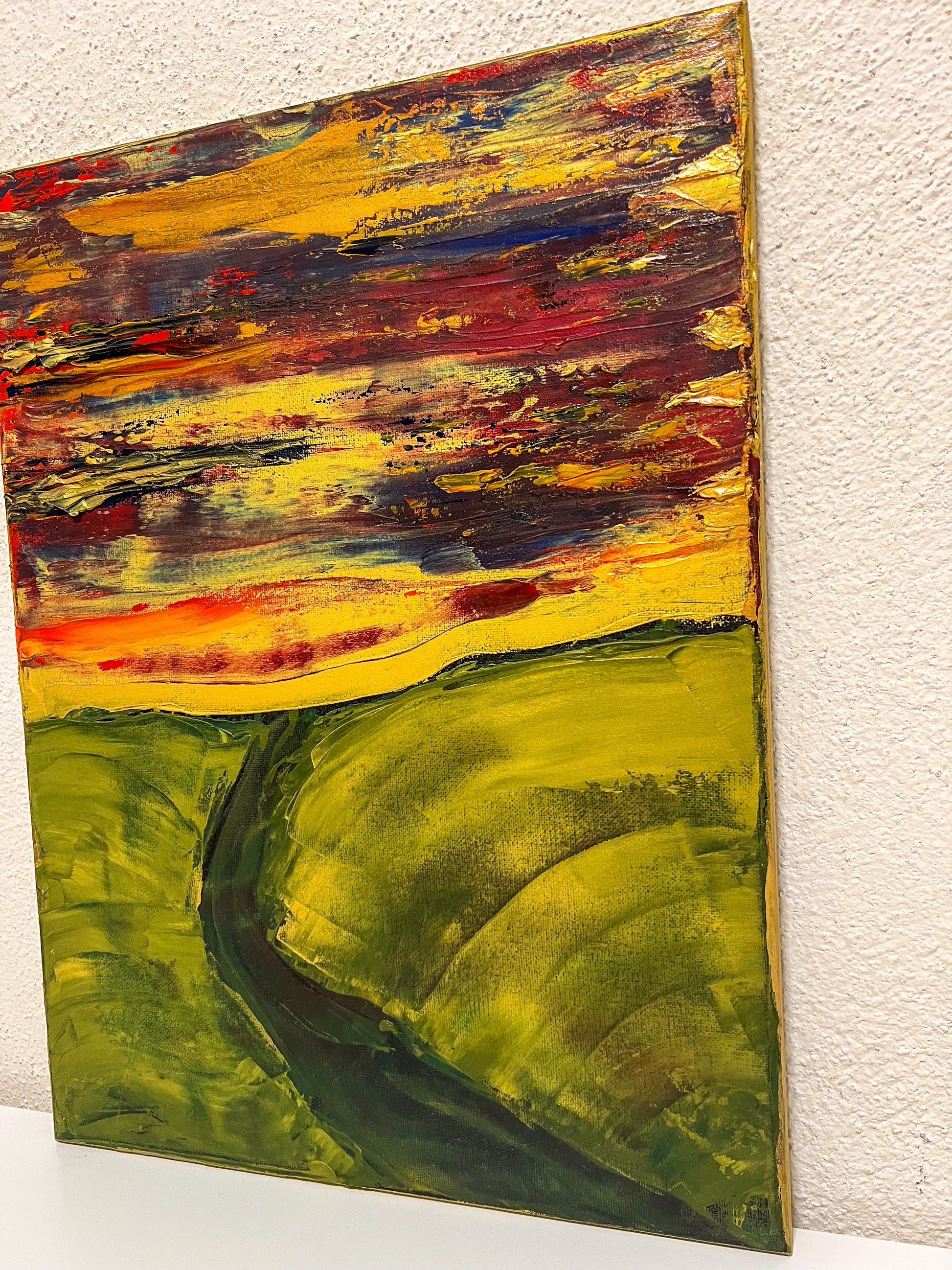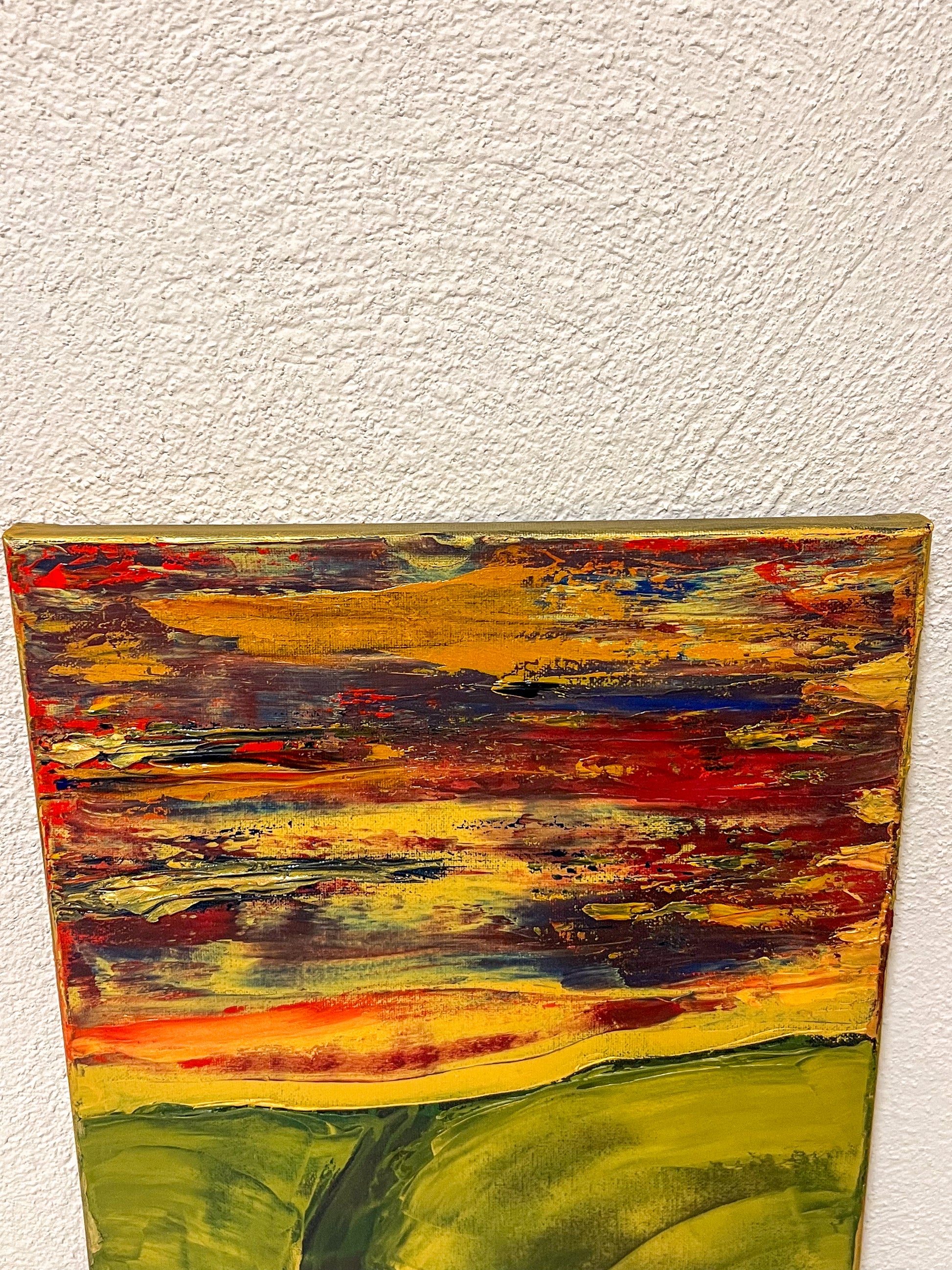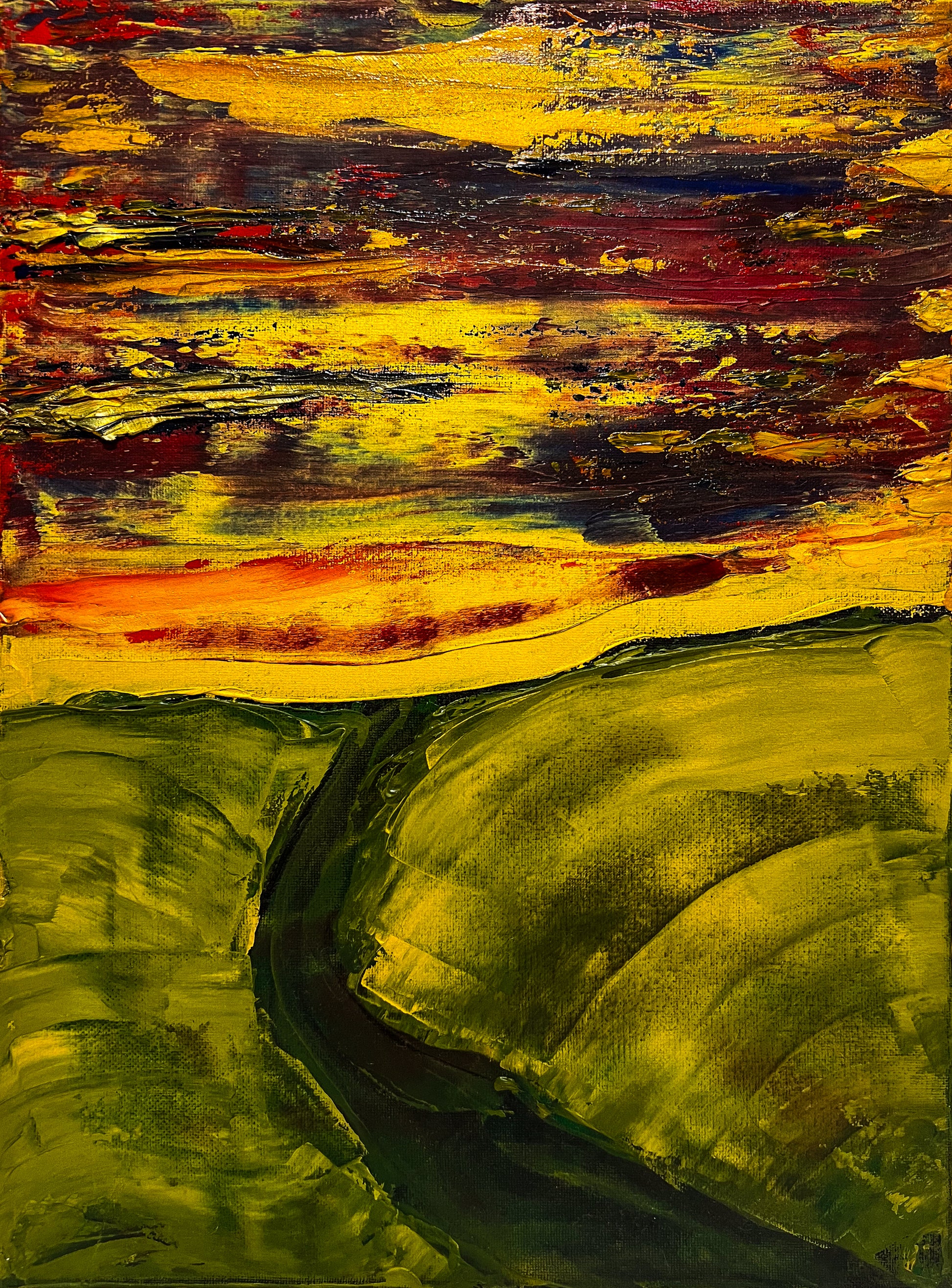 In this painting, I sought to create a vivid interplay of emotions using oil on canvas, guiding the viewer through a landscape that teeters between the abstract and the defined. The fiery horizon, expressed through chaotic, passionate streaks of red and yellow, symbolizes enduring hope and unrelenting spirit. Beneath, the verdant hills, molded with gentler, flowing gestures, evoke a sense of grounding and calm. Together, the elements speak to the human experience — vibrant yet serene, tumultuous yet steady. This piece invites harmony and inspiration into any space, reminding us of the beauty in persistence and peace.