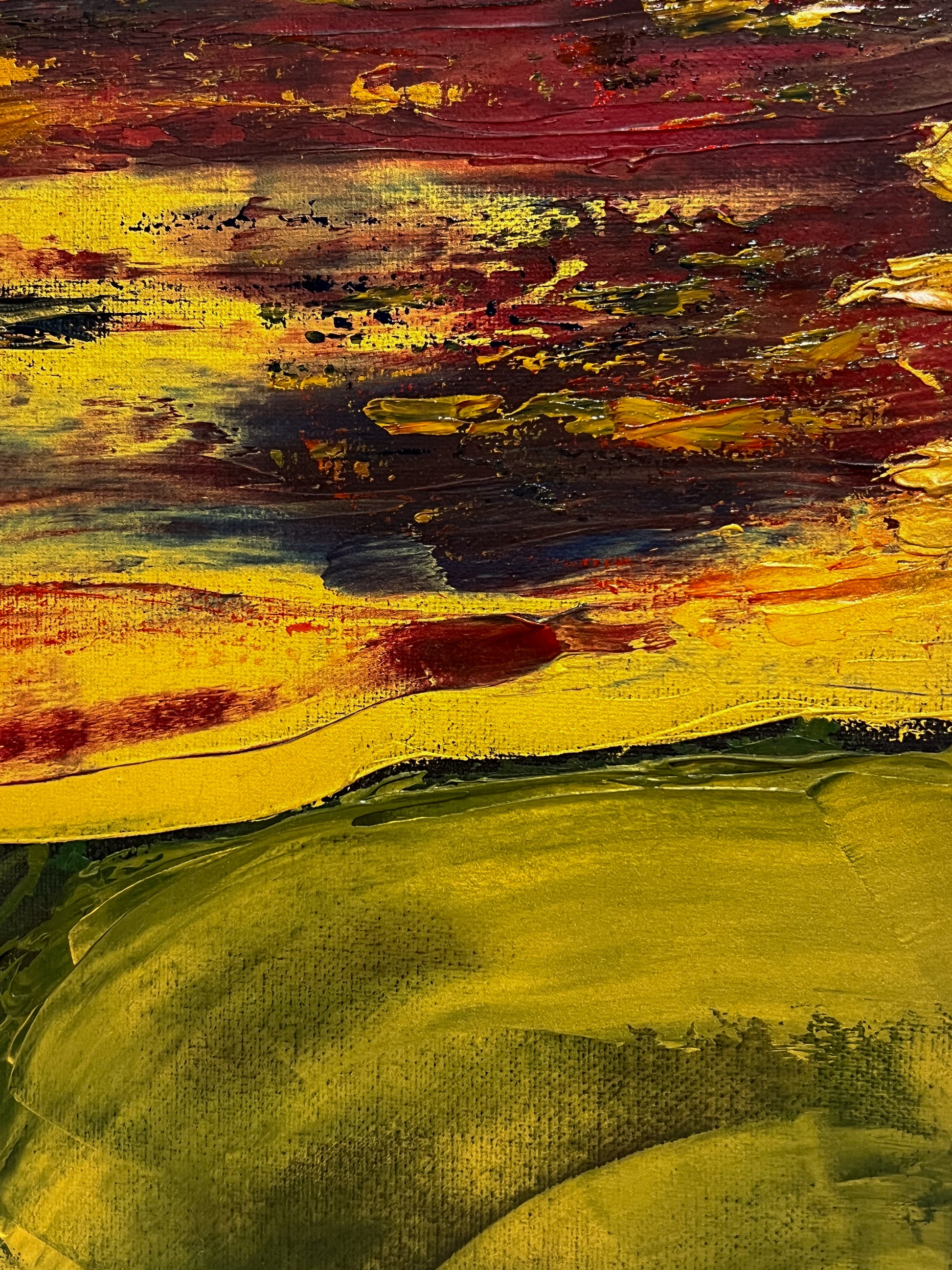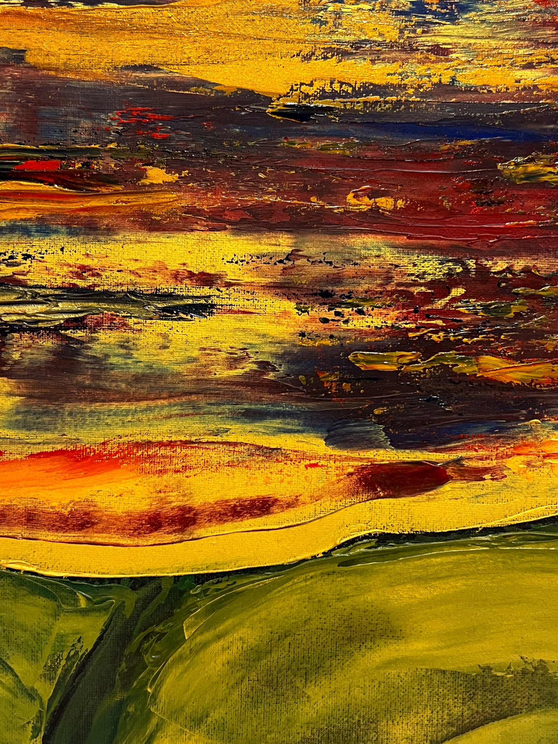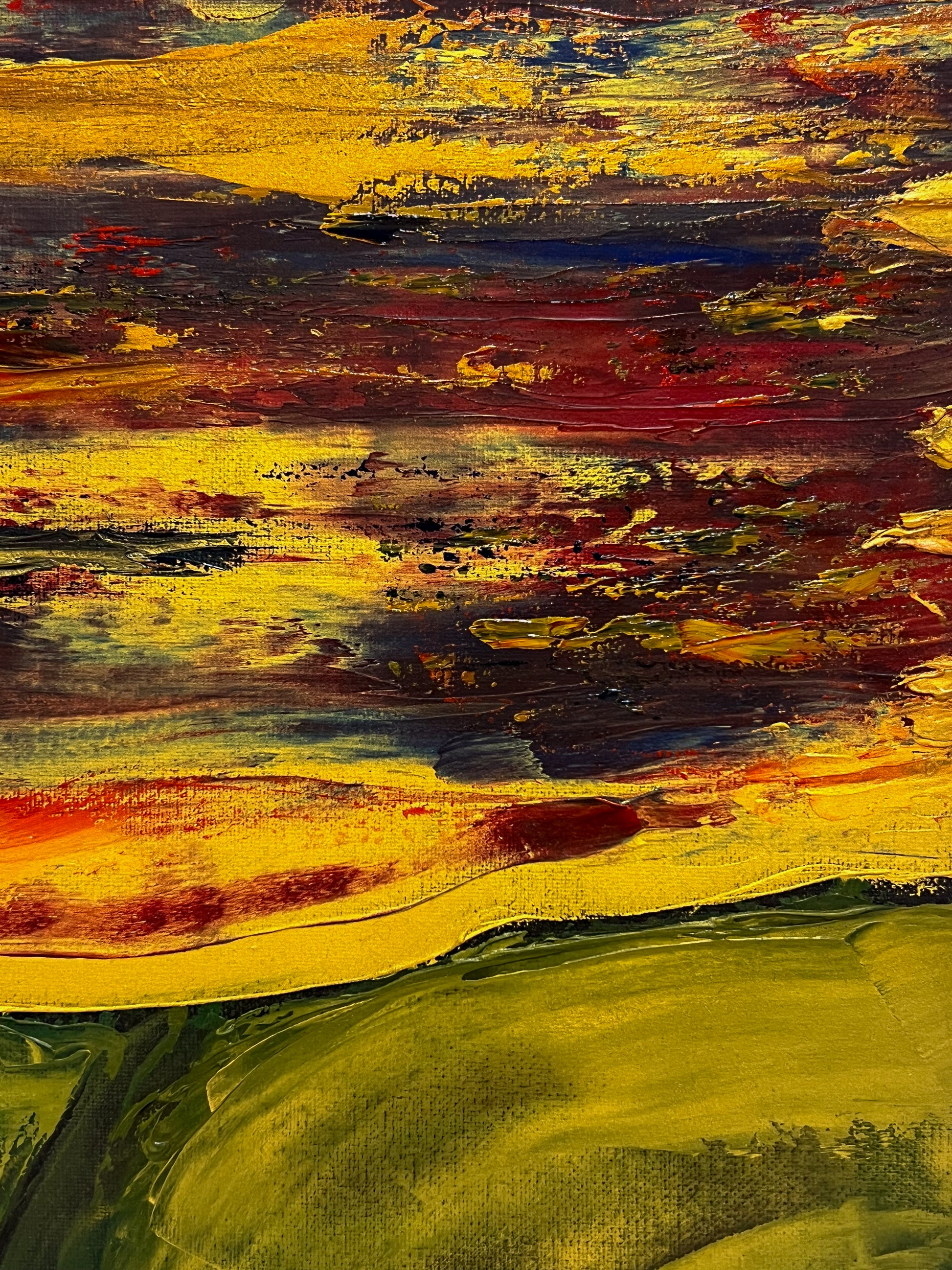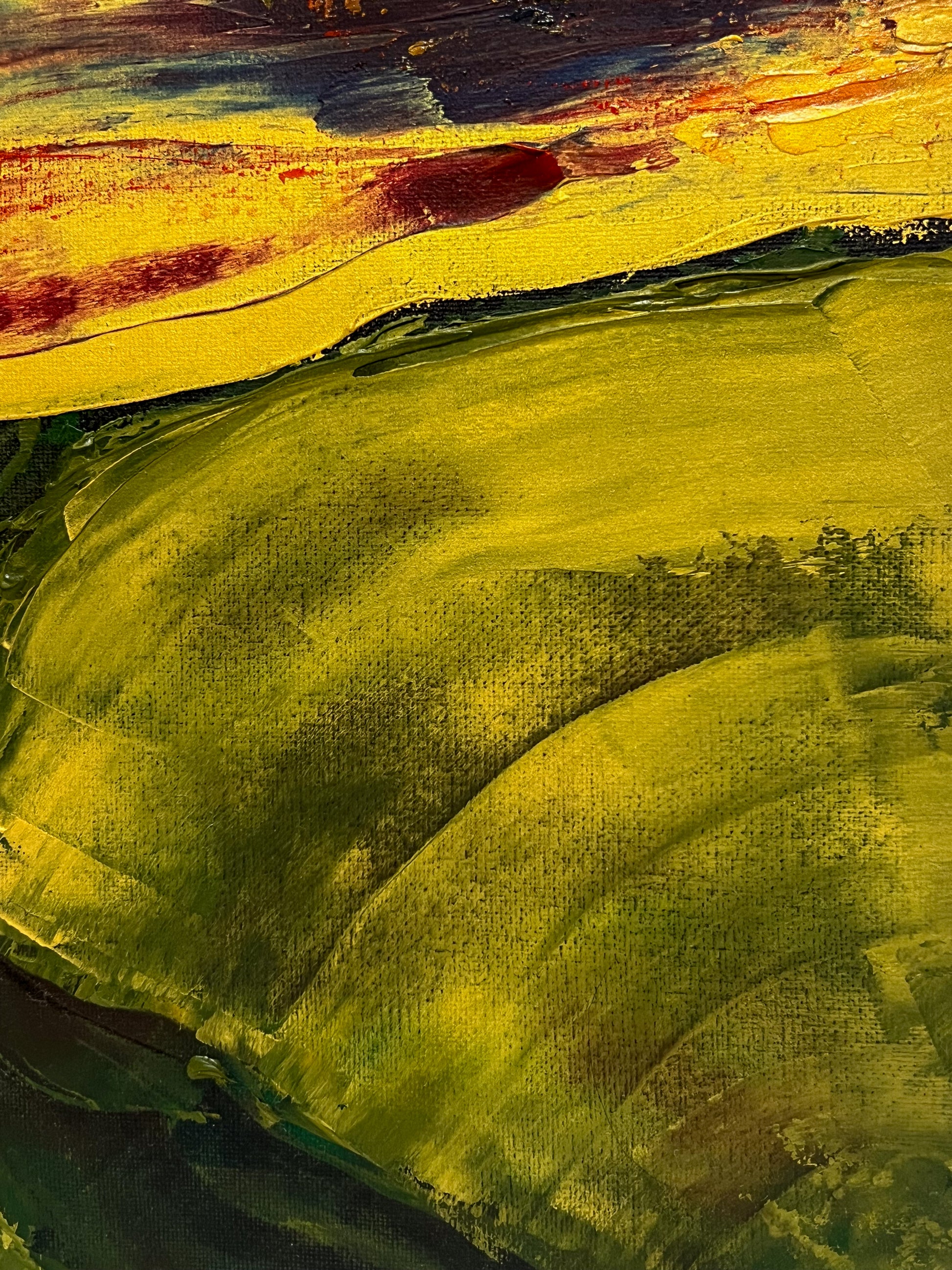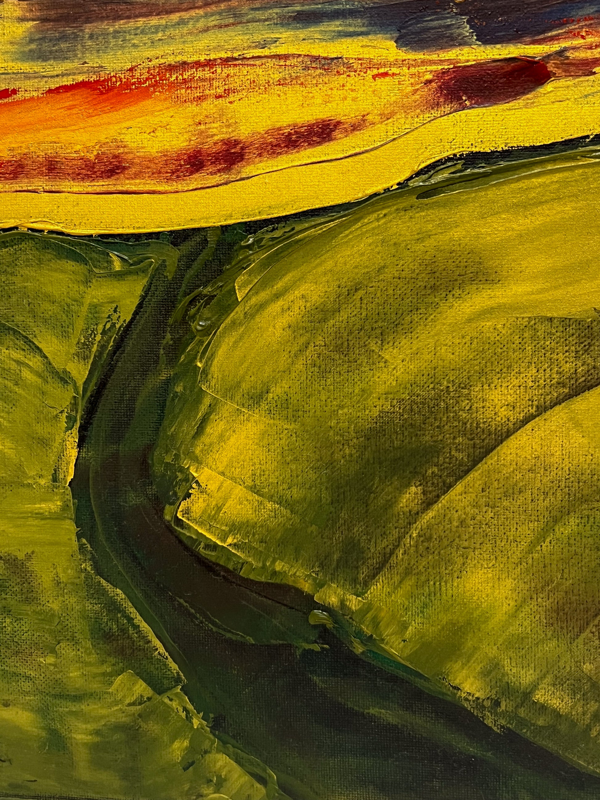 In this painting, I sought to create a vivid interplay of emotions using oil on canvas, guiding the viewer through a landscape that teeters between the abstract and the defined. The fiery horizon, expressed through chaotic, passionate streaks of red and yellow, symbolizes enduring hope and unrelenting spirit. Beneath, the verdant hills, molded with gentler, flowing gestures, evoke a sense of grounding and calm. Together, the elements speak to the human experience — vibrant yet serene, tumultuous yet steady. This piece invites harmony and inspiration into any space, reminding us of the beauty in persistence and peace.