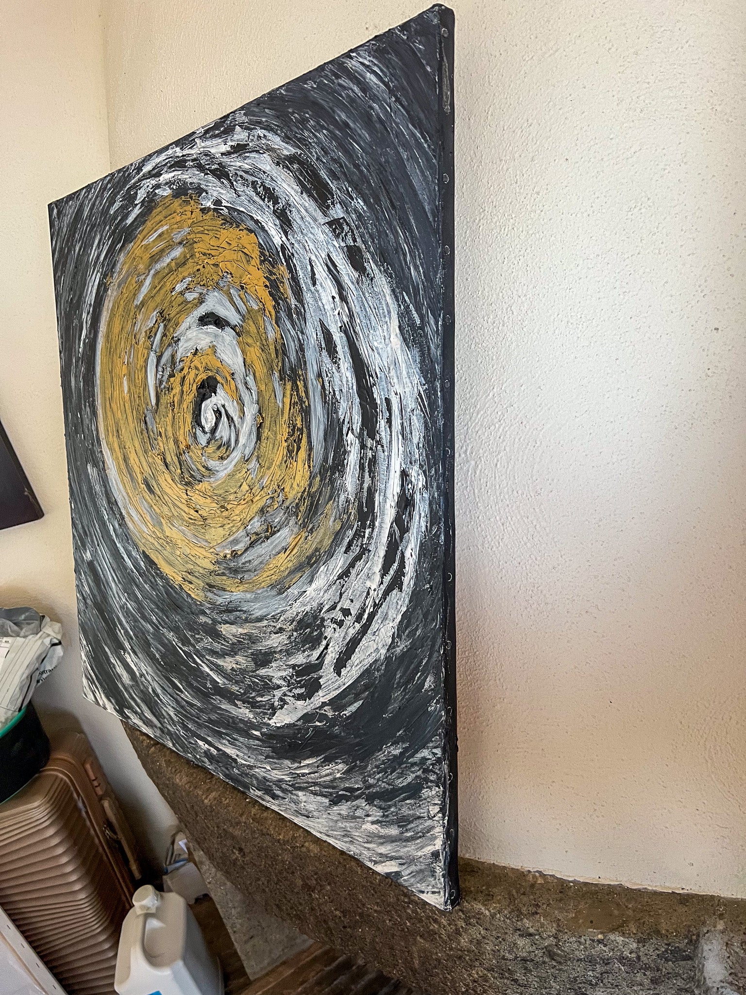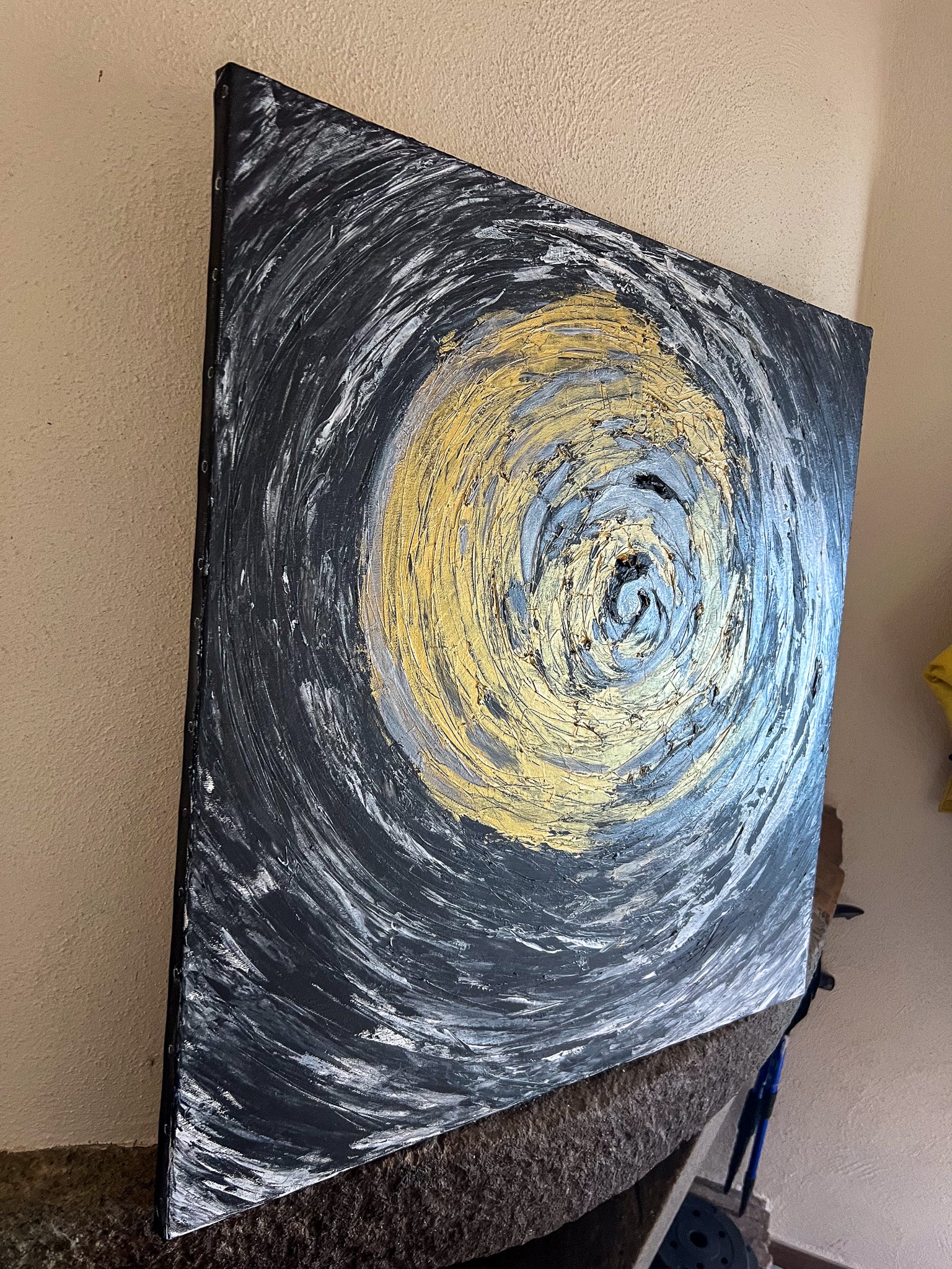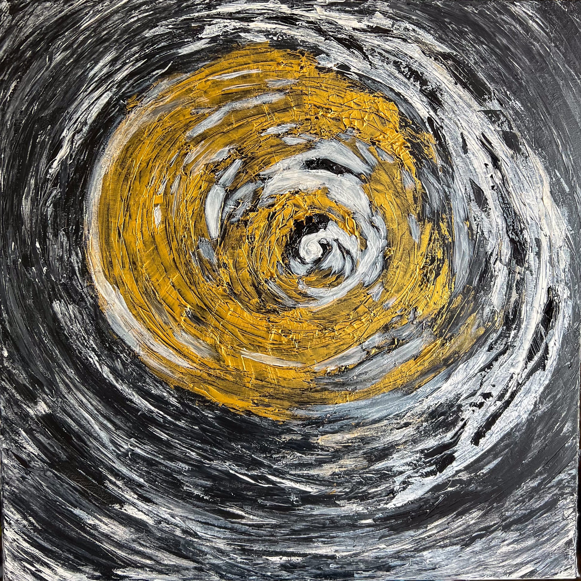 In this stirring piece, I've channeled the cosmic dance of light and darkness using acrylics. My brushstrokes whirl with emotion, carving out a vortex that symbolizes life's relentless spinning. It's a fusion of the abstract and the geometric, where expressionism meets a semblance of the structured world. This painting pulses with an energy that will infuse any space with depth and dynamic movement, a constant reminder of the beautiful chaos that binds us.