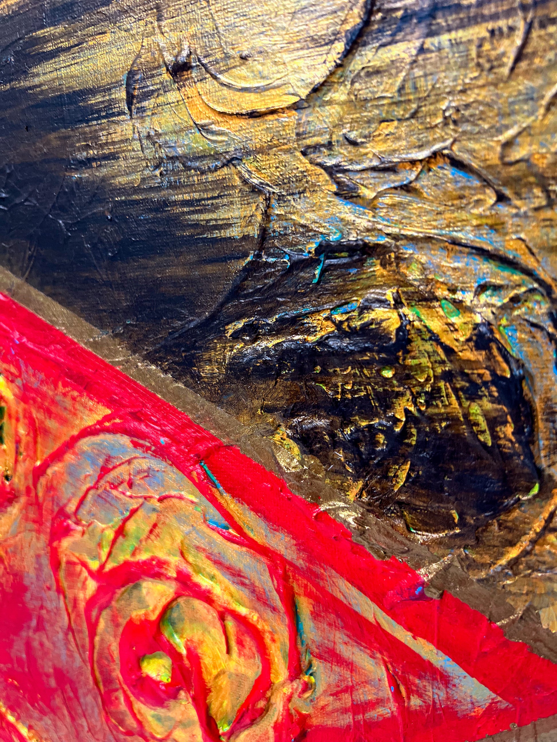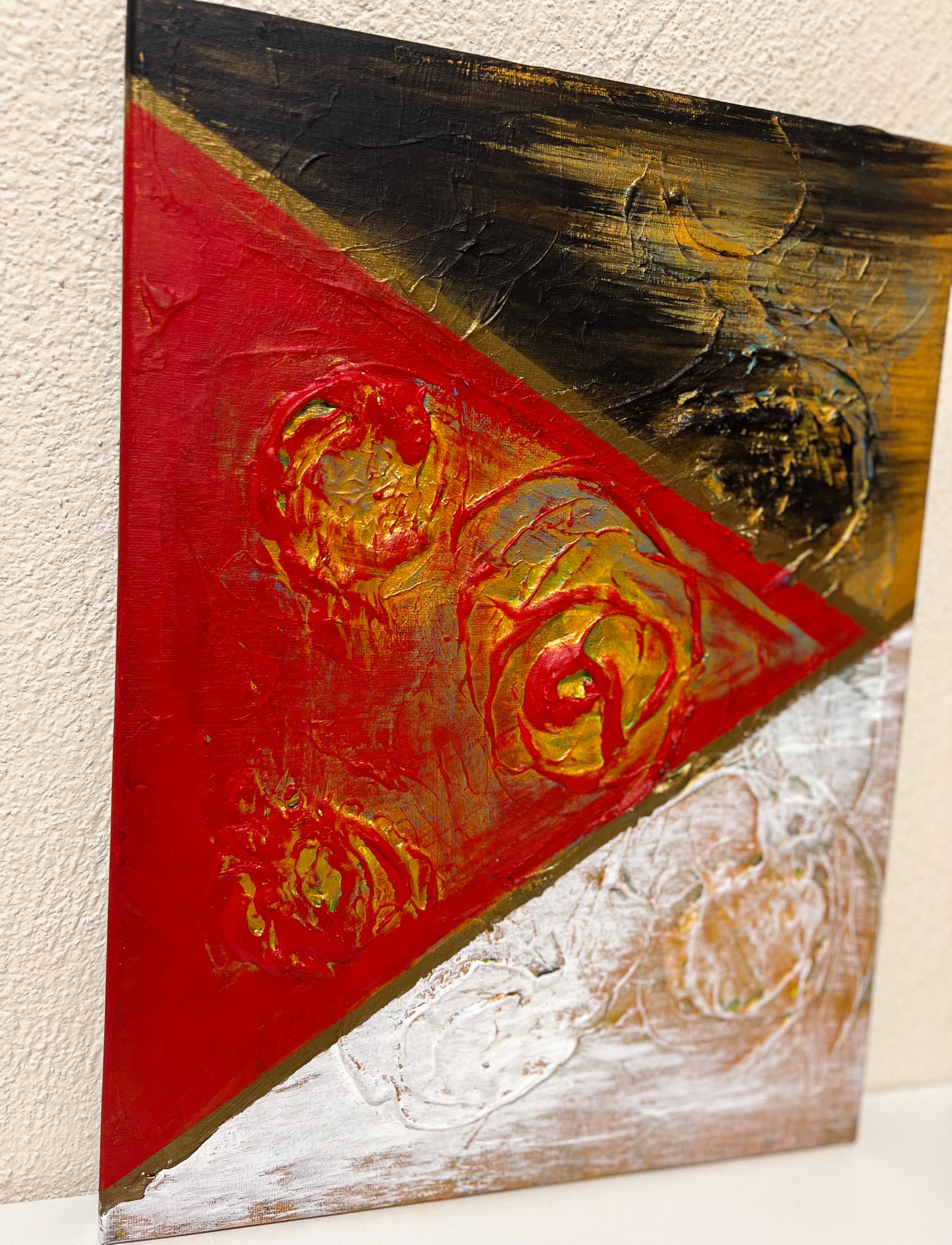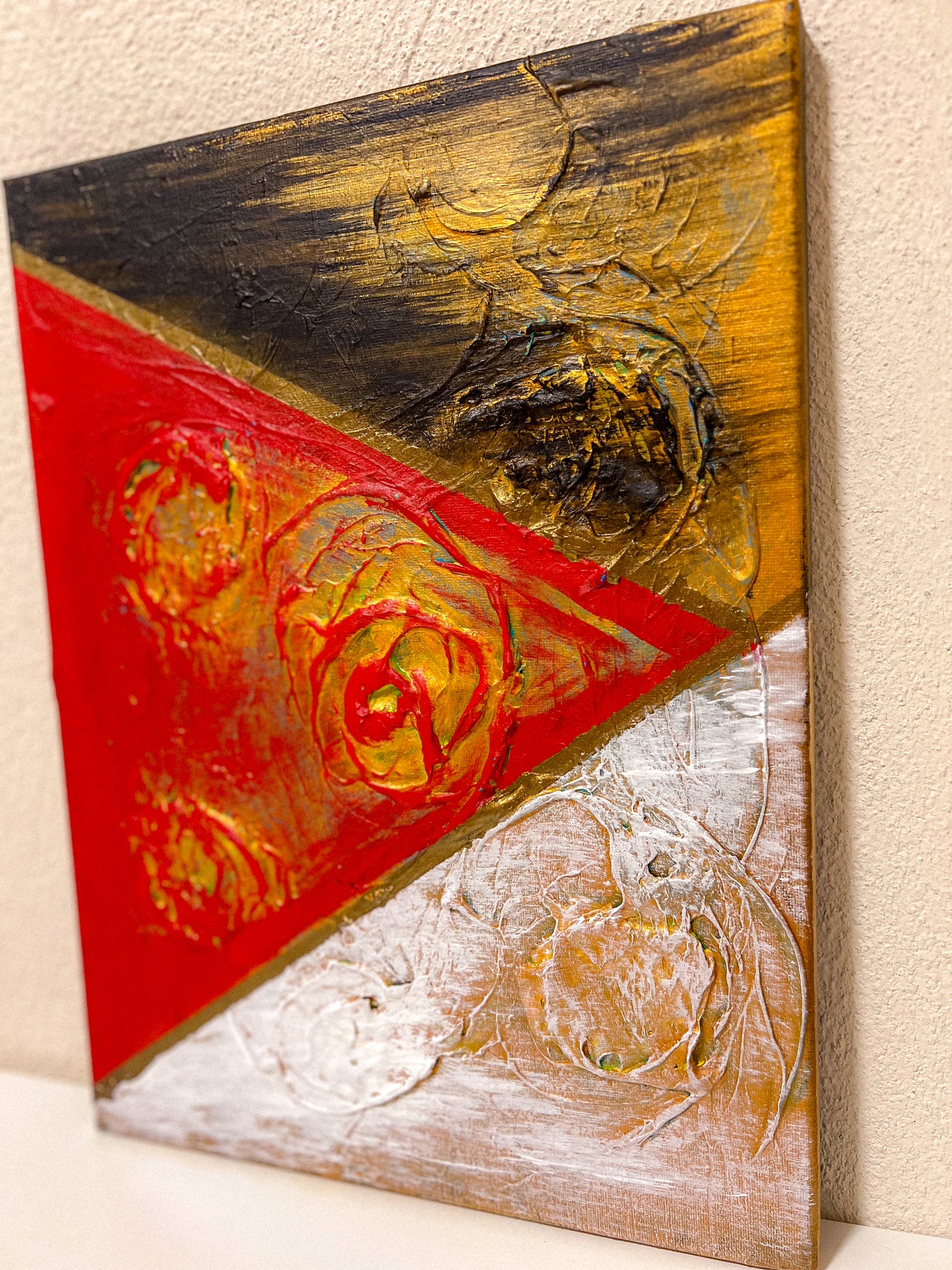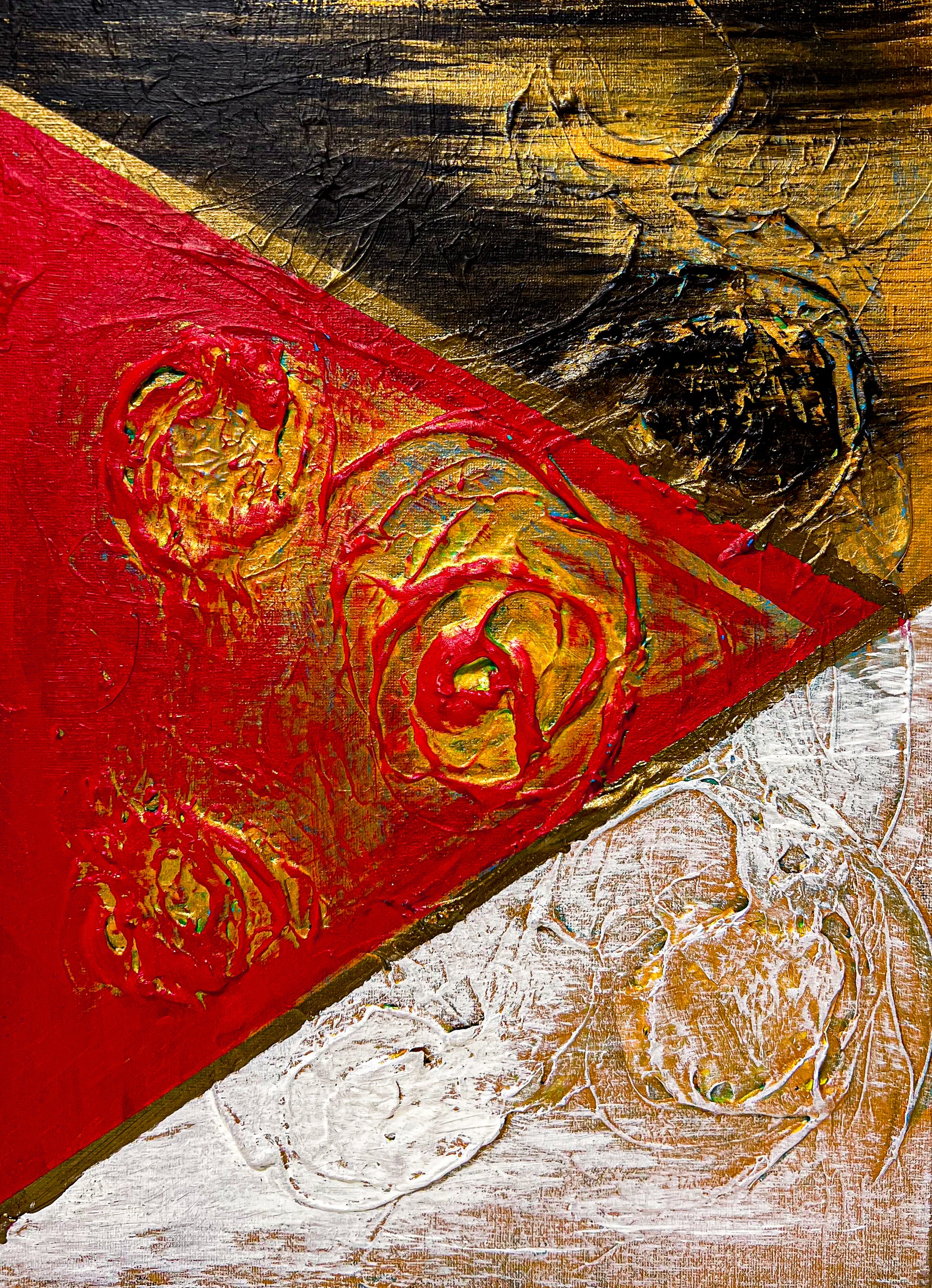 In this vivid acrylic creation, I've played with geometric abstraction to invoke a metaphysical dialogue. The starkness of minimalism meets textured chaos, mirroring life's complexities, and the intensity of our internal battles. This piece, a symphony of raw emotion and stark forms, is meant to breathe powerful energy into any space, compelling the viewer to pause and reflect on the deeper questions of existence.