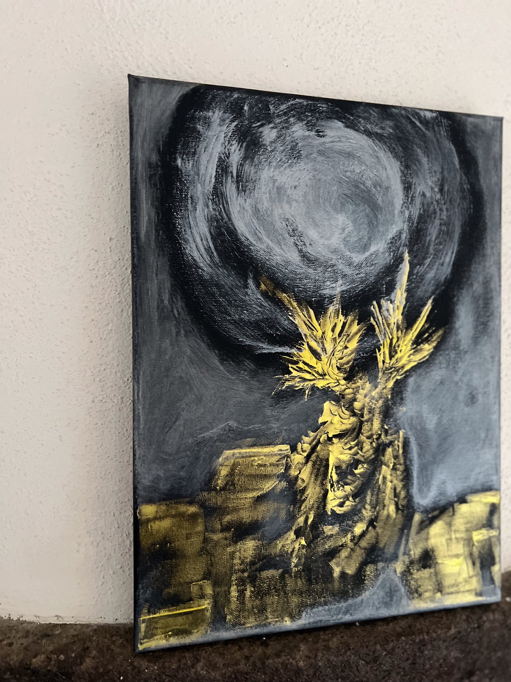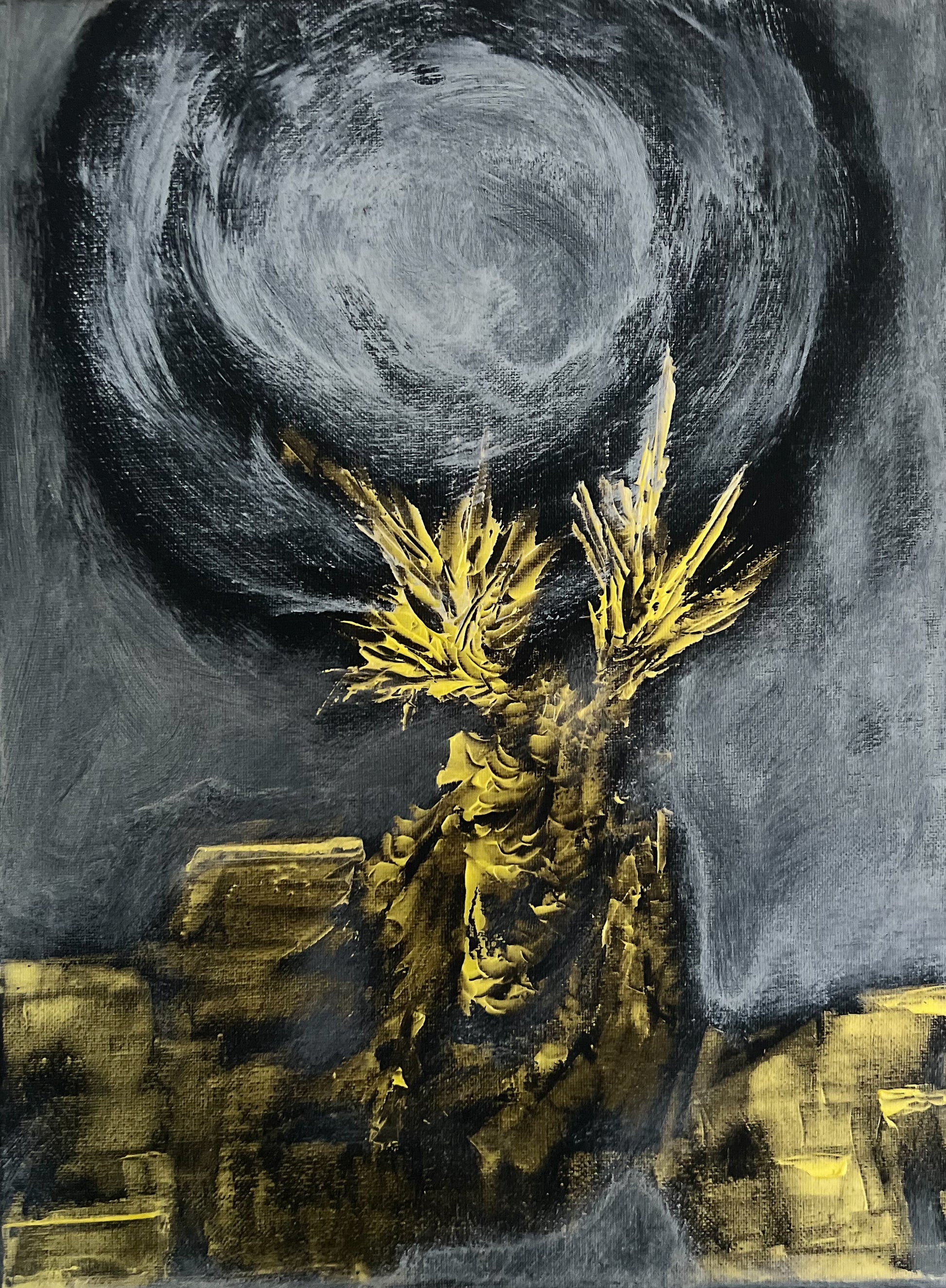 In this acrylic creation, I’ve blended abstract, futuristic, and geometric styles to manifest a vision of timelessness and otherworldliness. The dynamic contrast of golden hues against the somber darkness stirs a sense of mystery and wonder. It embodies a gateway to uncharted dimensions, inviting viewers to ponder the vastness of existence. It's a piece meant to energize your space with its enigmatic aura and evoke endless imagination.