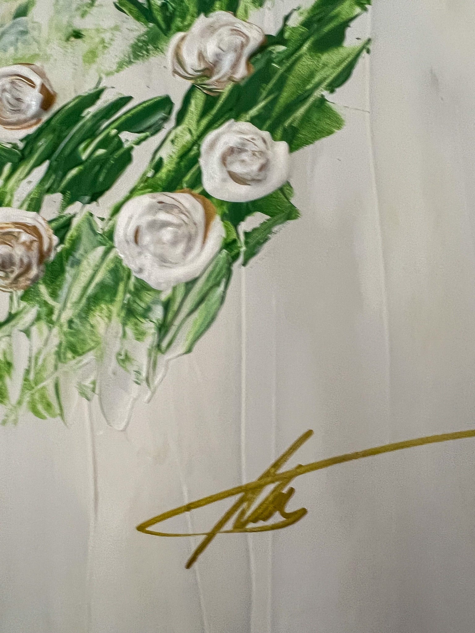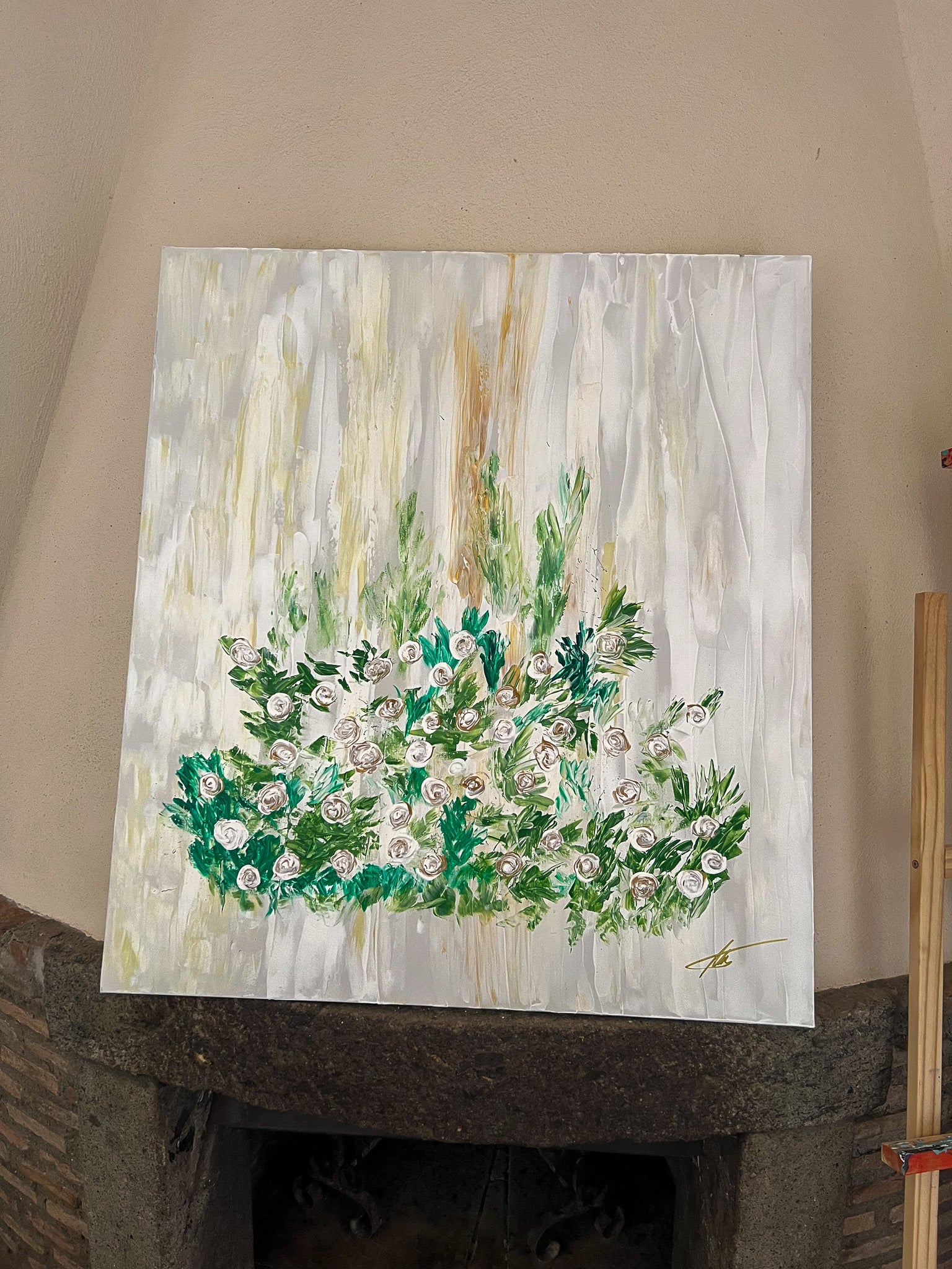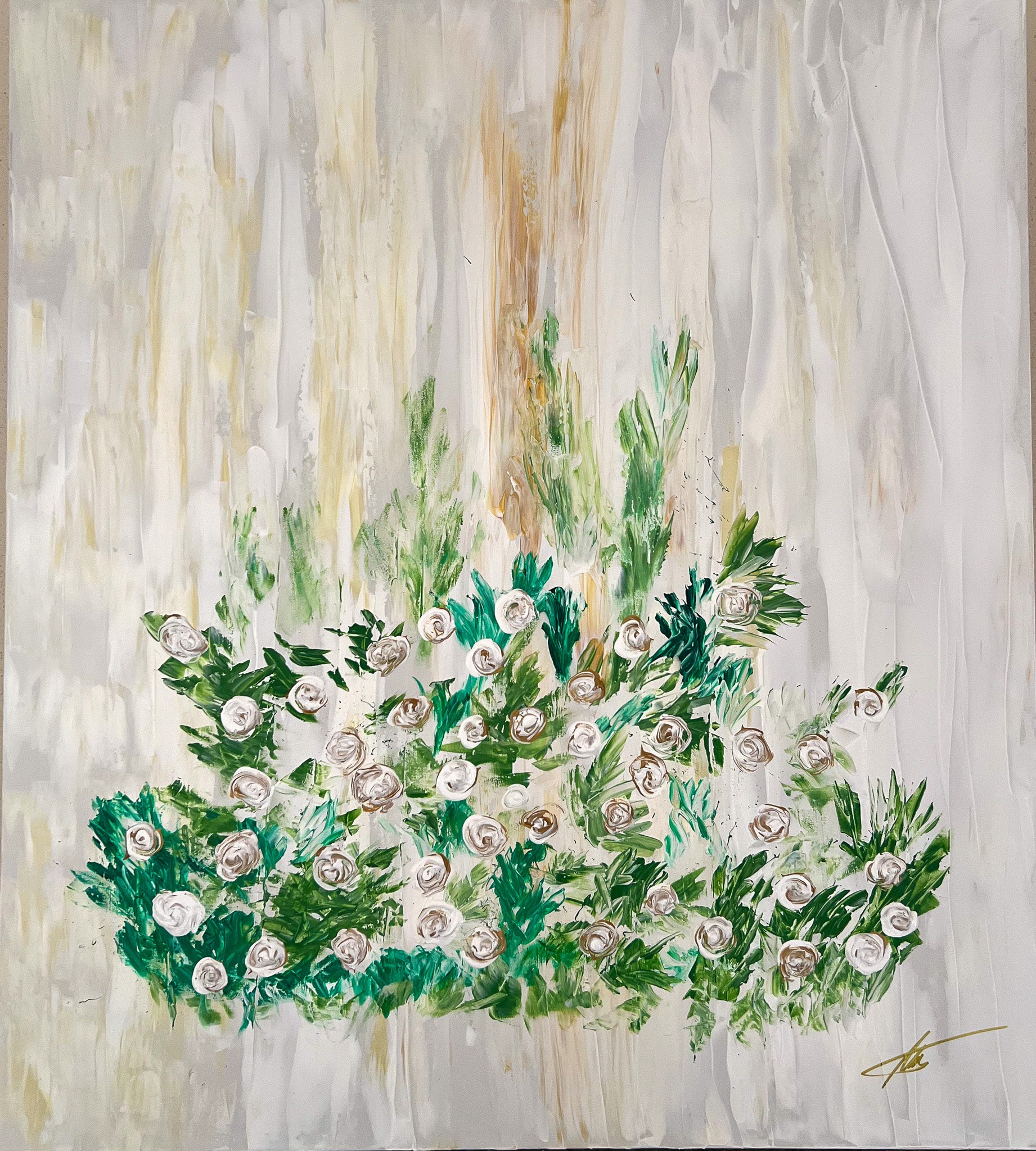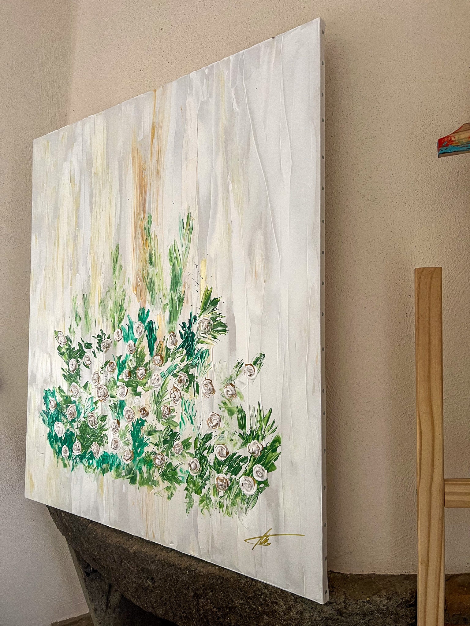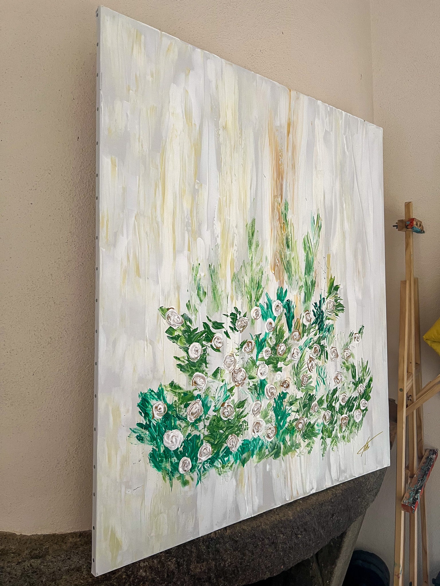 In this piece, I've poured my love for nature's resilience and beauty into every brushstroke. Captured here is a vibrant burst of rose bushes, their sturdy green leaves and delicate white blossoms surrounded by a serene backdrop. This artwork embodies the vitality and renewal that nature offers, destined to infuse your space with a calming yet invigorating energy.