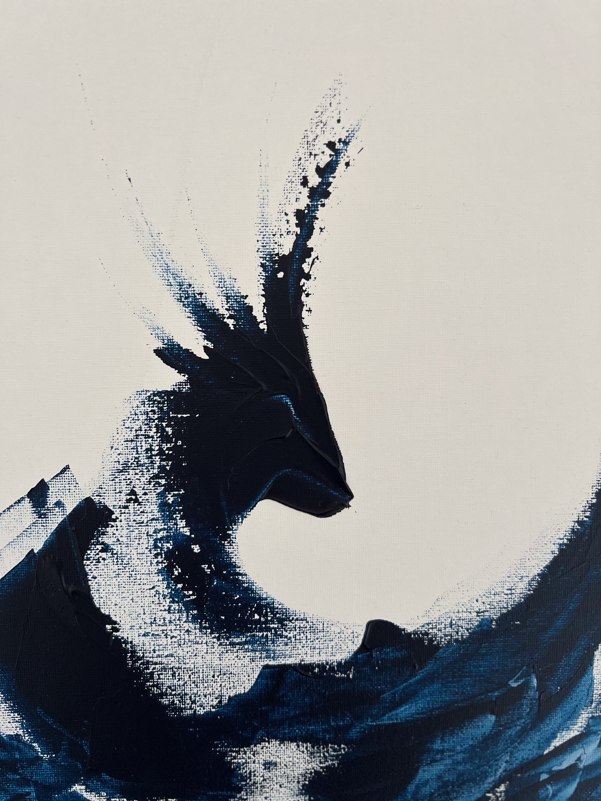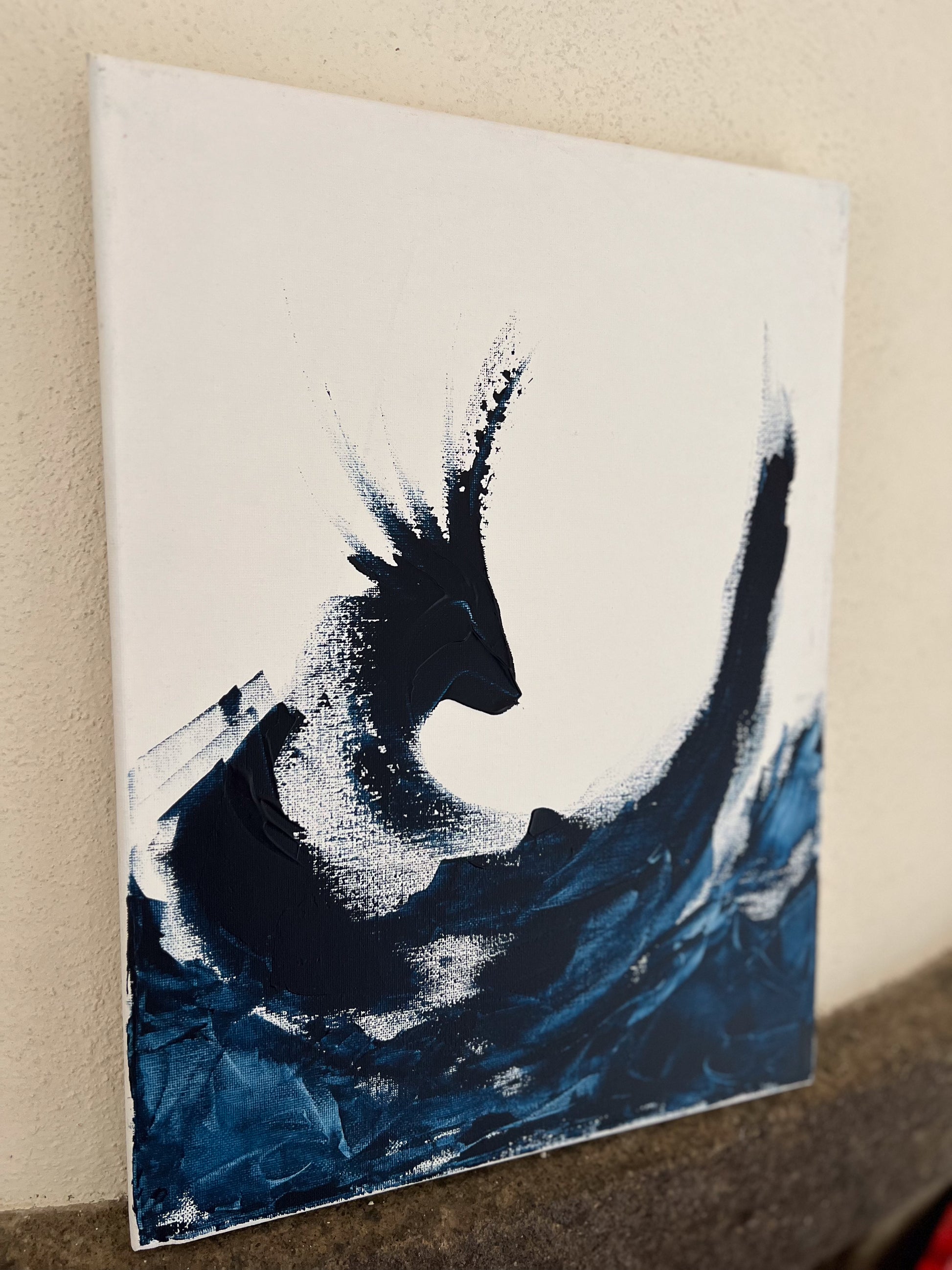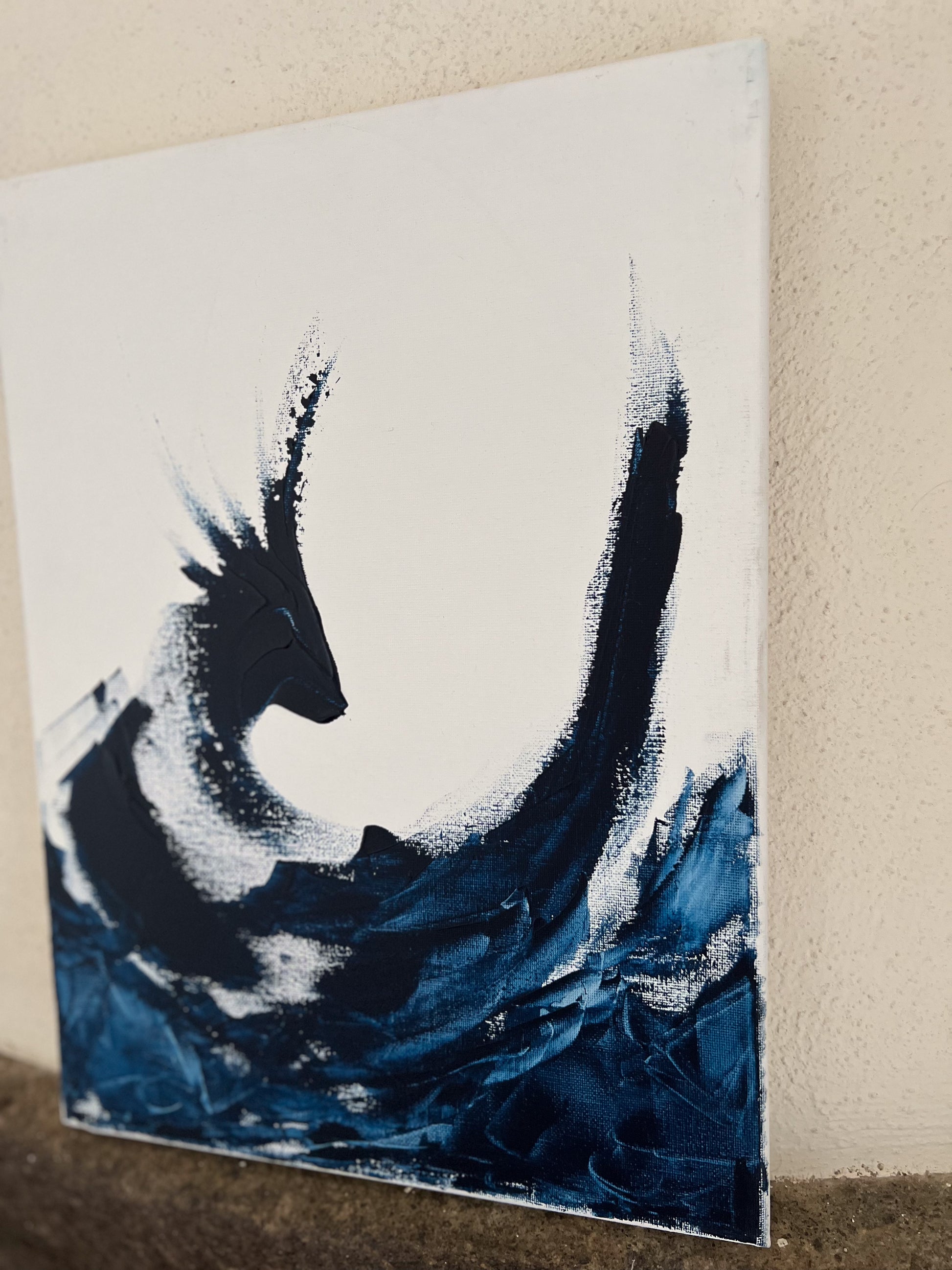 In this acrylic creation, I've channelled the depths of mystery and the unknown, conjuring an abstract vision that speaks to the sublime nature of the world beneath the waves. The stark contrast between the vast white and the rich blue hues evokes a sense of transcendence and introspection. Through minimalistic and symbolic strokes, I invite onlookers to dive into their imagination, to behold what might lurk in the metaphysical sea—an essence both majestic and formidable, bringing an electrifying energy into your space.