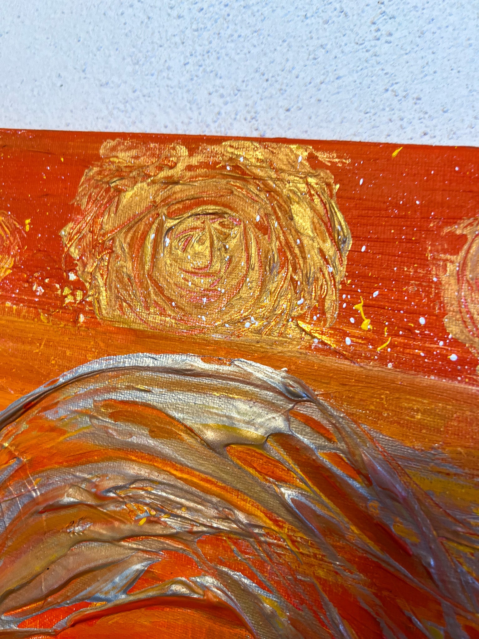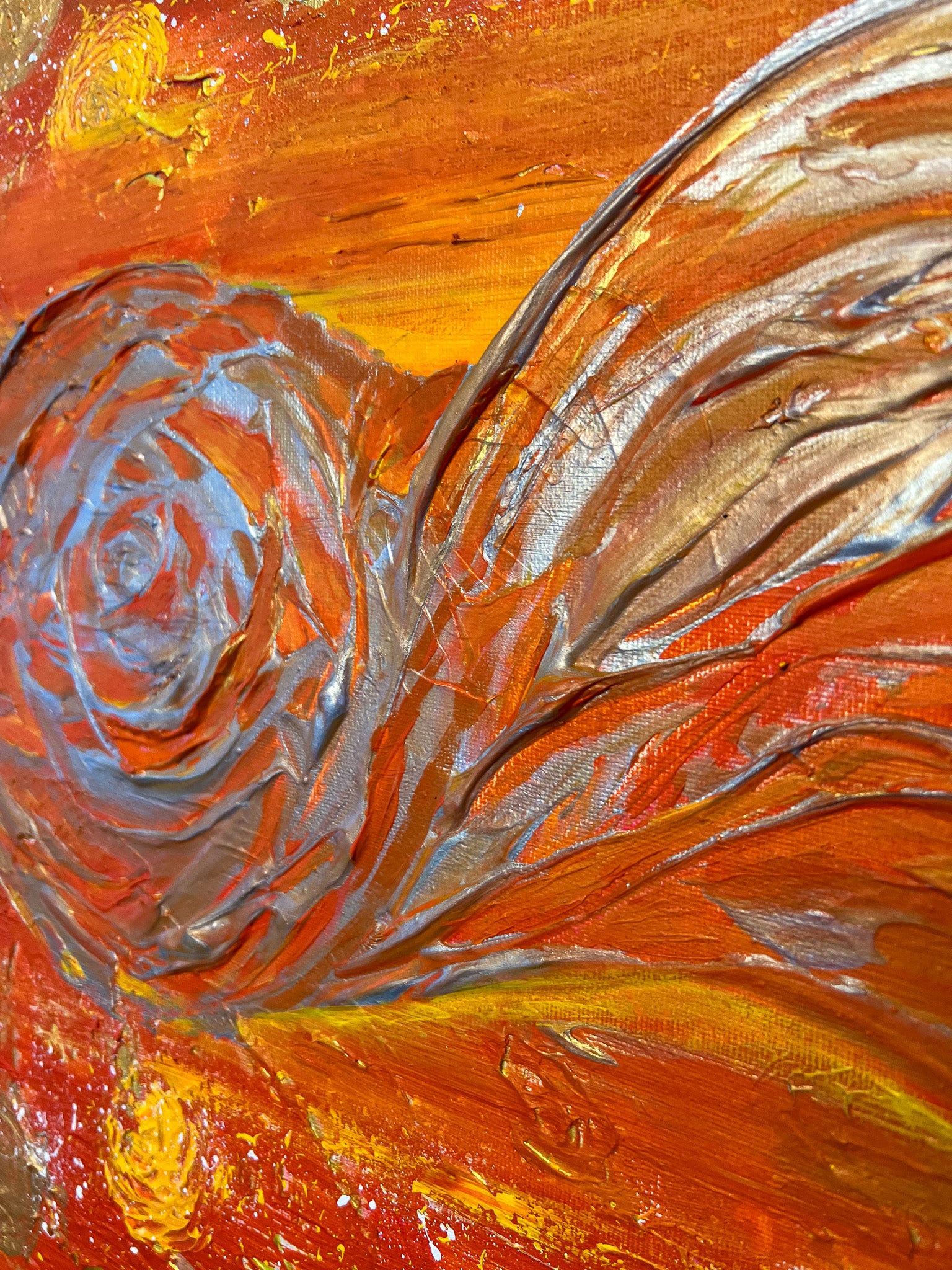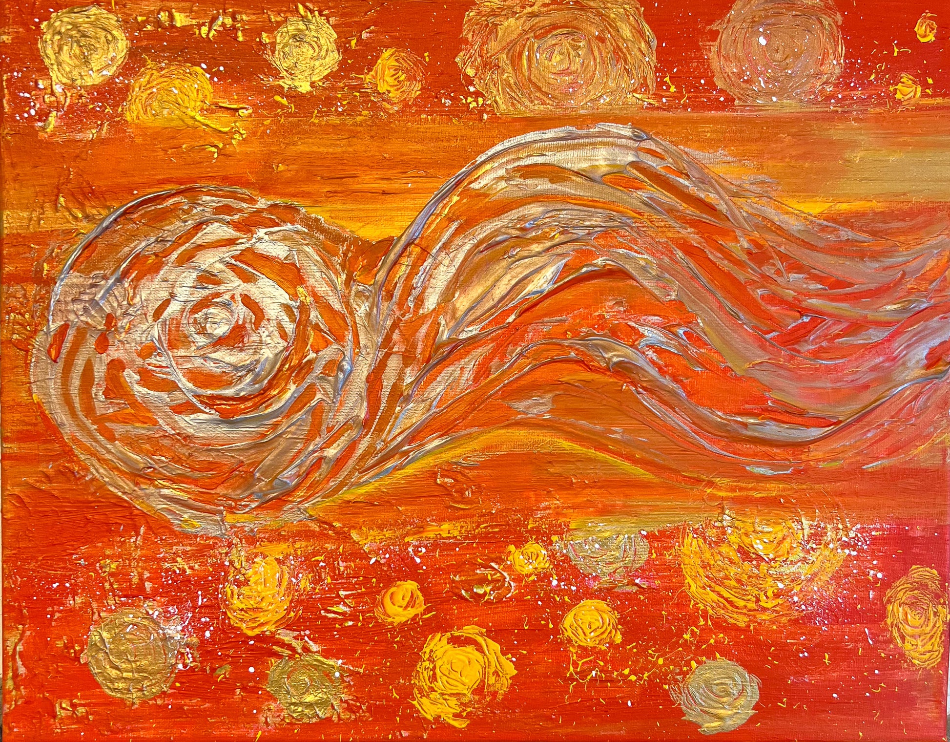 In this painting, I sought to embody the vibrant essence and dynamic motion that flowers can inspire within us. Using bold, fiery tones of red and orange, juxtaposed with sweeping, ethereal strokes of white and silver, I captured a scene that feels both rooted in the natural world and transcendent of it. My abstract expressionism approach here aims not just to depict the physical form of flowers, but to evoke their ephemeral and stirring impact on our senses and emotions. This piece serves as a powerful reminder of nature's beauty and its profound influence on human creativity and feeling.