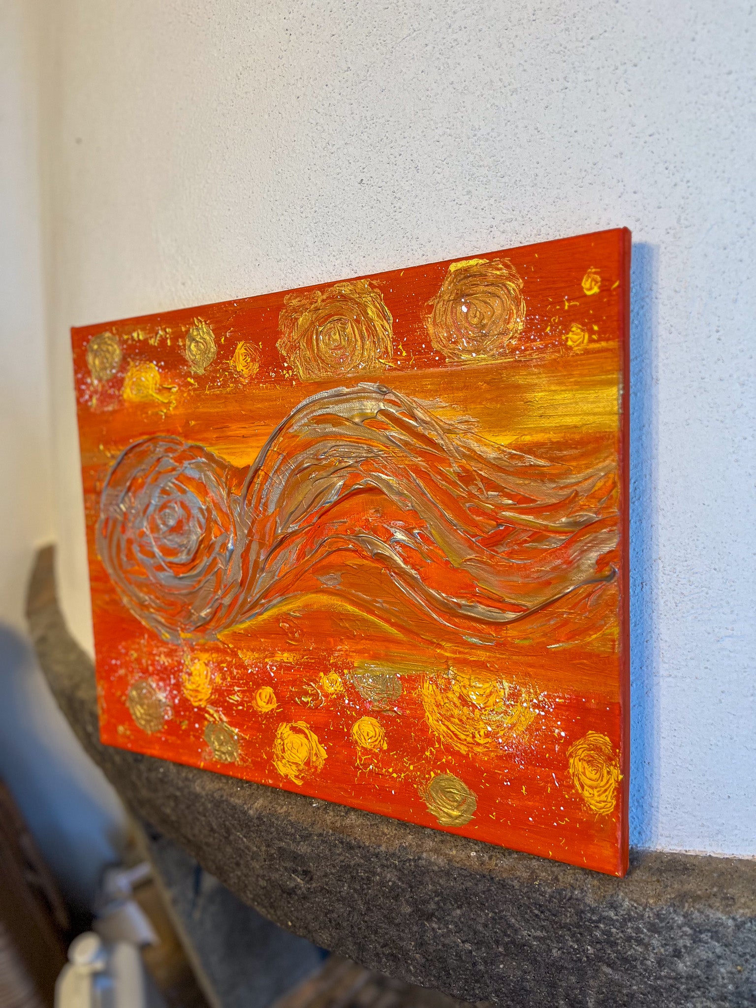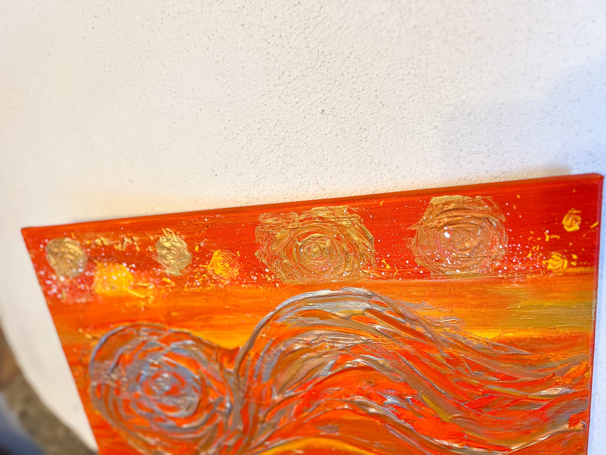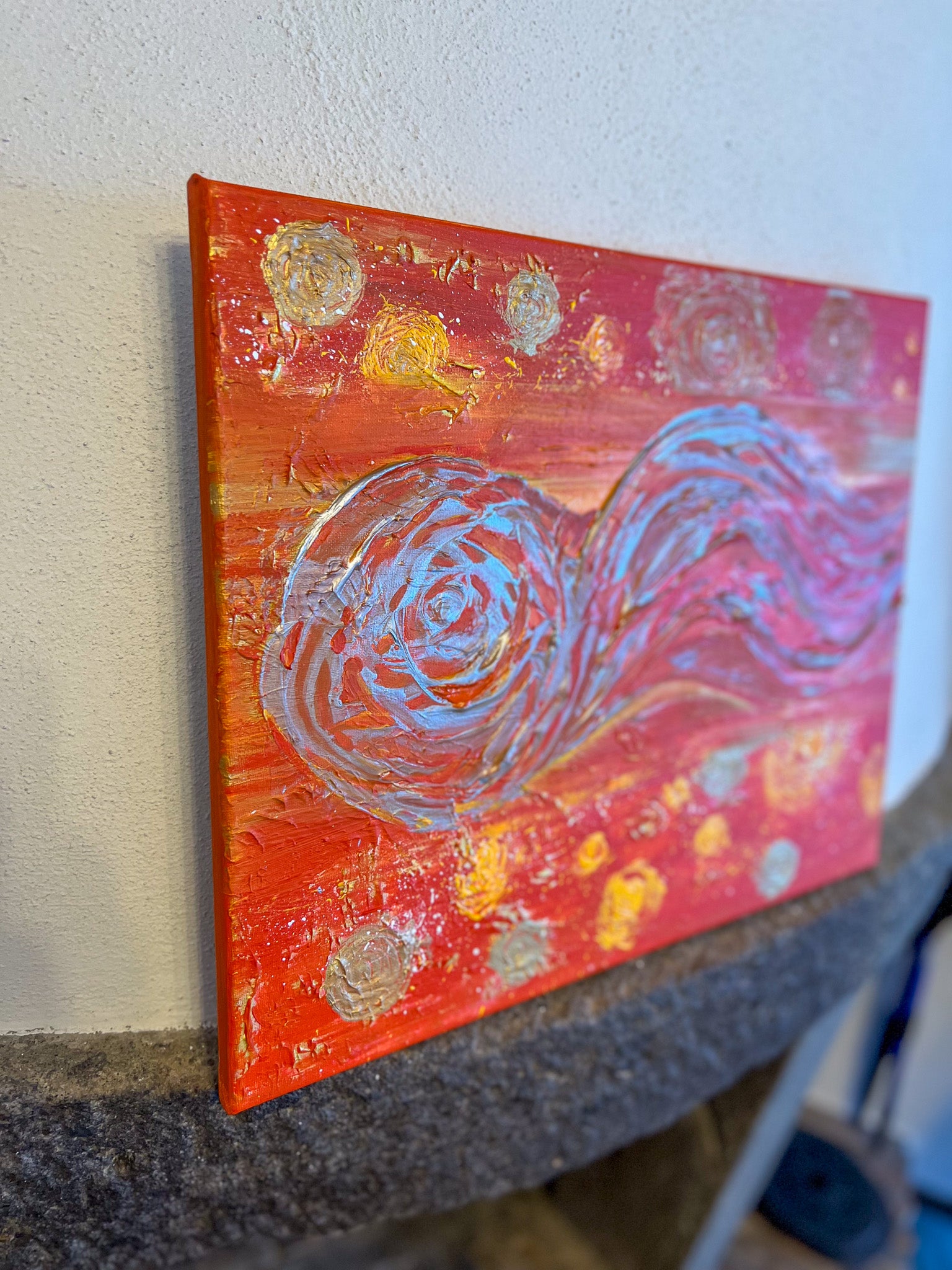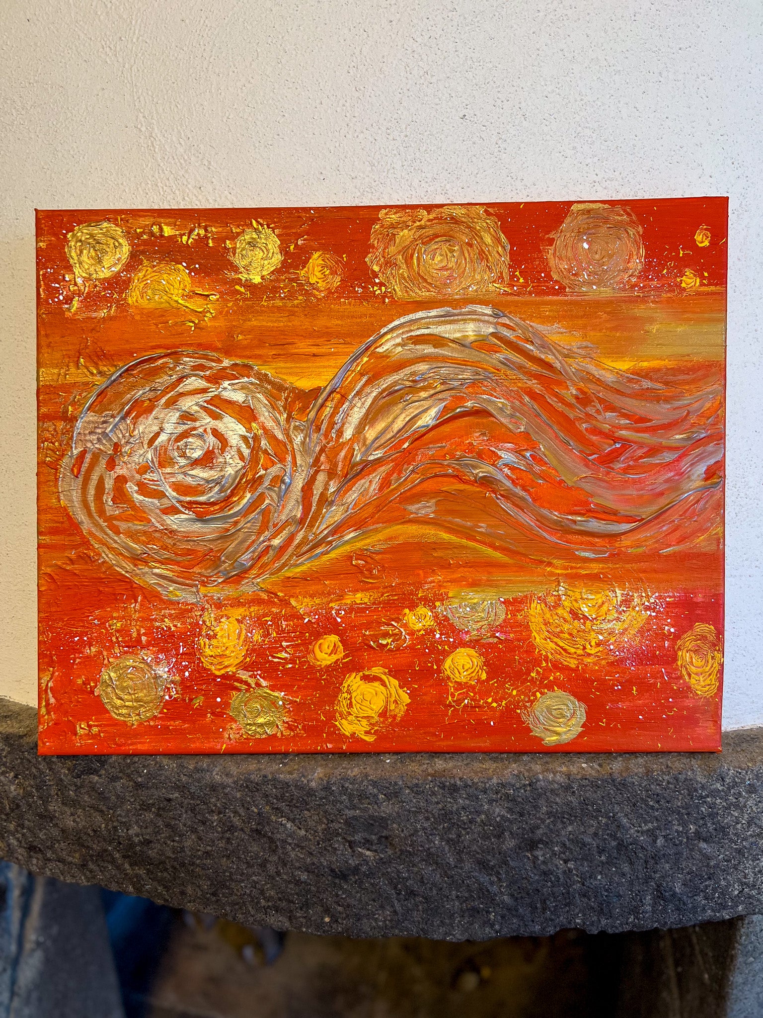 In this painting, I sought to embody the vibrant essence and dynamic motion that flowers can inspire within us. Using bold, fiery tones of red and orange, juxtaposed with sweeping, ethereal strokes of white and silver, I captured a scene that feels both rooted in the natural world and transcendent of it. My abstract expressionism approach here aims not just to depict the physical form of flowers, but to evoke their ephemeral and stirring impact on our senses and emotions. This piece serves as a powerful reminder of nature's beauty and its profound influence on human creativity and feeling.