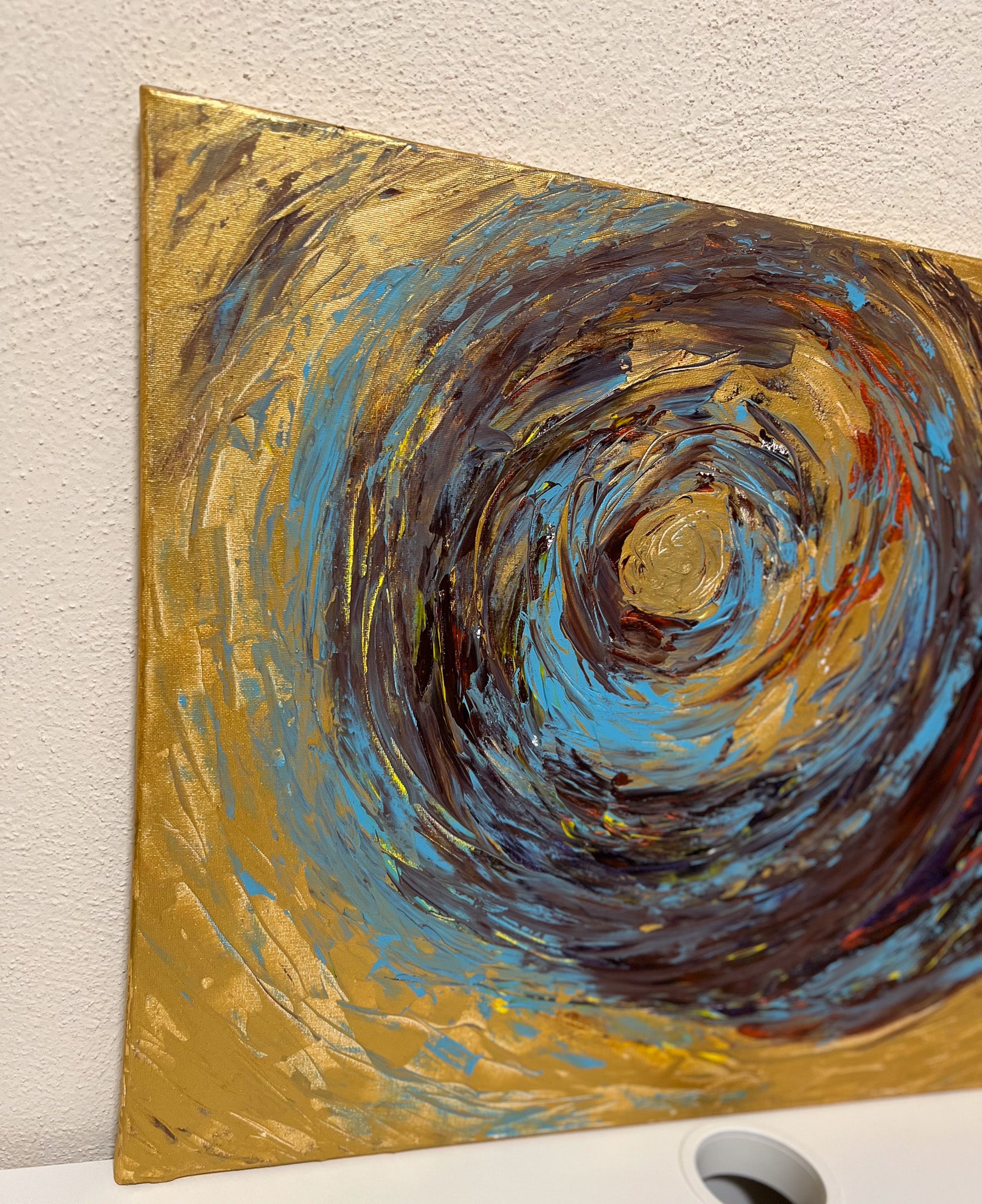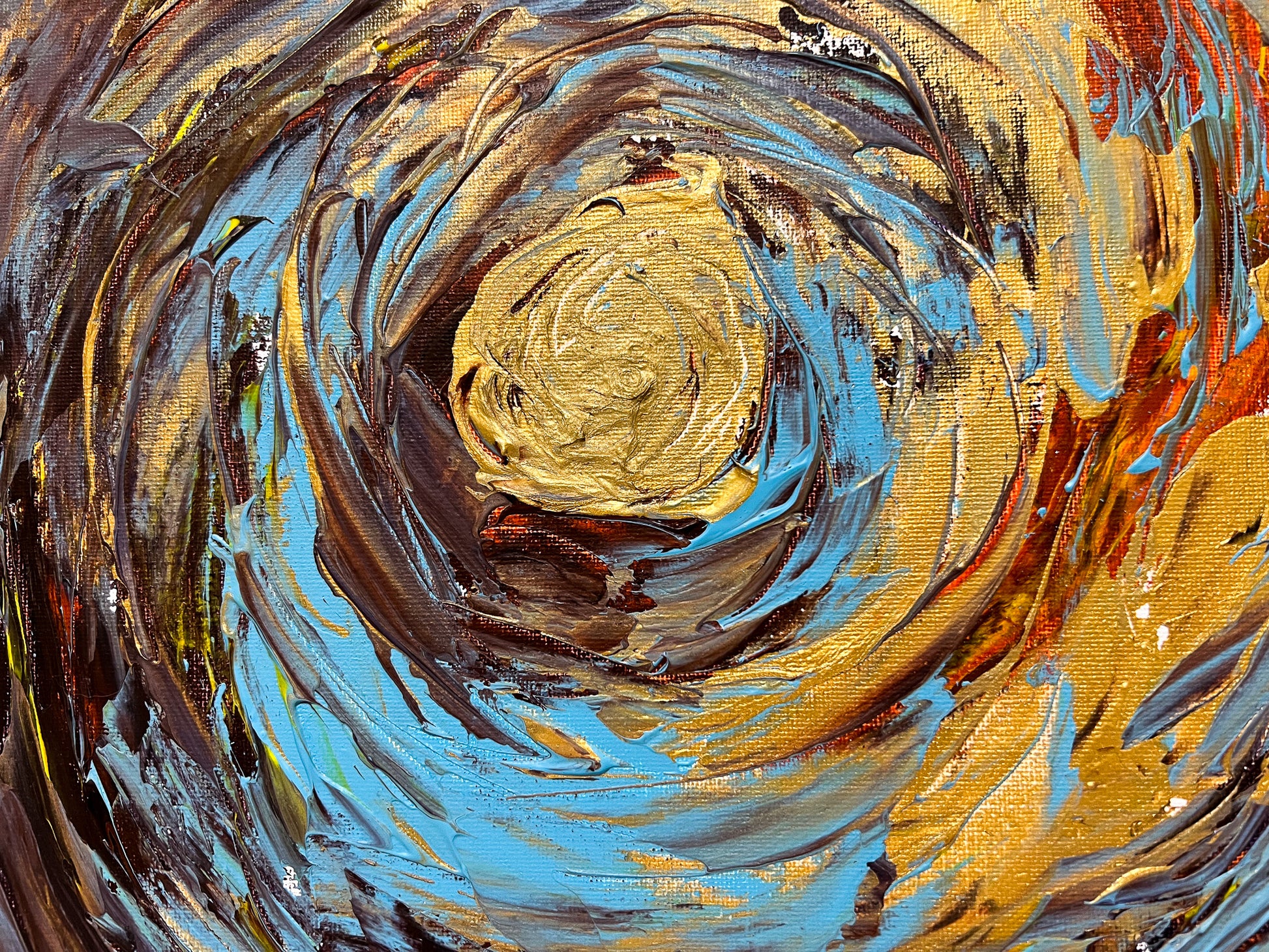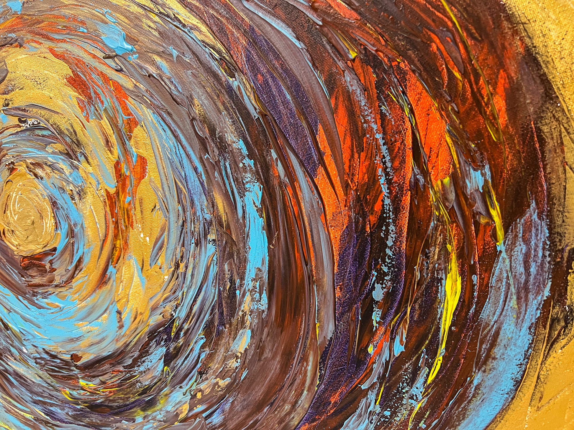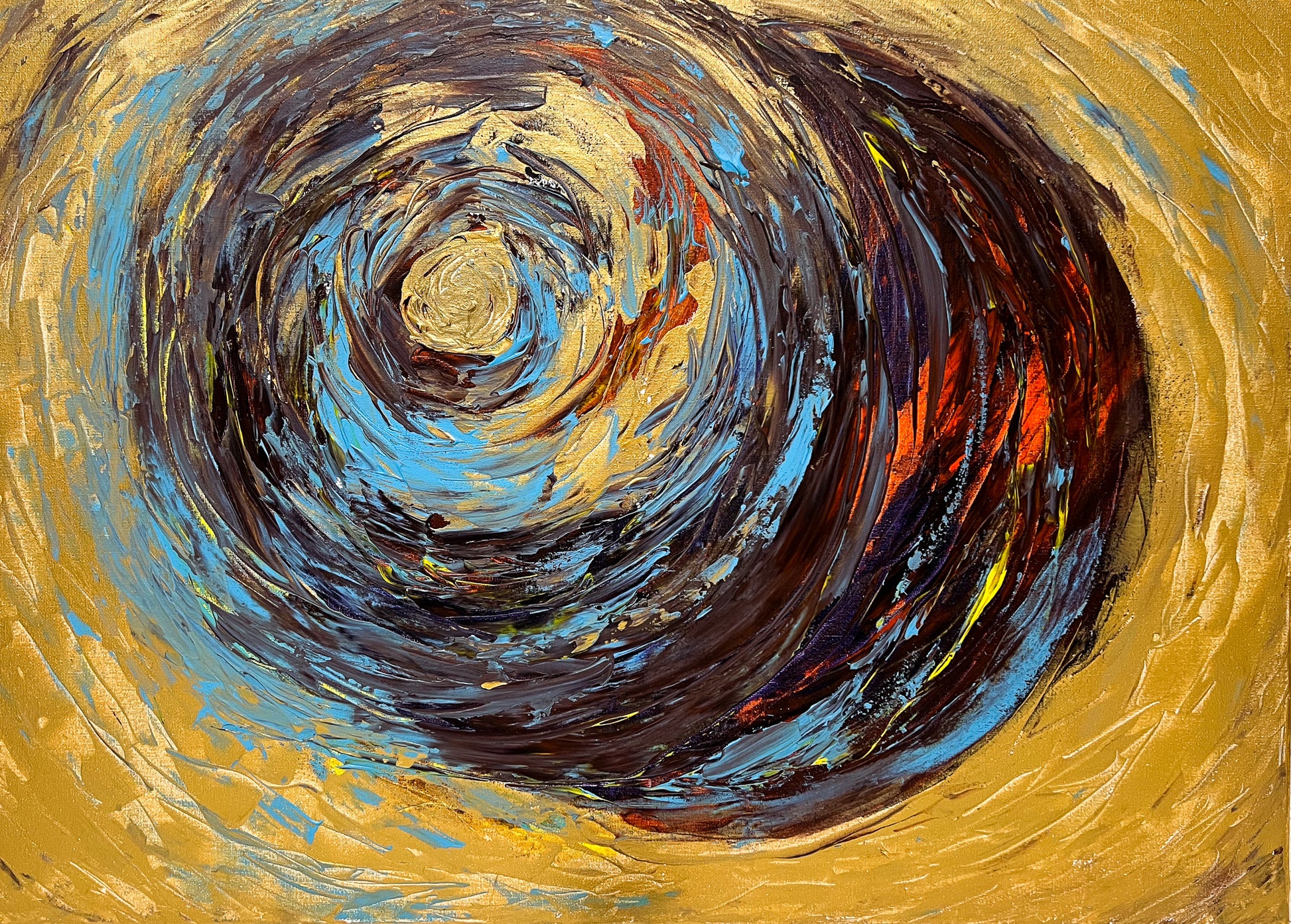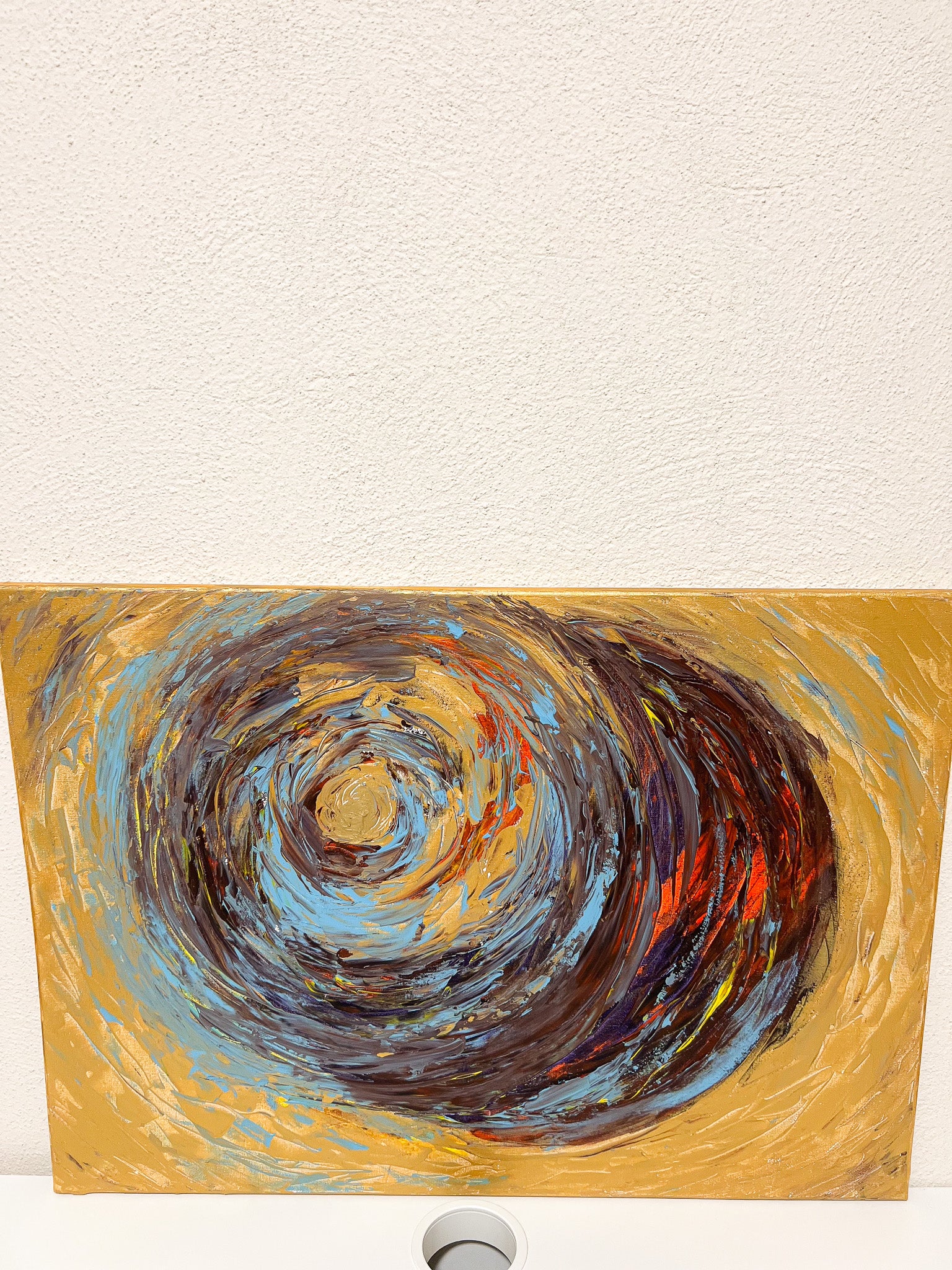 In this painting, I sought to capture the relentless motion of time, swirling around a center of calm. Using acrylics, I crafted vibrant, chaotic strokes in a whirlpool of blues and reds against a thoughtful beige background. The canvas speaks of energy and transformation, inviting viewers to reflect on the constancy of change and the tranquility at the core of the storm. This piece will infuse any space with a dynamic presence and a reminder of life's perpetual motion.