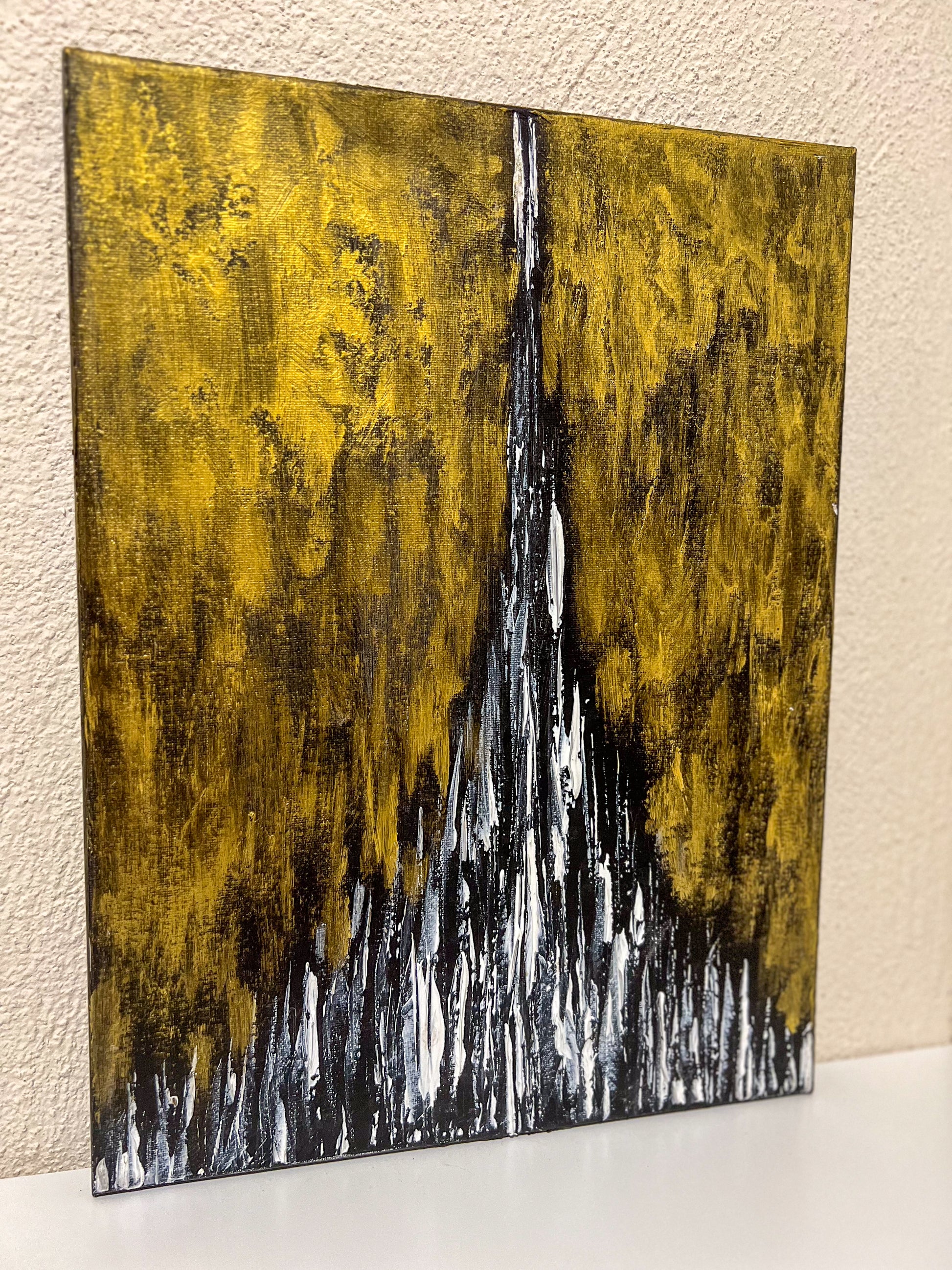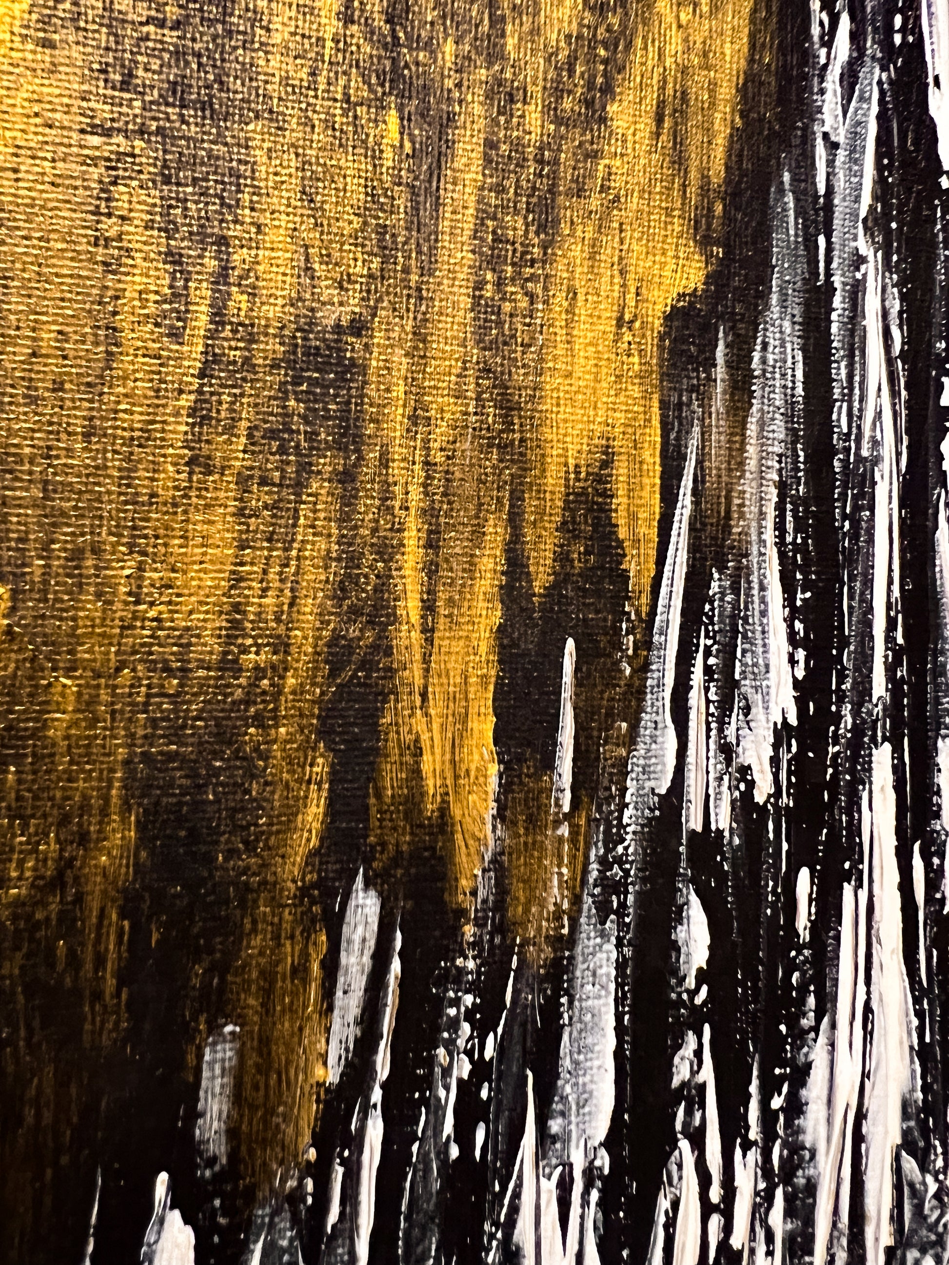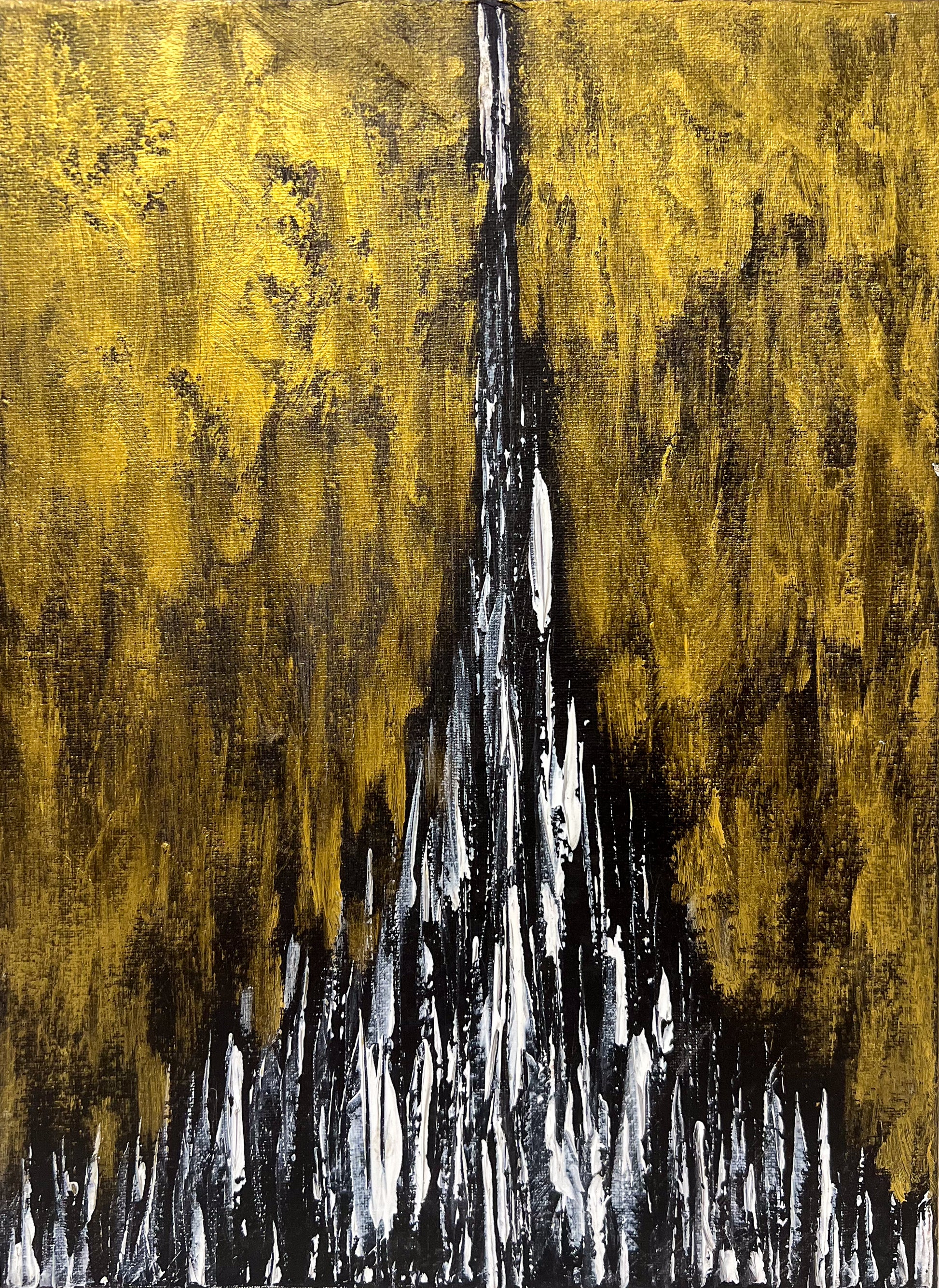 In creating this piece, I was driven by the contrast between aspirations and foundations. The striking ascent amidst the golden backdrop symbolizes the relentless pursuit of ambition. My minimalist approach aims to capture the raw emotion behind human endeavors, rendered in acrylic for its bold and emotive possibilities. This work invites contemplation on our own quests, and will infuse any space with the energy of striving and reflection.