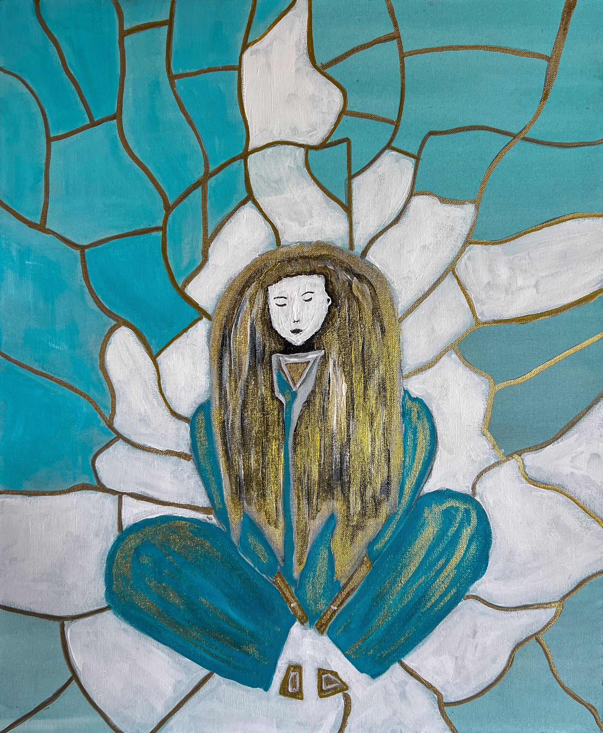 "Tranquility" is a deeply symbolic painting that explores the balance between inner serenity and the fragmented nature of the world around us. A meditative figure, depicted with a calm, expressionless face, sits in a lotus position—embraced by the petals of a blooming white lotus. The background, with its gold-lined, stained-glass-like fragments, symbolizes the complexity of life’s experiences, while the figure remains centered and still, embodying mindfulness and spiritual harmony.