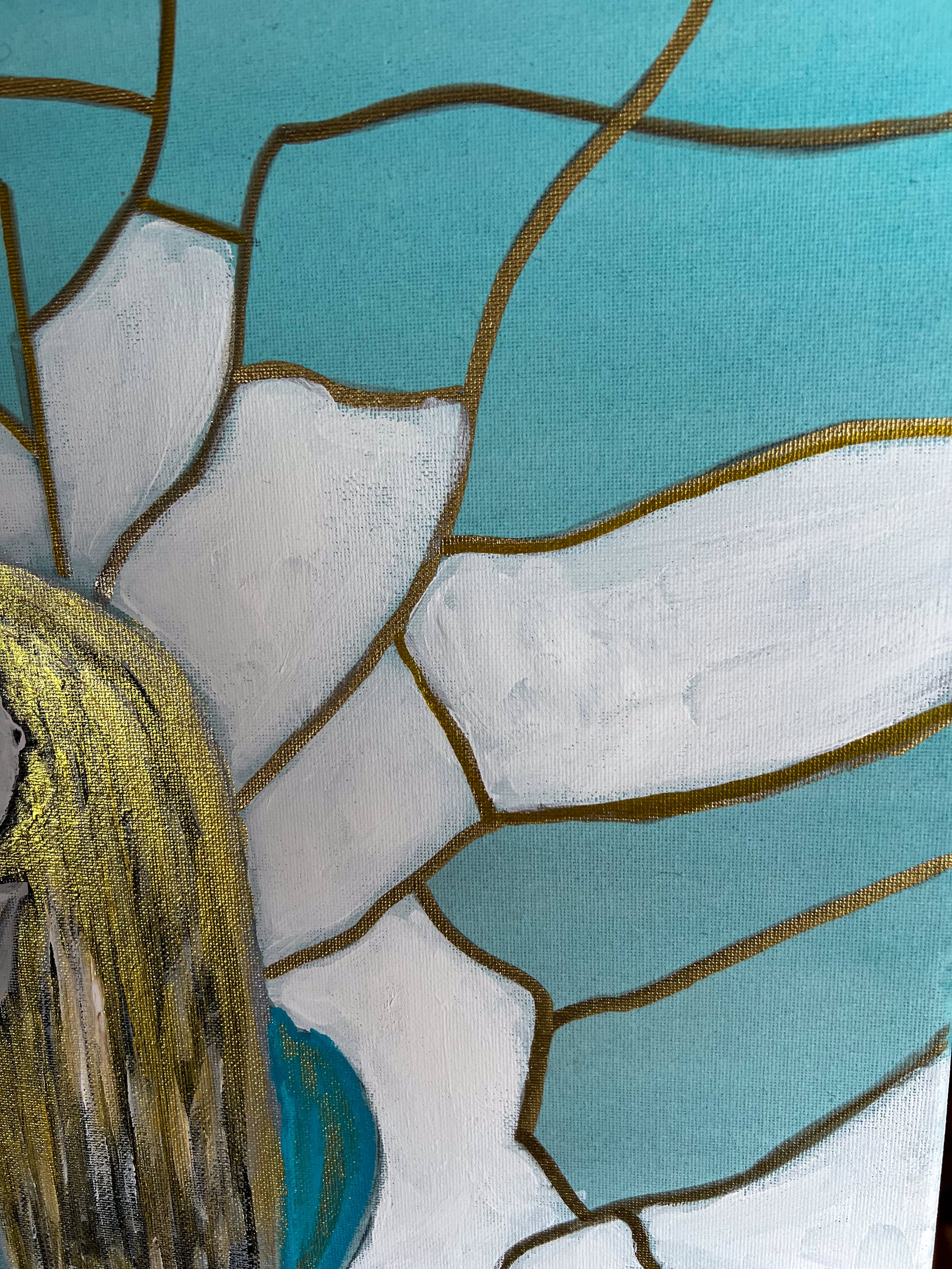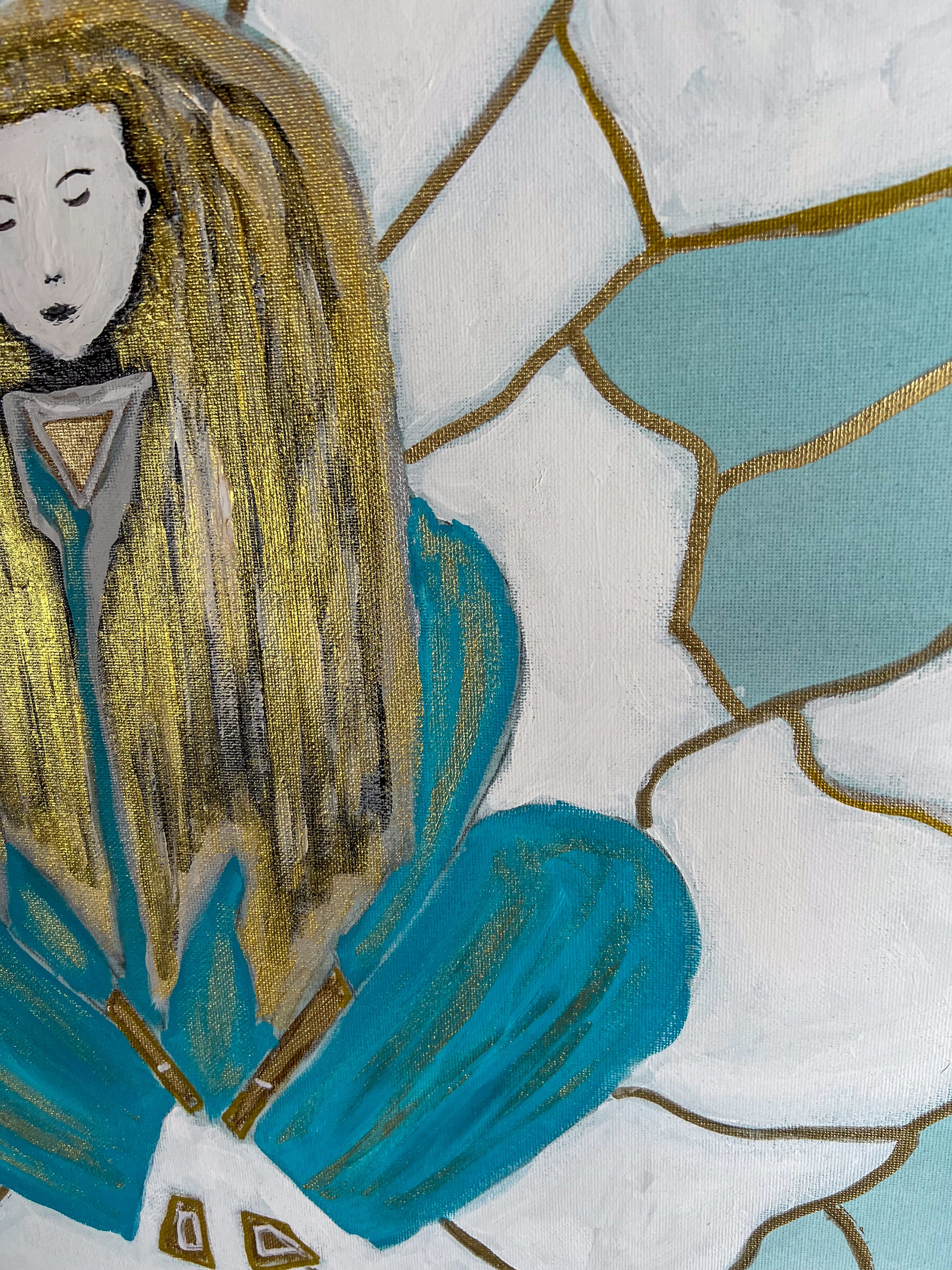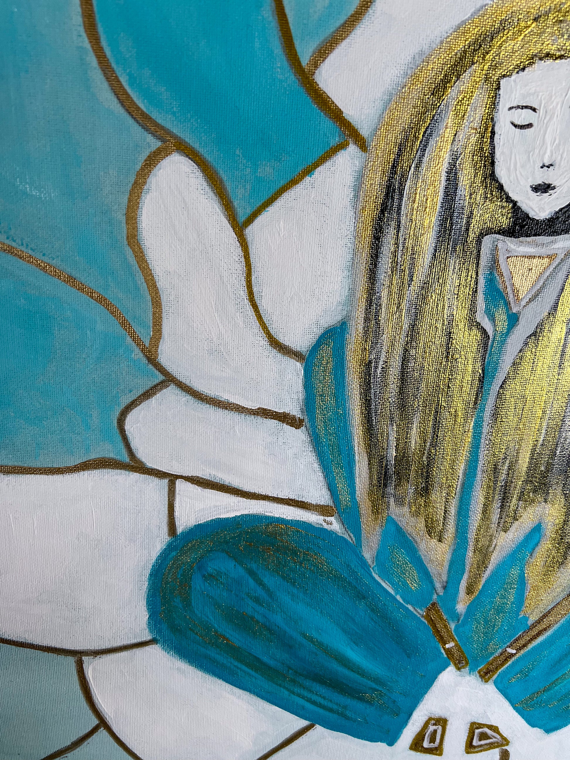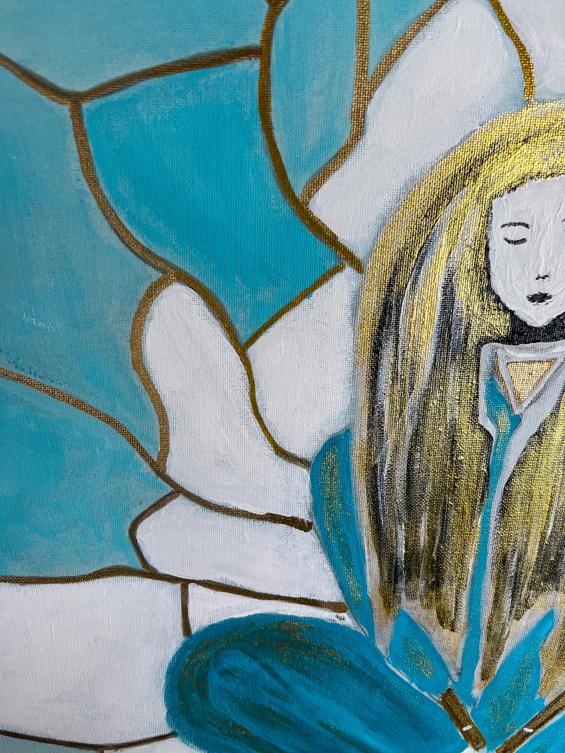 "Tranquility" invites viewers to pause, reflect, and connect with their own sense of inner peace. The harmonious teal and white color palette, accented with gold, creates a soothing, meditative atmosphere. Whether it evokes a feeling of calm, self-reflection, or spiritual curiosity, this painting serves as a reminder that tranquility is found within.