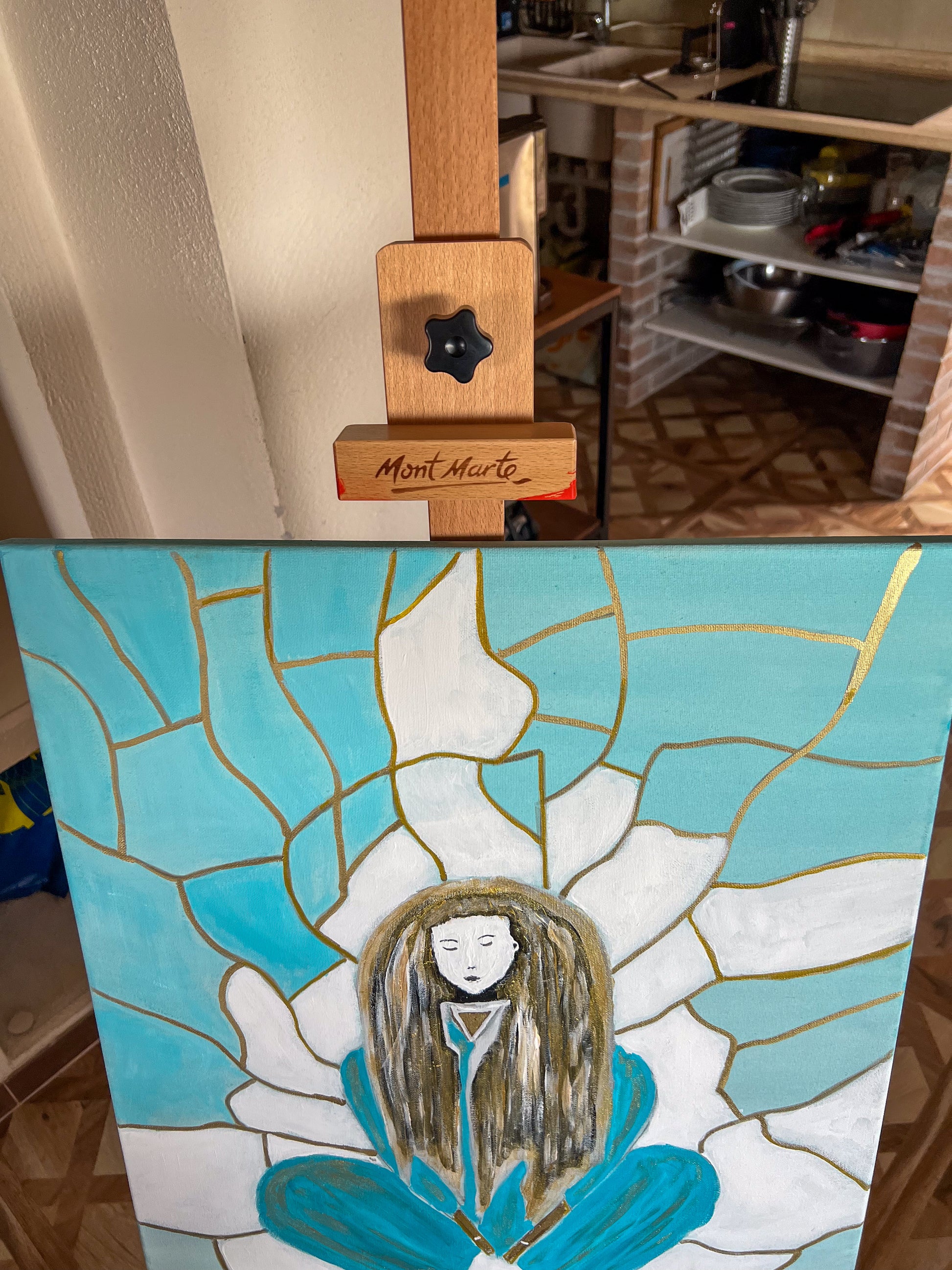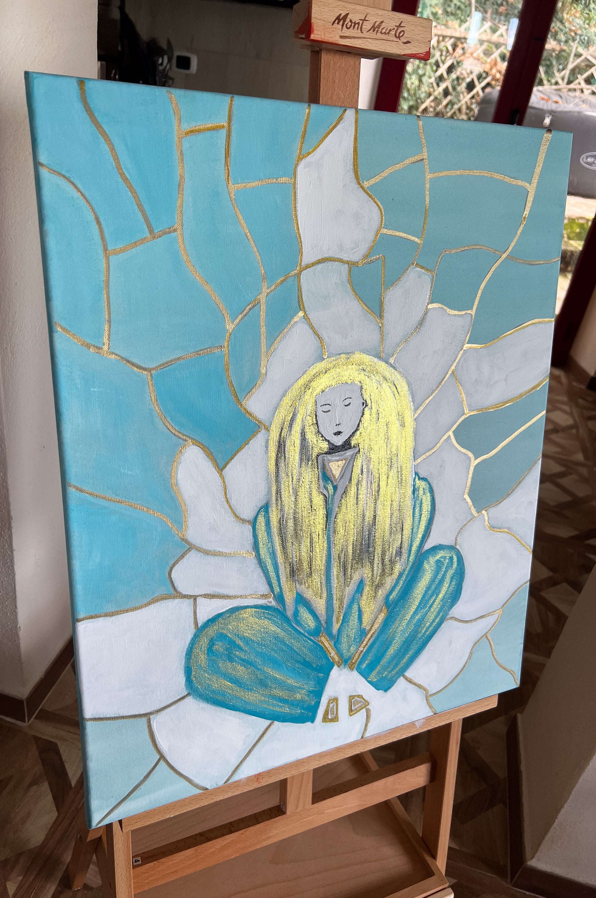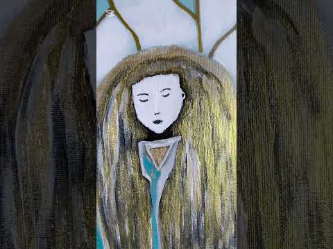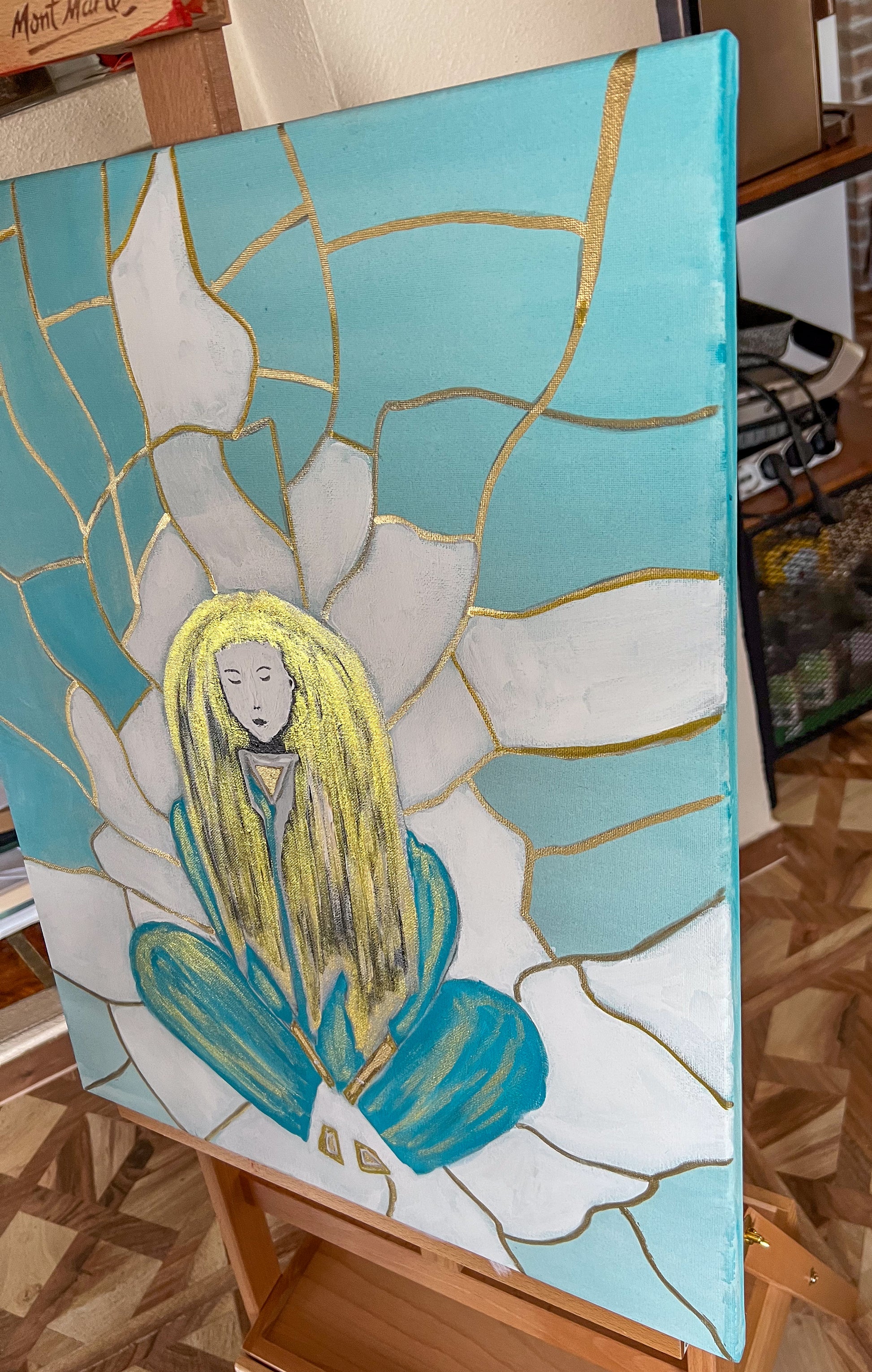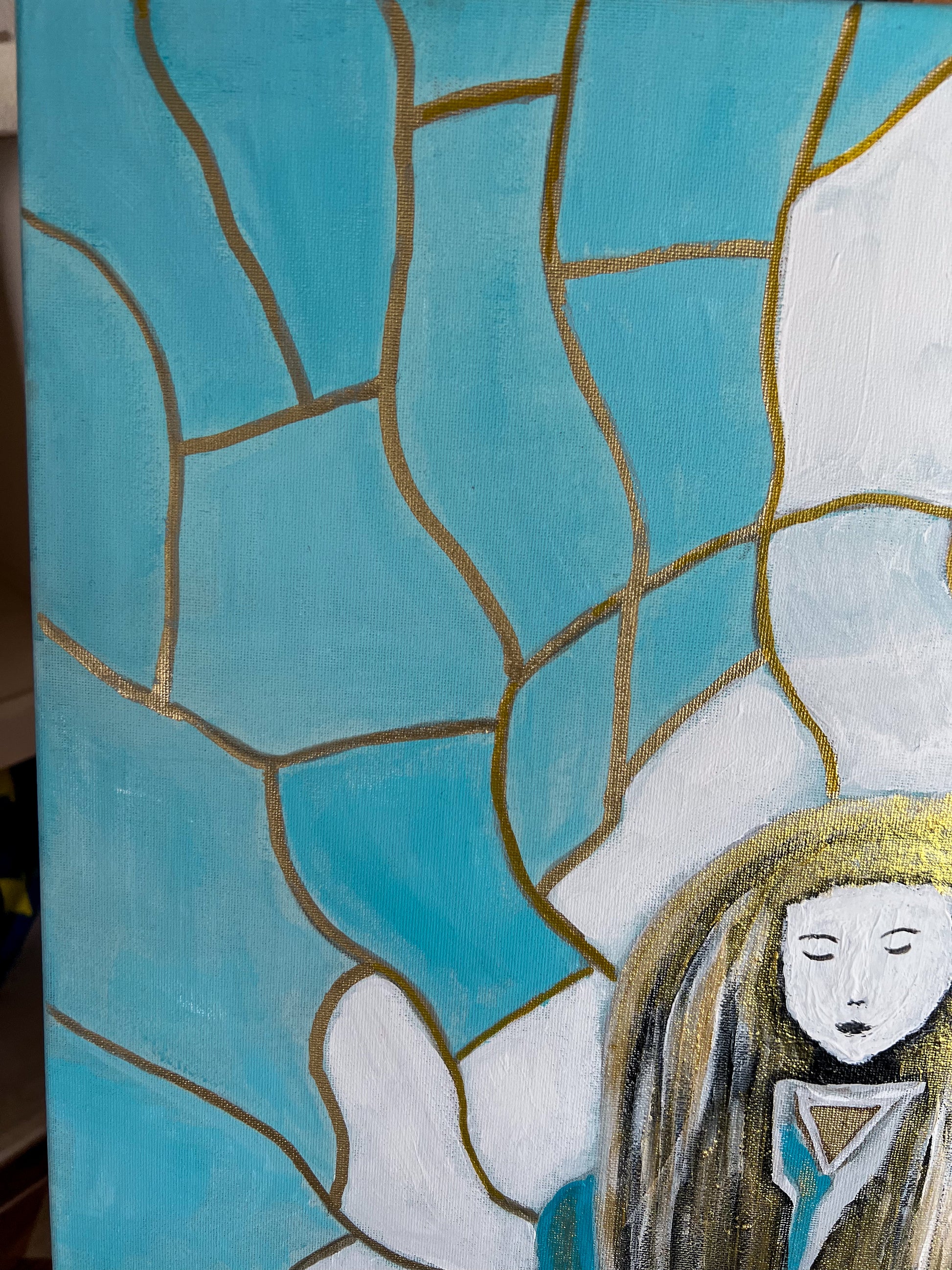 "Tranquility" invites viewers to pause, reflect, and connect with their own sense of inner peace. The harmonious teal and white color palette, accented with gold, creates a soothing, meditative atmosphere. Whether it evokes a feeling of calm, self-reflection, or spiritual curiosity, this painting serves as a reminder that tranquility is found within.