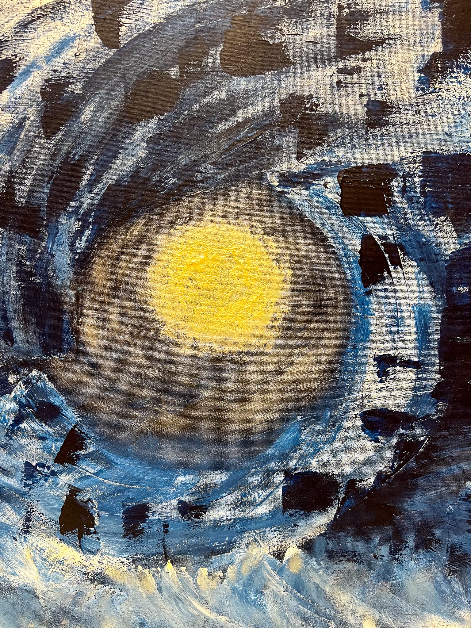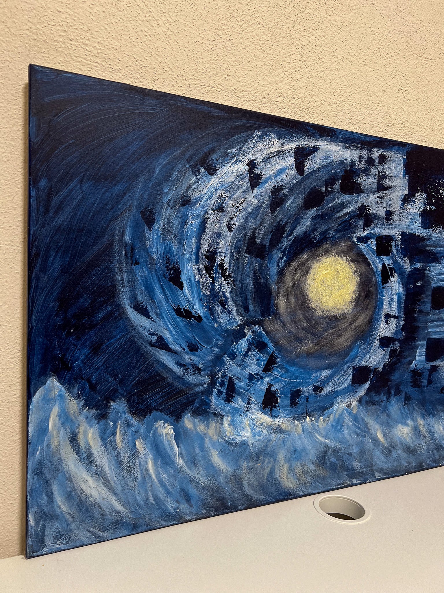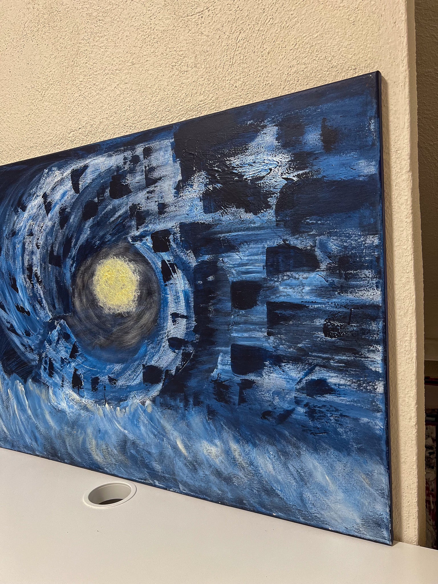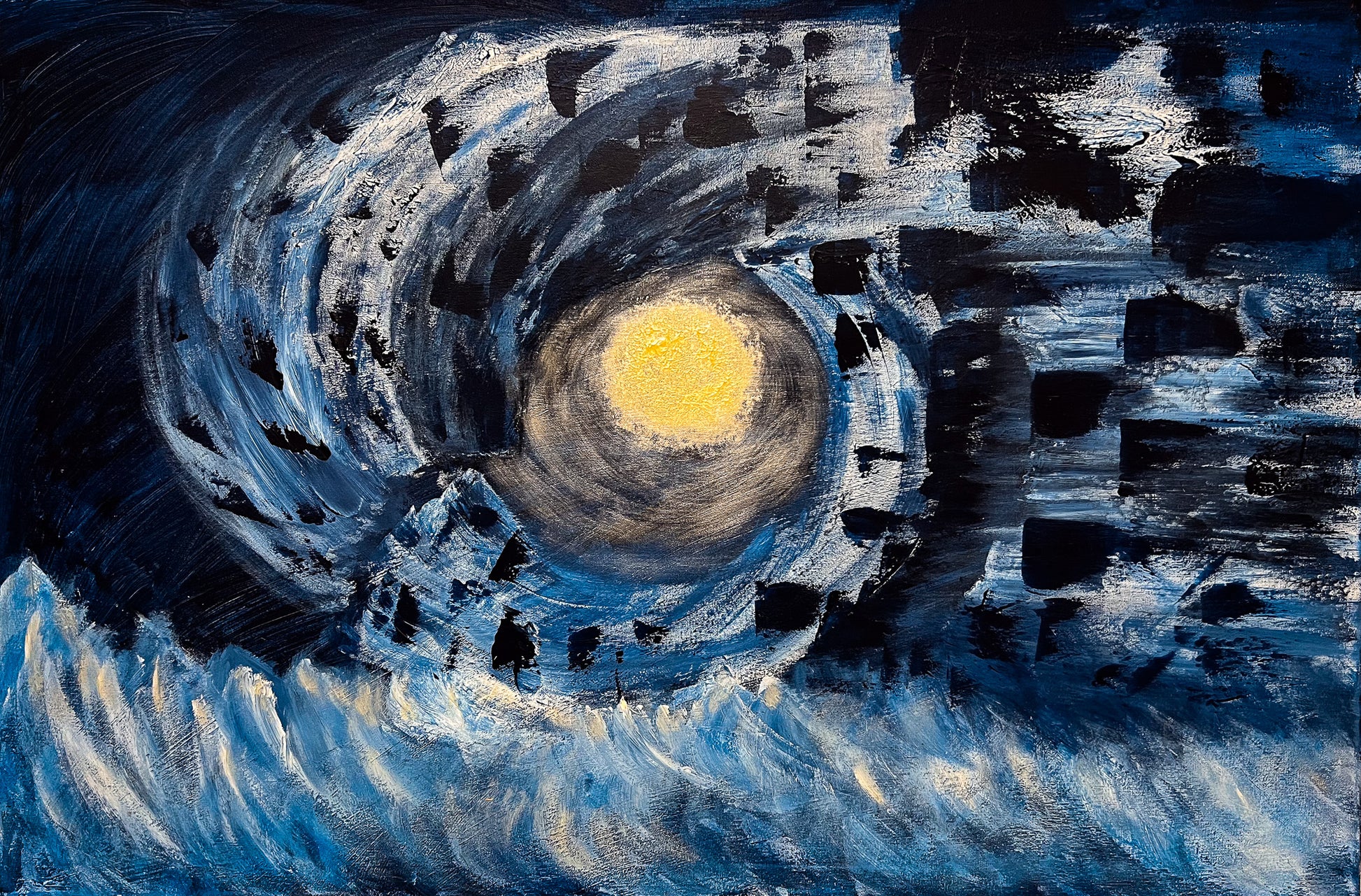 In this piece, I melded the mysteries of the cosmos with the depths of the ocean, capturing a fusion of space and sea. Through robust swirls and dynamic textures, I evoke a sense of whirlpool-like motion—an interplay between the celestial and the aquatic. My passion for the unknown is channeled into this canvas, inviting the observer into a contemplative journey through the abstract and the futuristic. It's designed to bring an invigorating energy and a touch of the profound into any living space.