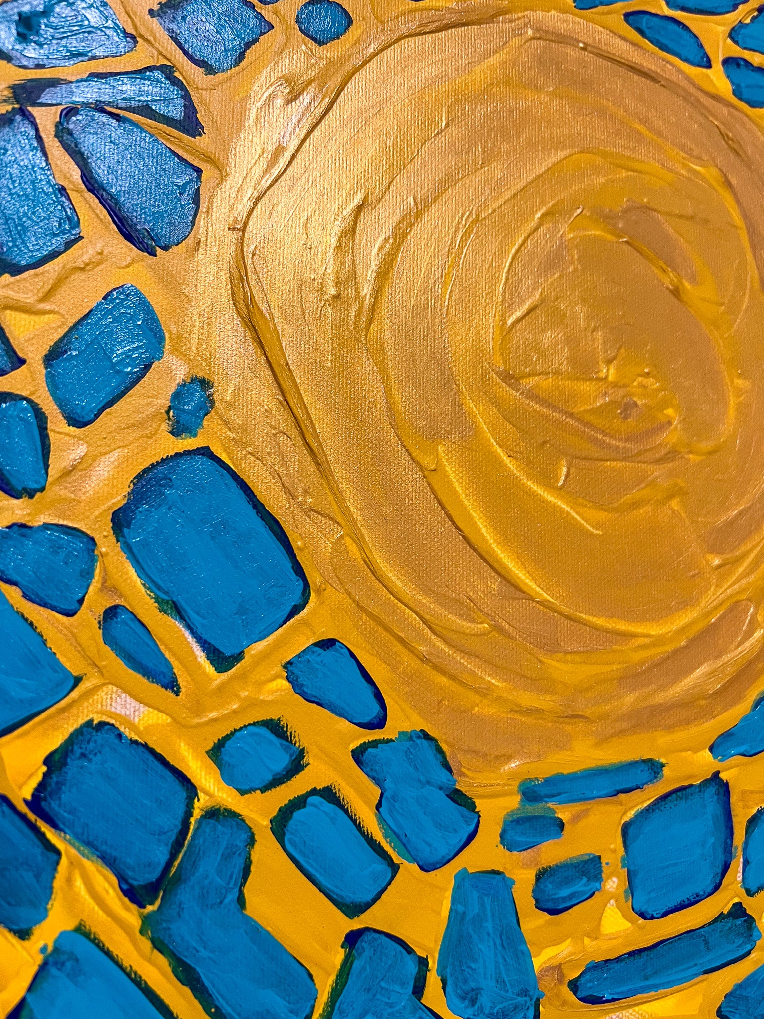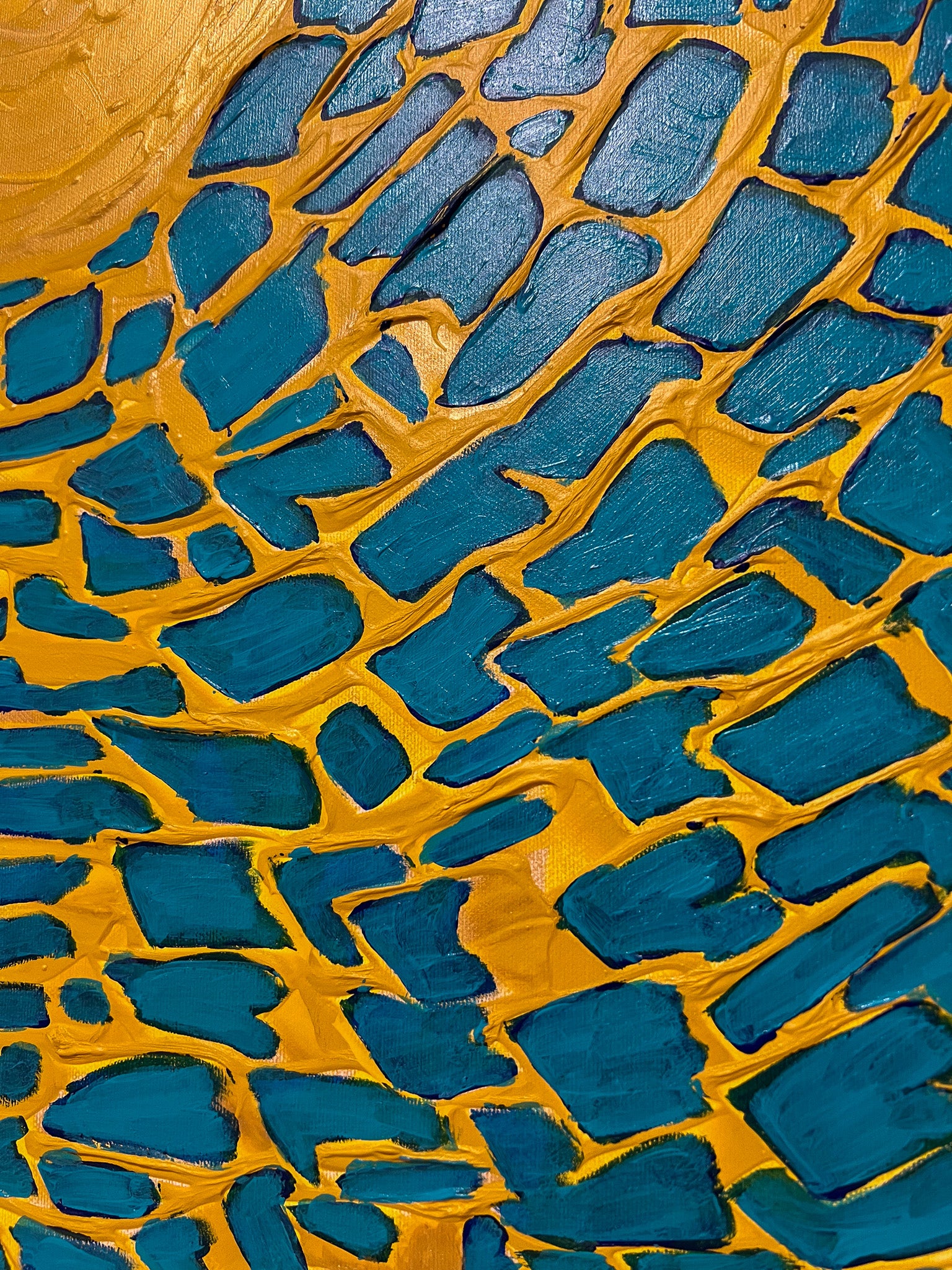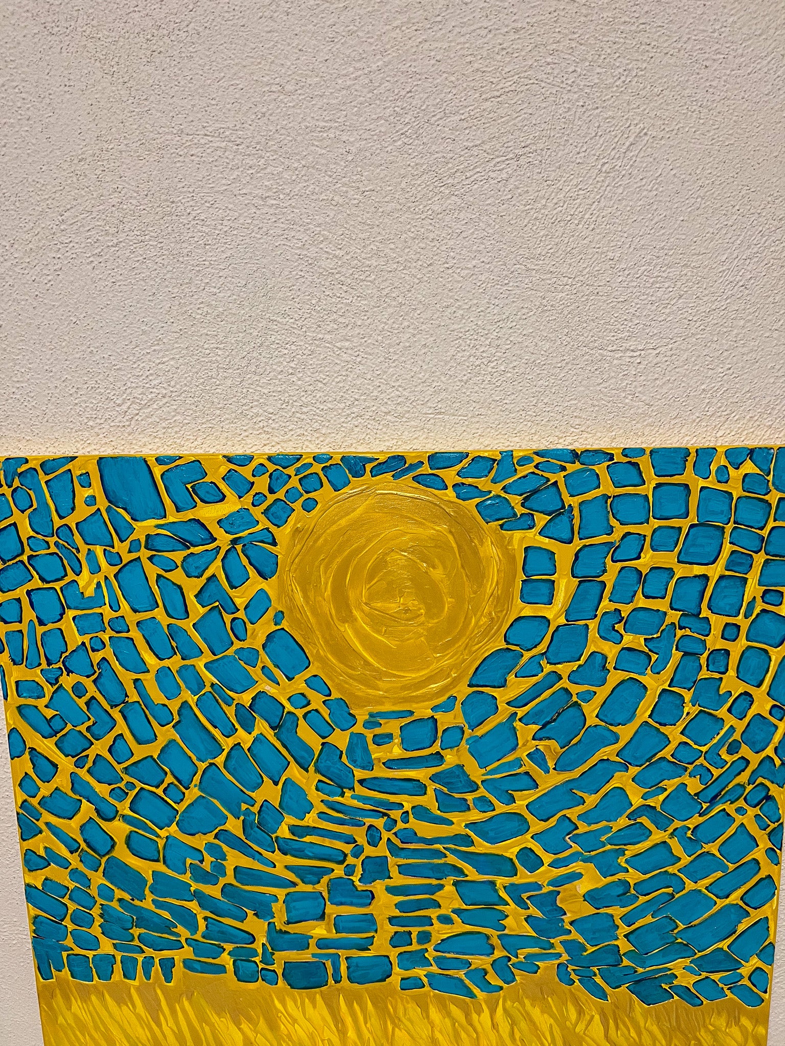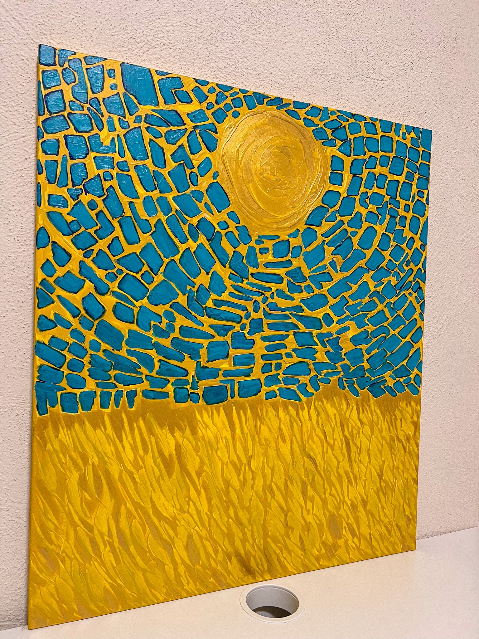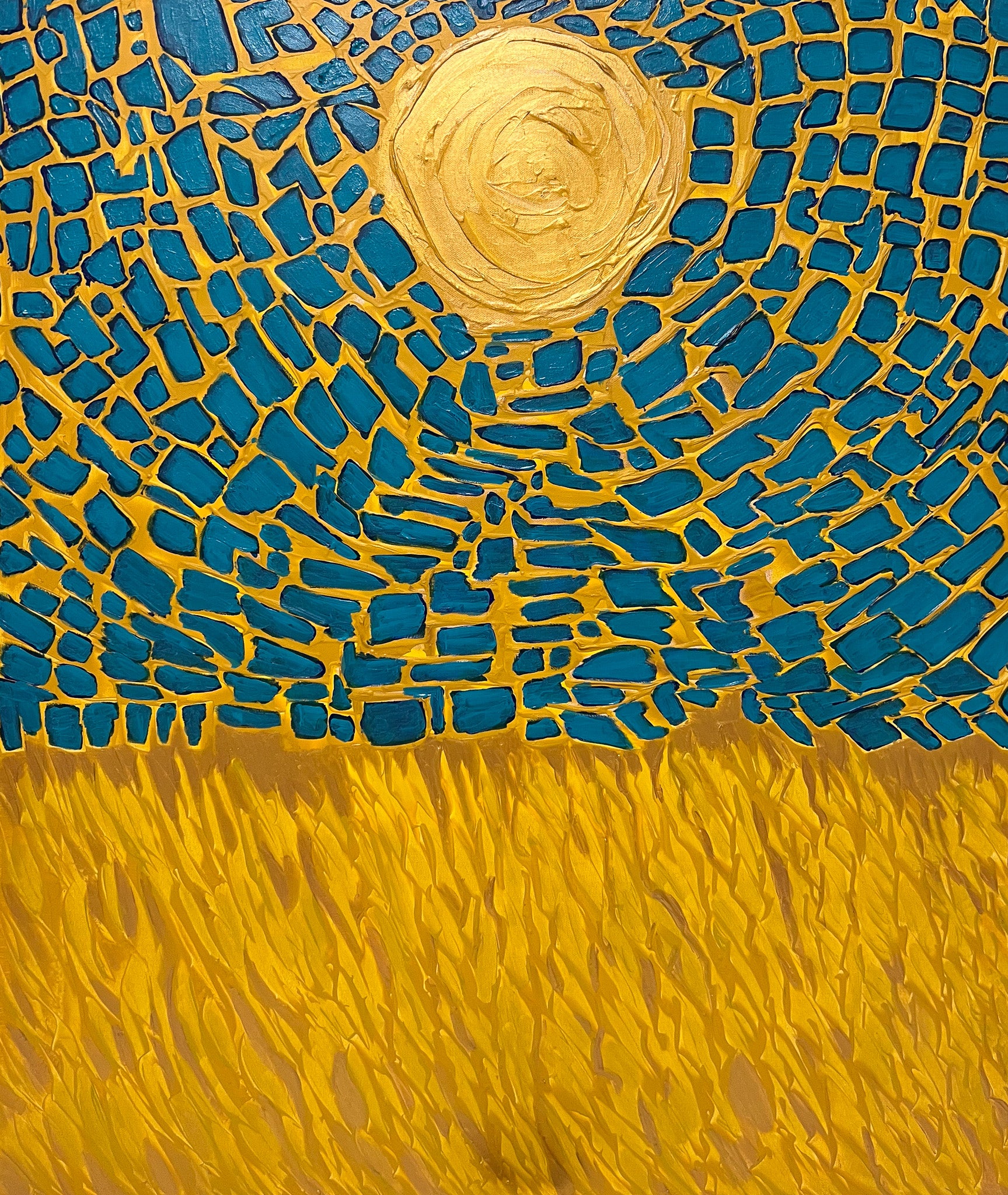 In my painting, I explore the dynamic interplay of light and nature through abstract cubism. The top portion, in vivid blues, fractures the circular form of the sun into myriad tessellating shapes, representing the complex yet harmonious nature of our universe. Below, the golden hues mimic a wind-swept field, suggesting movement and the passage of time. This piece invites viewers to feel a sense of optimism and the infinite possibilities a new day brings to our homes.